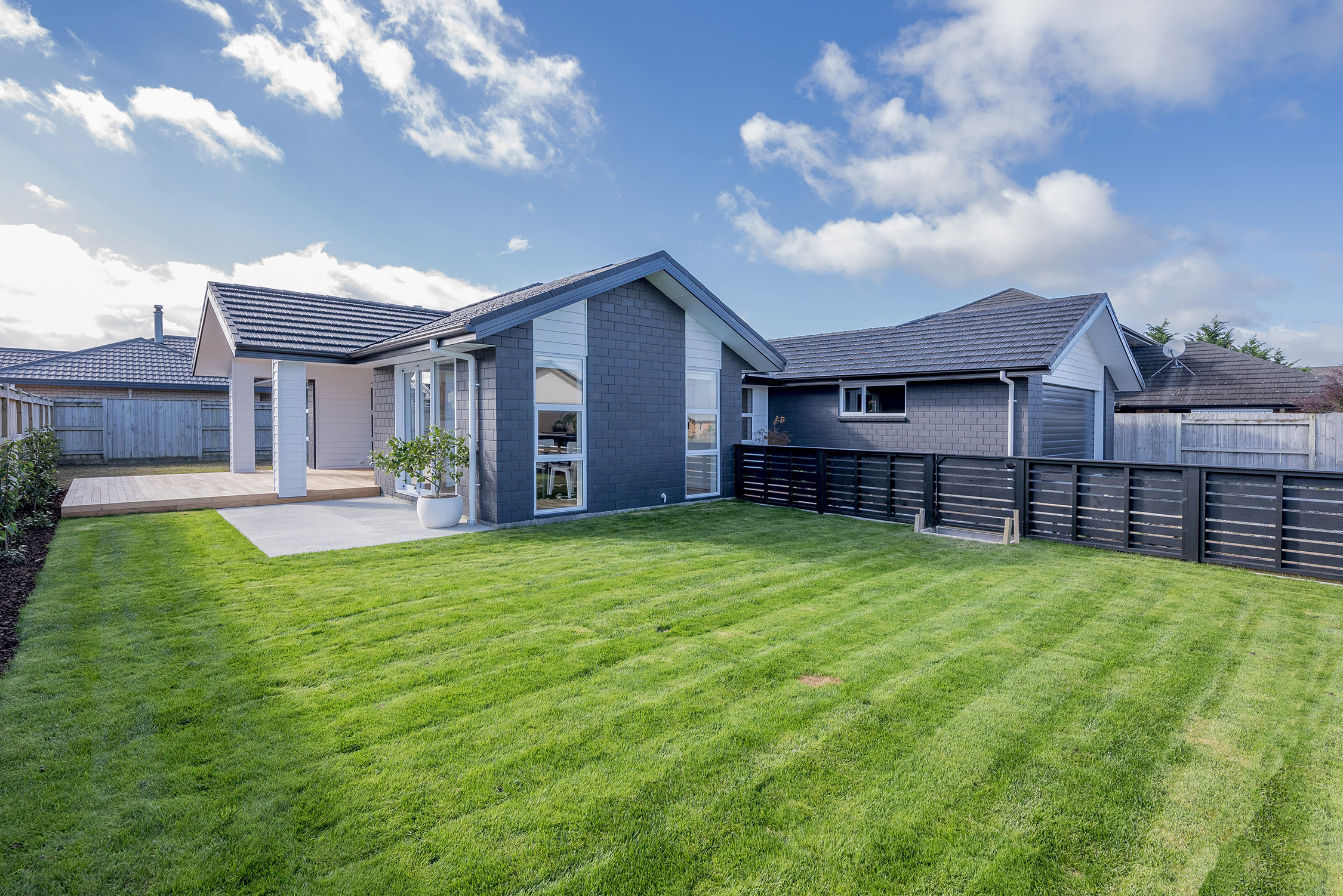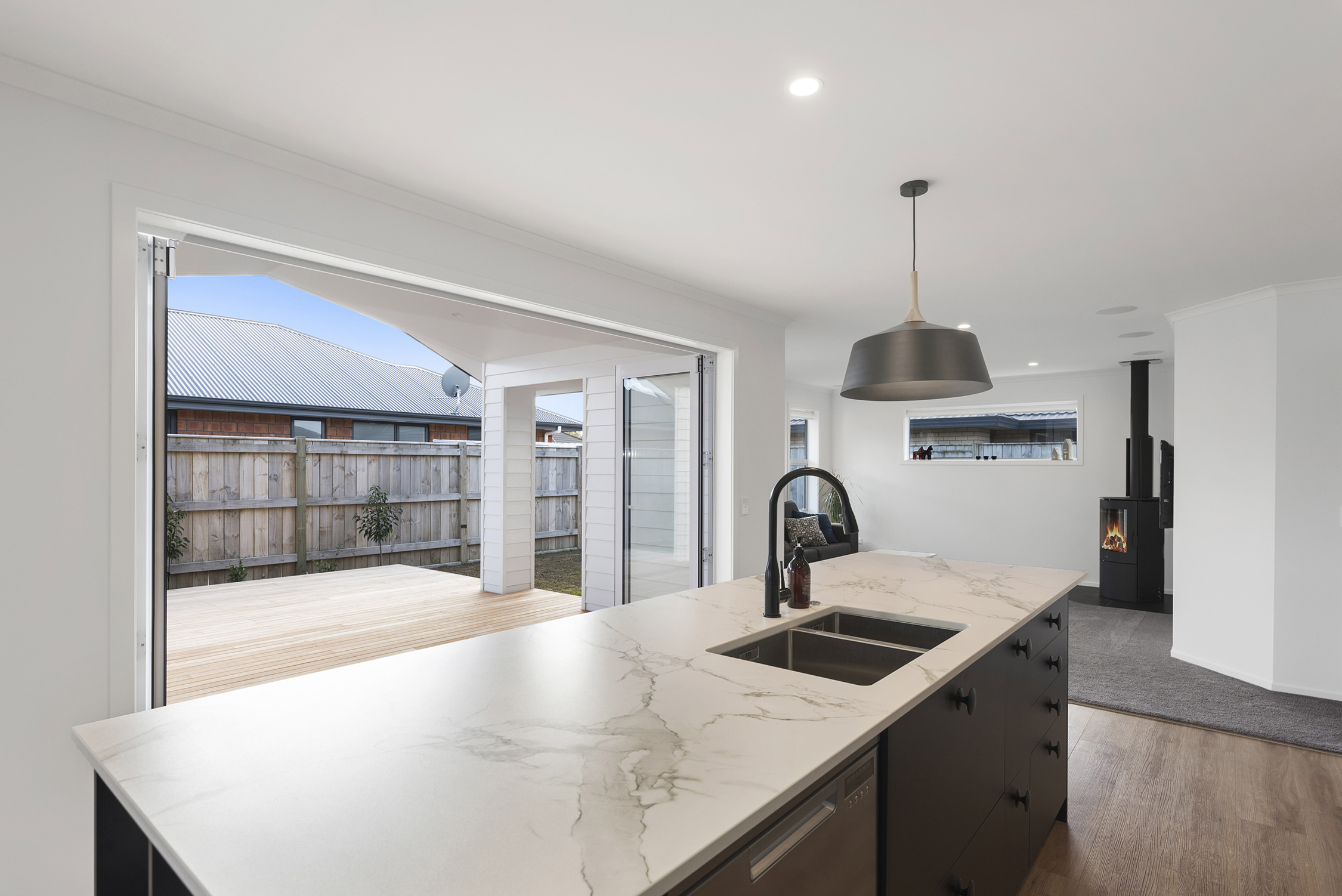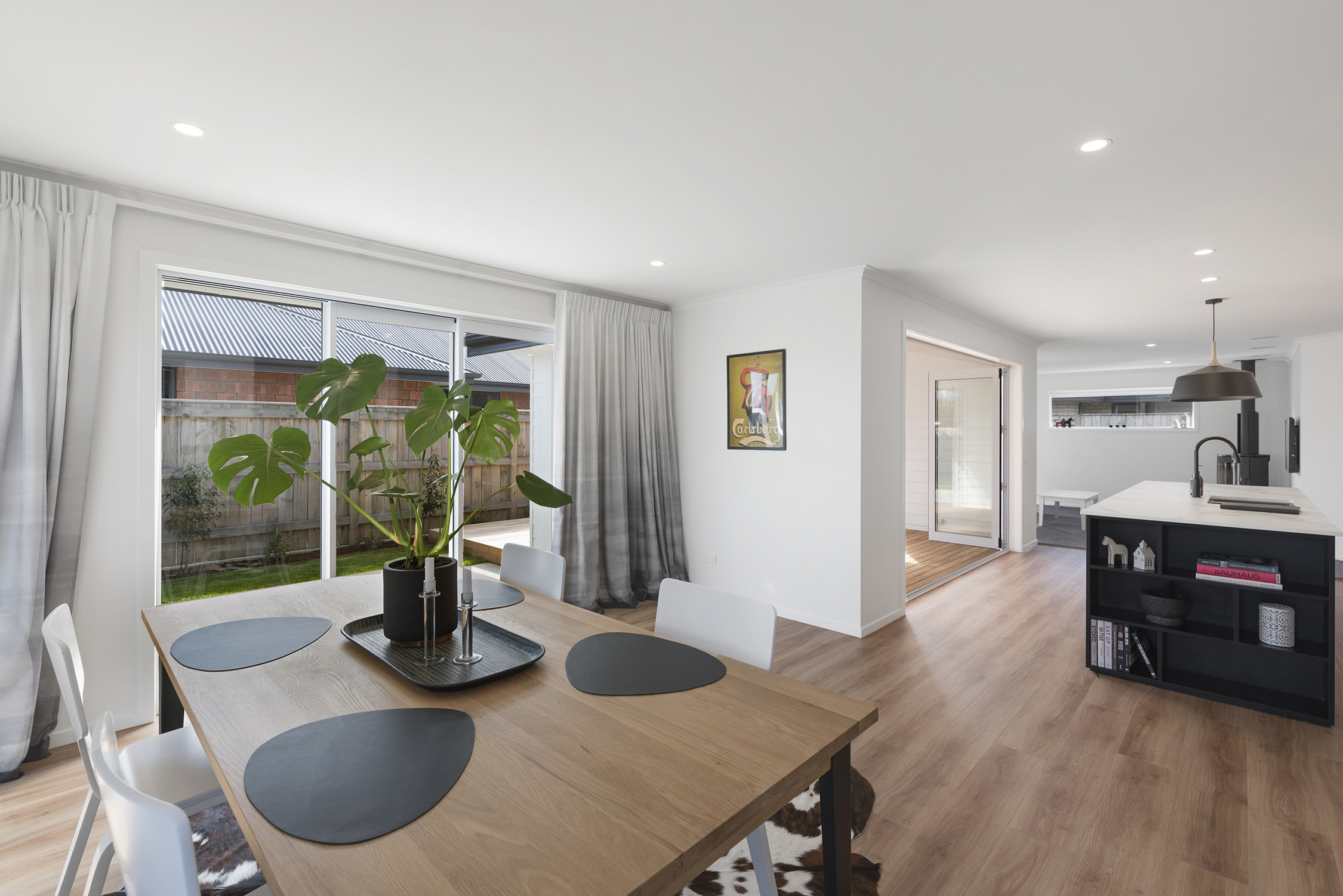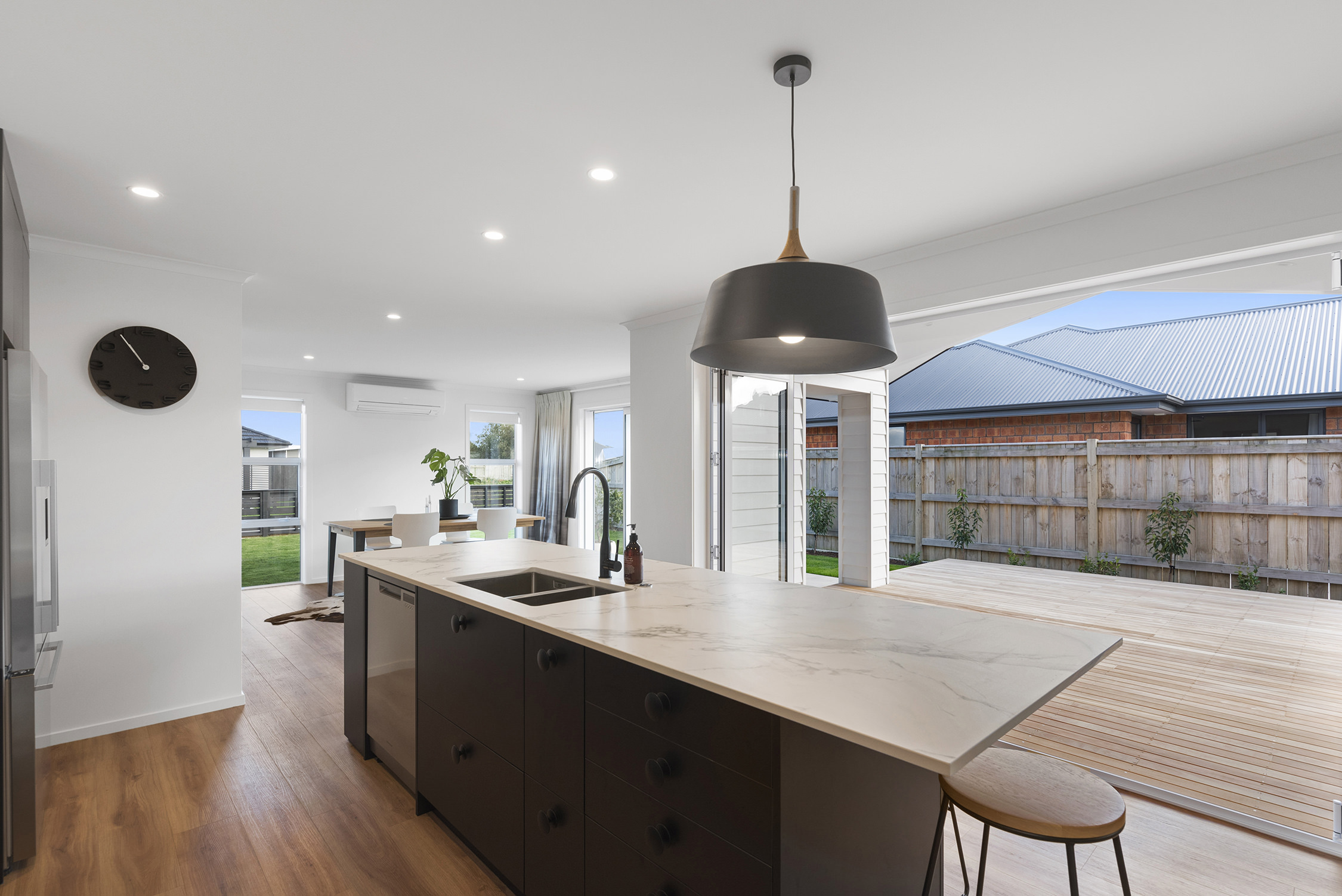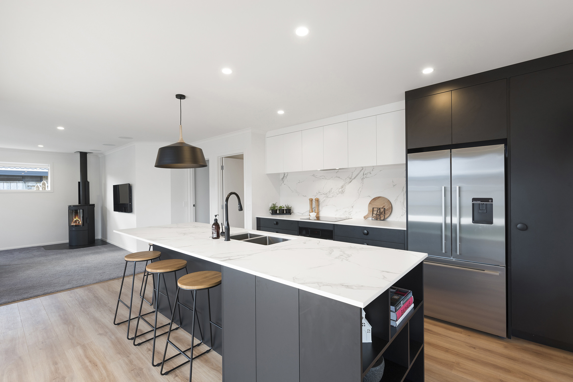 Nestled in an expanding Palmerston North suburb, this gorgeous new home is a true escape from the world. With a flexible family-friendly floor plan featuring two living spaces, this four-bedroom home is laid out for modern life with plenty of personal touches thrown in. The home was custom-designed to suit the family’s needs. Large bifold doors open to a spacious portico. This serves as a fantastic extension of the living space providing an area for all-weather entertaining. The raked ceiling is eye-catching overhead. Smartly clad in a mix of low-maintenance materials, the home’s exterior updates the traditional gable look. The spacious designer kitchen is its social hub. Striking benchtops serve up plenty of style in the entertainer’s space with self-cleaning and induction appliances and a large scullery backstage. A freestanding wood fi re keeps the lounge warm and welcoming in the depths of winter. There’s also a heat pump for instant gratifi cation. This is a wonderful example of how contemporary design and materials can serve family life in style.
