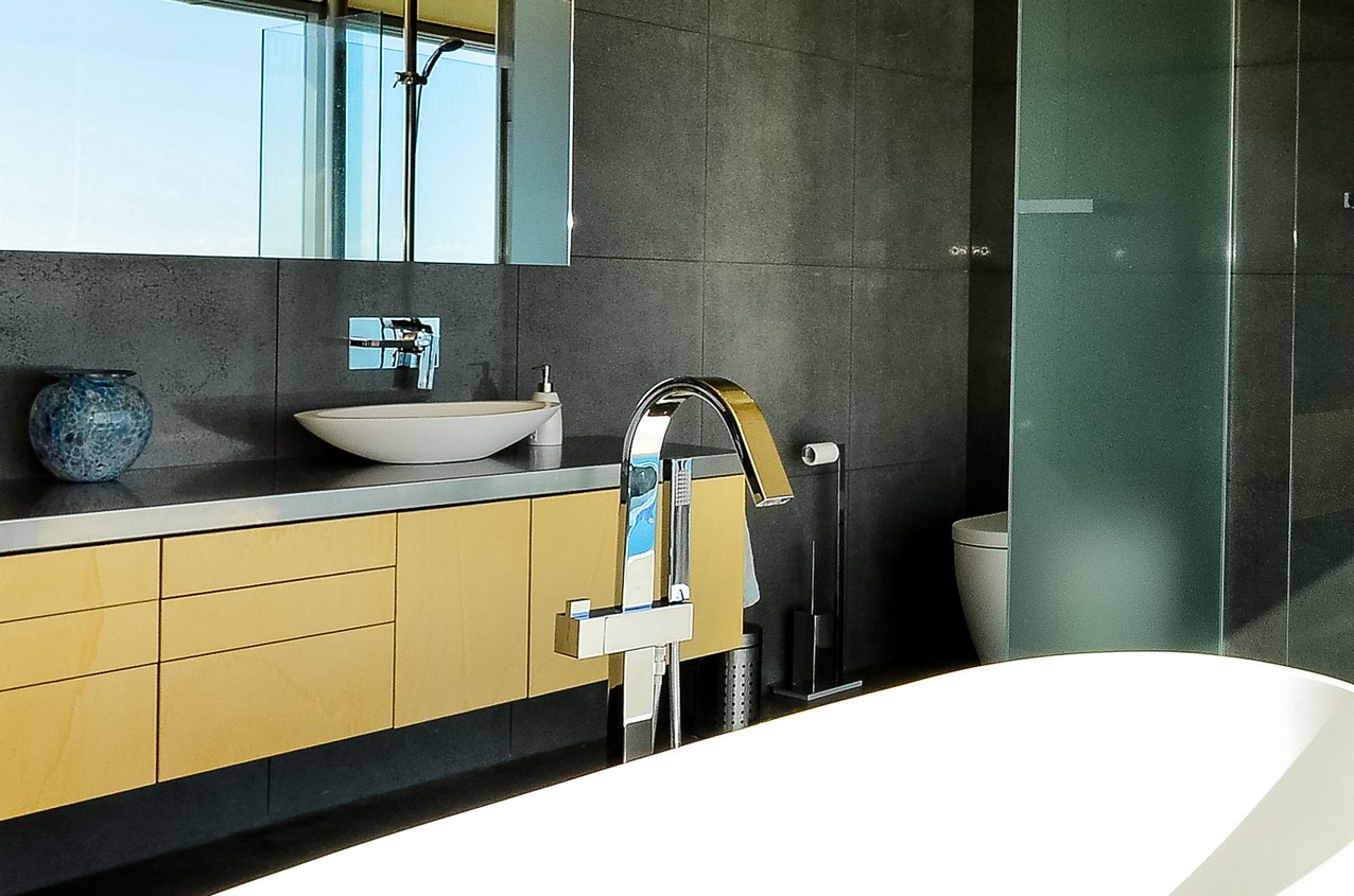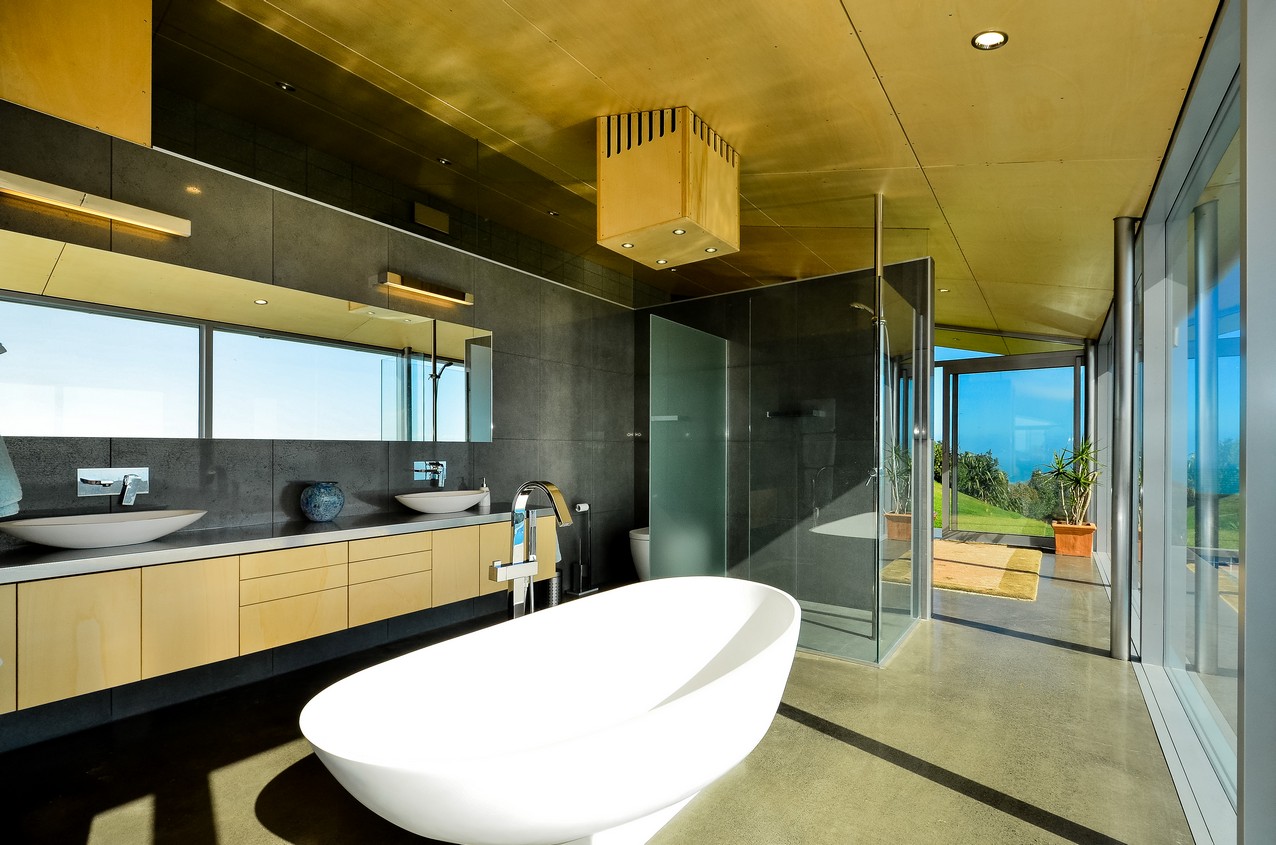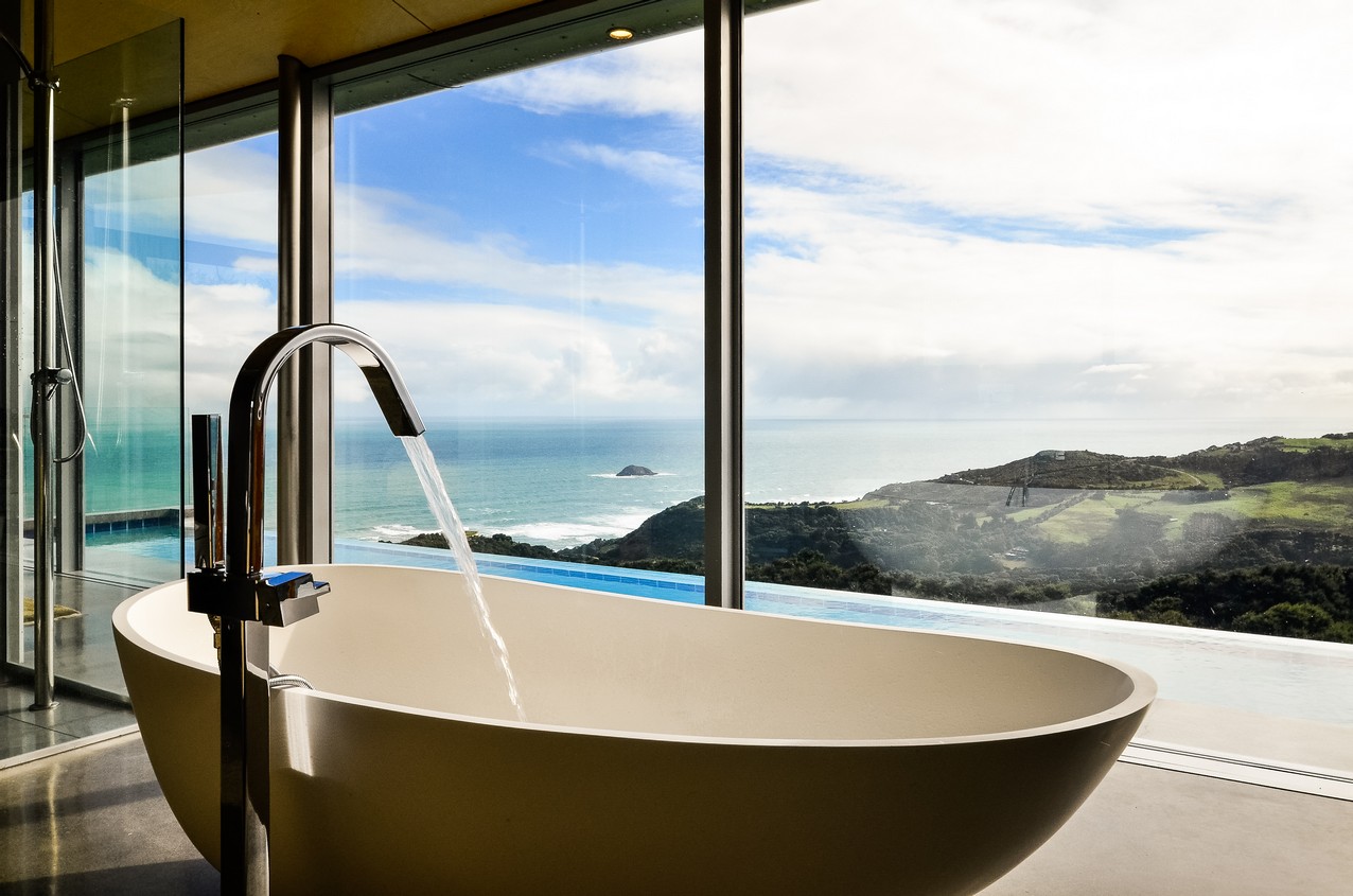 Positioned to maximise the expansive vista, views flood in through floor-to-ceiling windows that run the length of the house. The feeling of openness and light is breathtaking. Strong, honed concrete blocks provide a grounding force, anchoring the structure on the wild west coast. As it hugs the hillside, every aspect of this house is in sympathy with the location. An incredible calming infinity pool appears to reach out and touch the tempestuous ocean. The shell-like texture of block cladding takes inspiration from the shoreline. Inside, the kitchen is designed around the classic Aga cooker. Black detailing in the ceiling, cabinetry and appliances is right at home above Auckland’s iconic black-sand beaches. Textured stainless steel creates an industrial but elegant look, linking to the stunning bathroom. A sculptural bath offers another angle on the moody view.