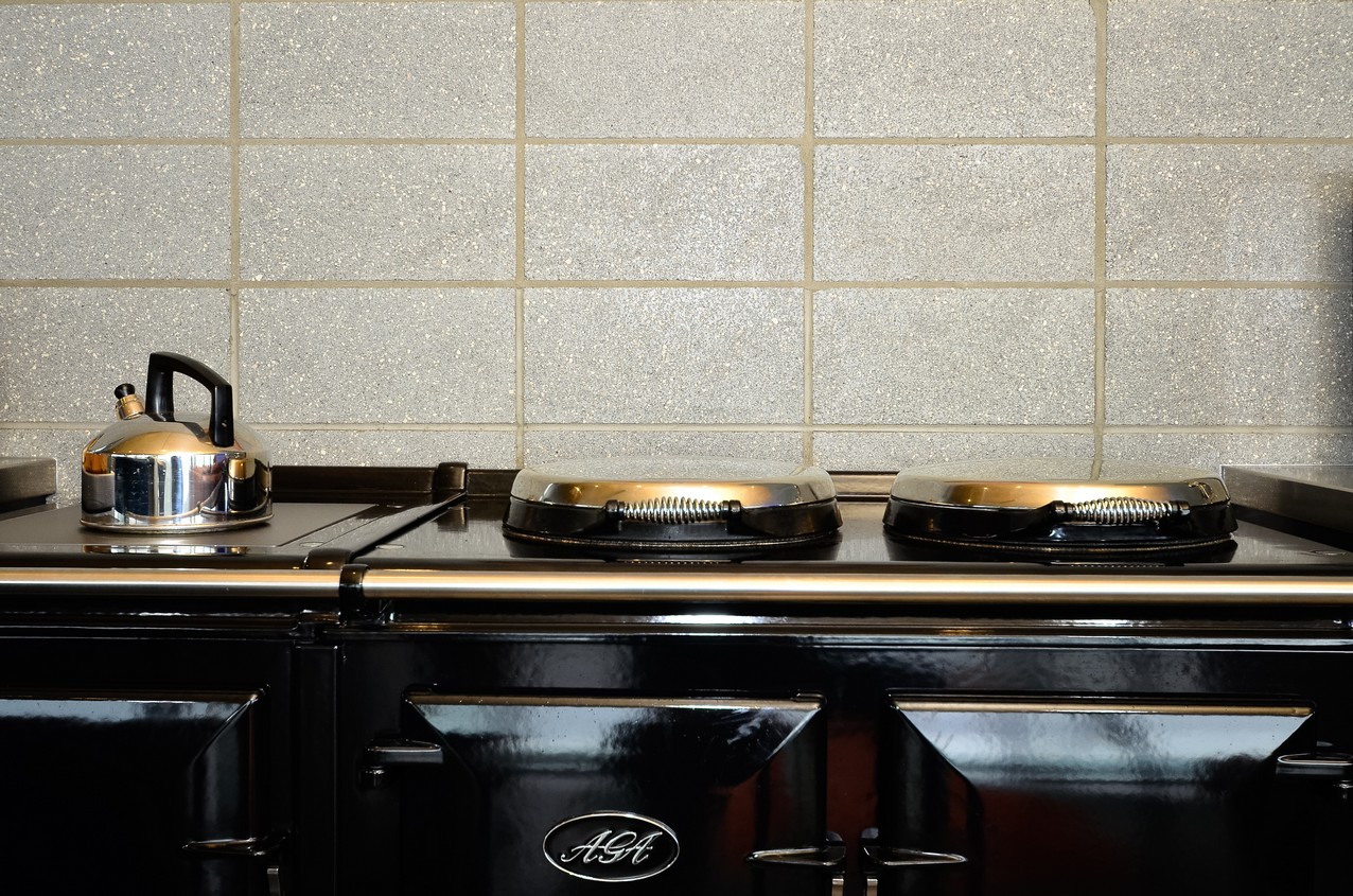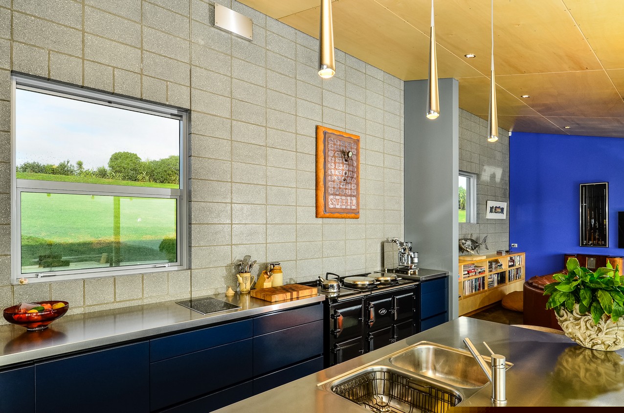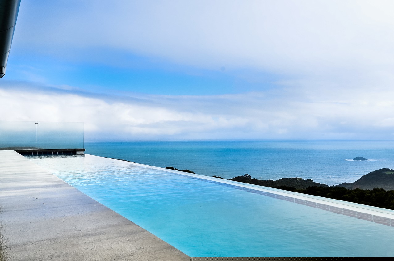 Positioned to maximise the expansive vista, views flood in through floor-to-ceiling windows that run the length of the house. The feeling of openness and light is breathtaking. Strong, honed concrete blocks provide a grounding force, anchoring the structure on the wild west coast. As it hugs the hillside, every aspect of this house is in sympathy with the location. An incredible calming infinity pool appears to reach out and touch the tempestuous ocean. The shell-like texture of block cladding takes inspiration from the shoreline. Inside, the kitchen is designed around the classic Aga cooker. Black detailing in the ceiling, cabinetry and appliances is right at home above Auckland’s iconic black-sand beaches. Textured stainless steel creates an industrial but elegant look, linking to the stunning bathroom. A sculptural bath offers another angle on the moody view.