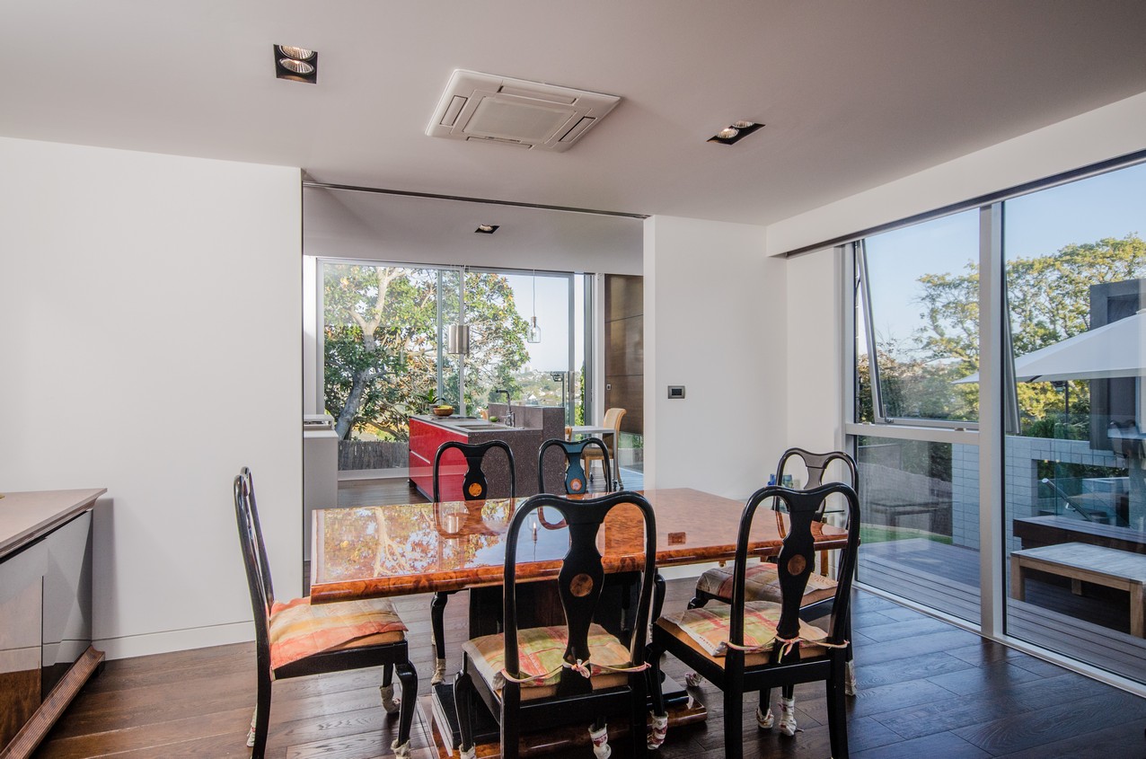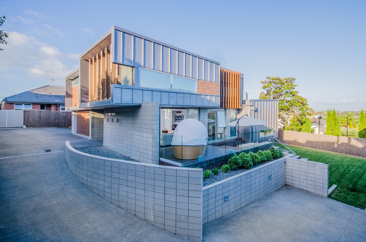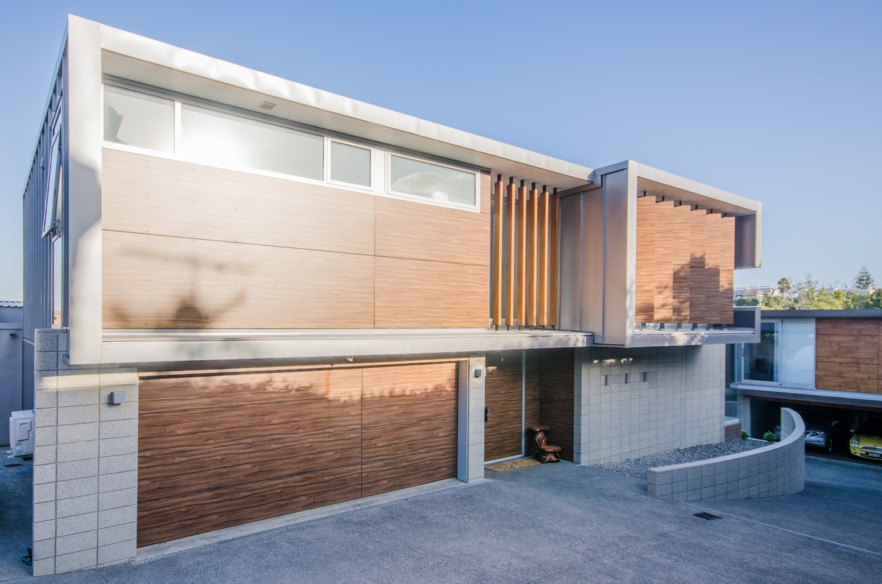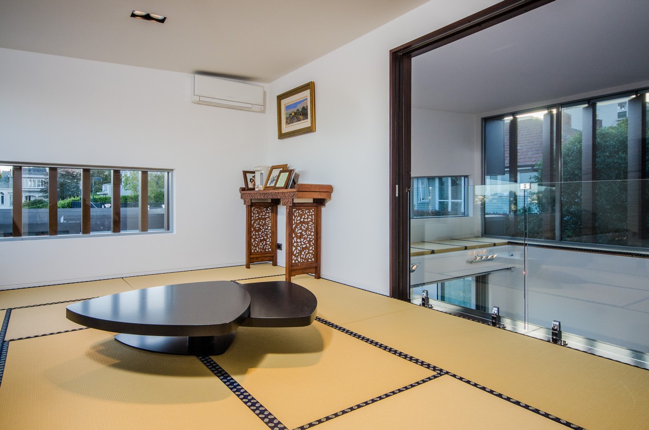 Comprising a series of elegant, interconnecting boxes, the dramatic exterior is undeniably modern. A selection of stylish feature materials accentuates the home’s volumes inside and out. Common outdoor areas offer space for family interaction. A double-height entry hints at the wide-open spaces within. Dark oak timber flooring provides thermal mass from the front door throughout the open-plan. The living room’s super-high ceiling drops below the upstairs walkway to create an intimate atmosphere in the formal dining area. The kitchen is positioned through double doors. Inside flows out through multiple glass sliders to decking and a shared courtyard. Four bedrooms include a master with unobstructed views towards Hobson Bay. A large built-in bathtub creates a spa-like experience in the ensuite. A tatami room provides a wonderful point of difference.