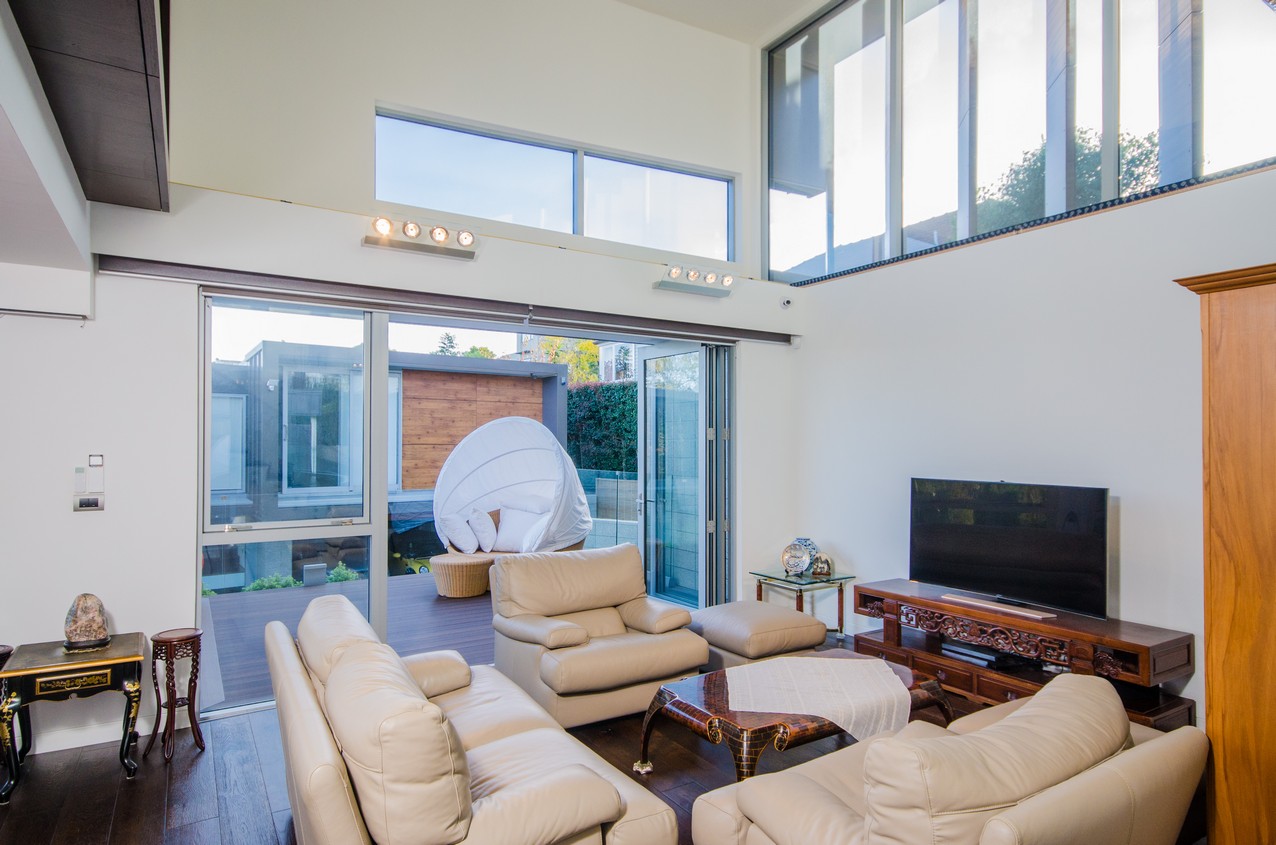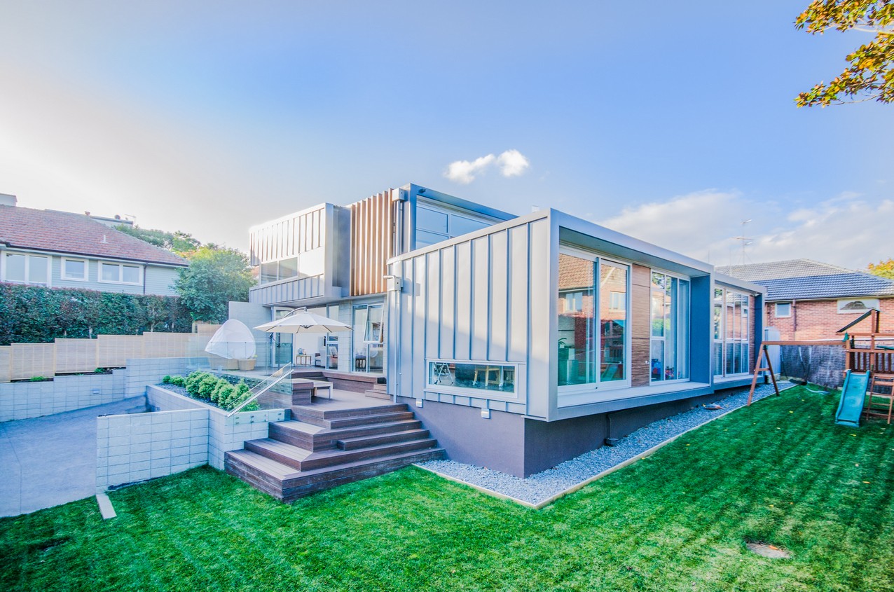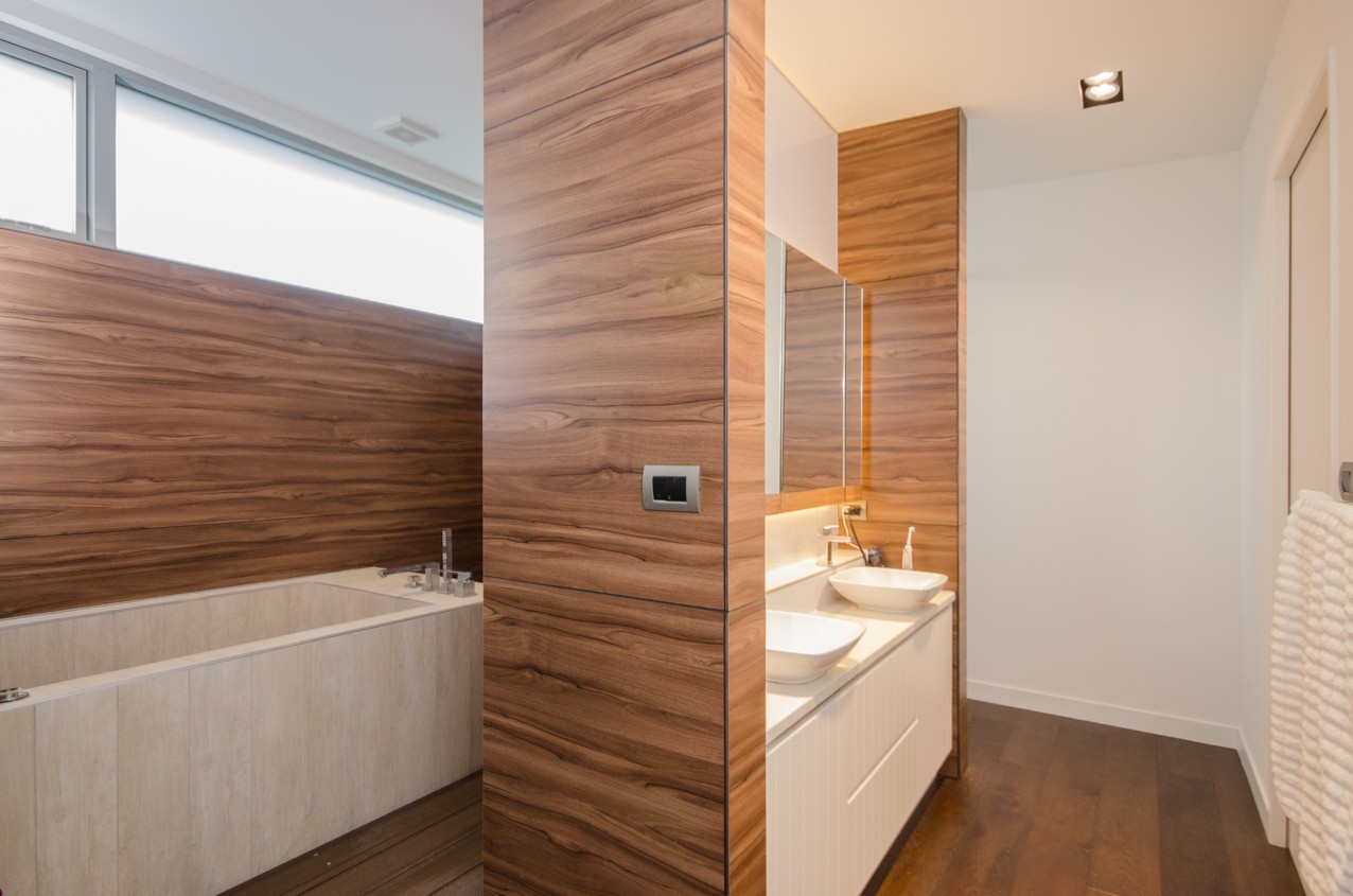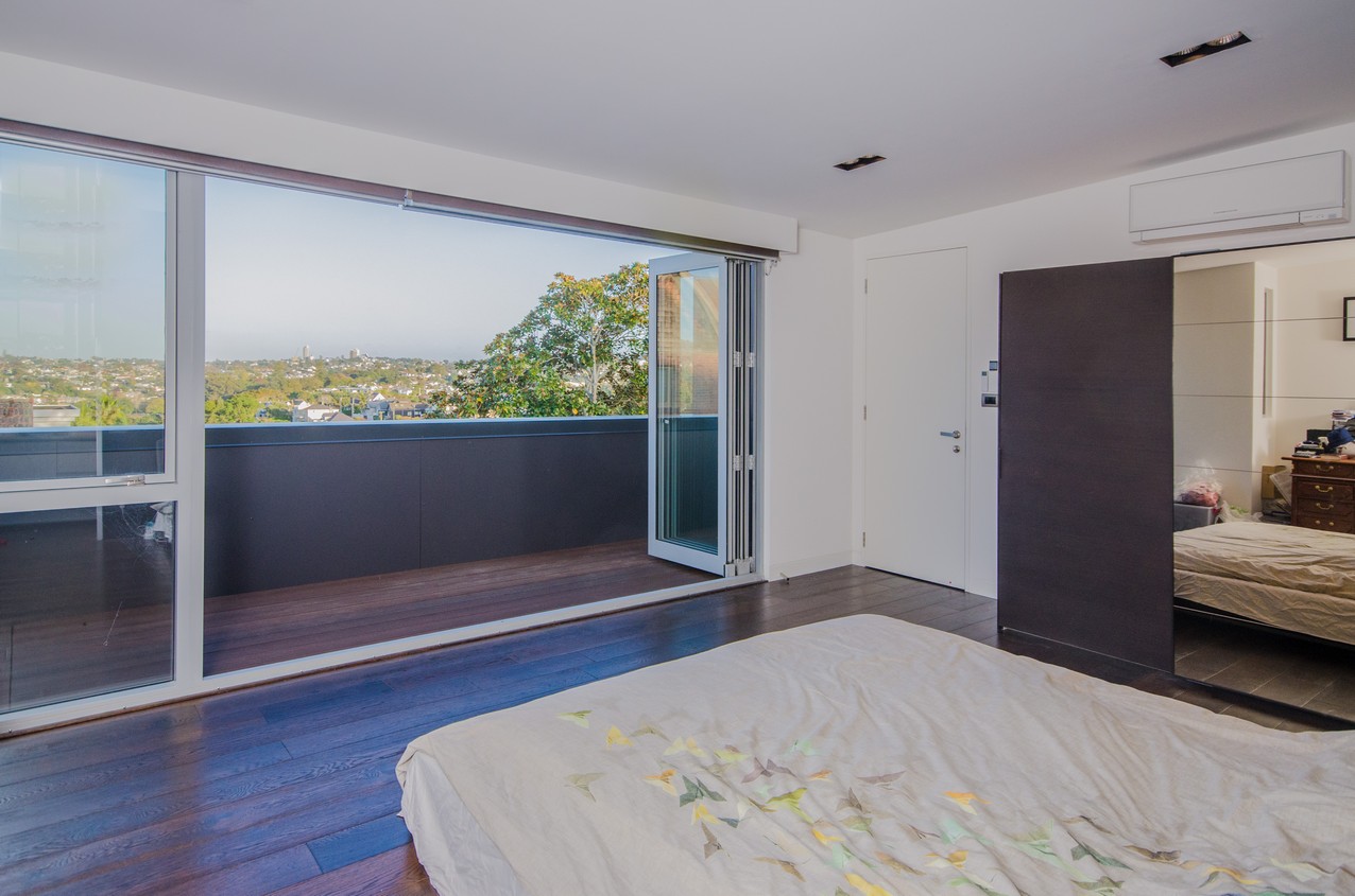 Comprising a series of elegant, interconnecting boxes, the dramatic exterior is undeniably modern. A selection of stylish feature materials accentuates the home’s volumes inside and out. Common outdoor areas offer space for family interaction. A double-height entry hints at the wide-open spaces within. Dark oak timber flooring provides thermal mass from the front door throughout the open-plan. The living room’s super-high ceiling drops below the upstairs walkway to create an intimate atmosphere in the formal dining area. The kitchen is positioned through double doors. Inside flows out through multiple glass sliders to decking and a shared courtyard. Four bedrooms include a master with unobstructed views towards Hobson Bay. A large built-in bathtub creates a spa-like experience in the ensuite. A tatami room provides a wonderful point of difference.