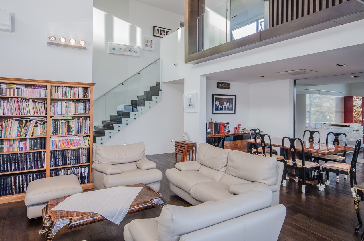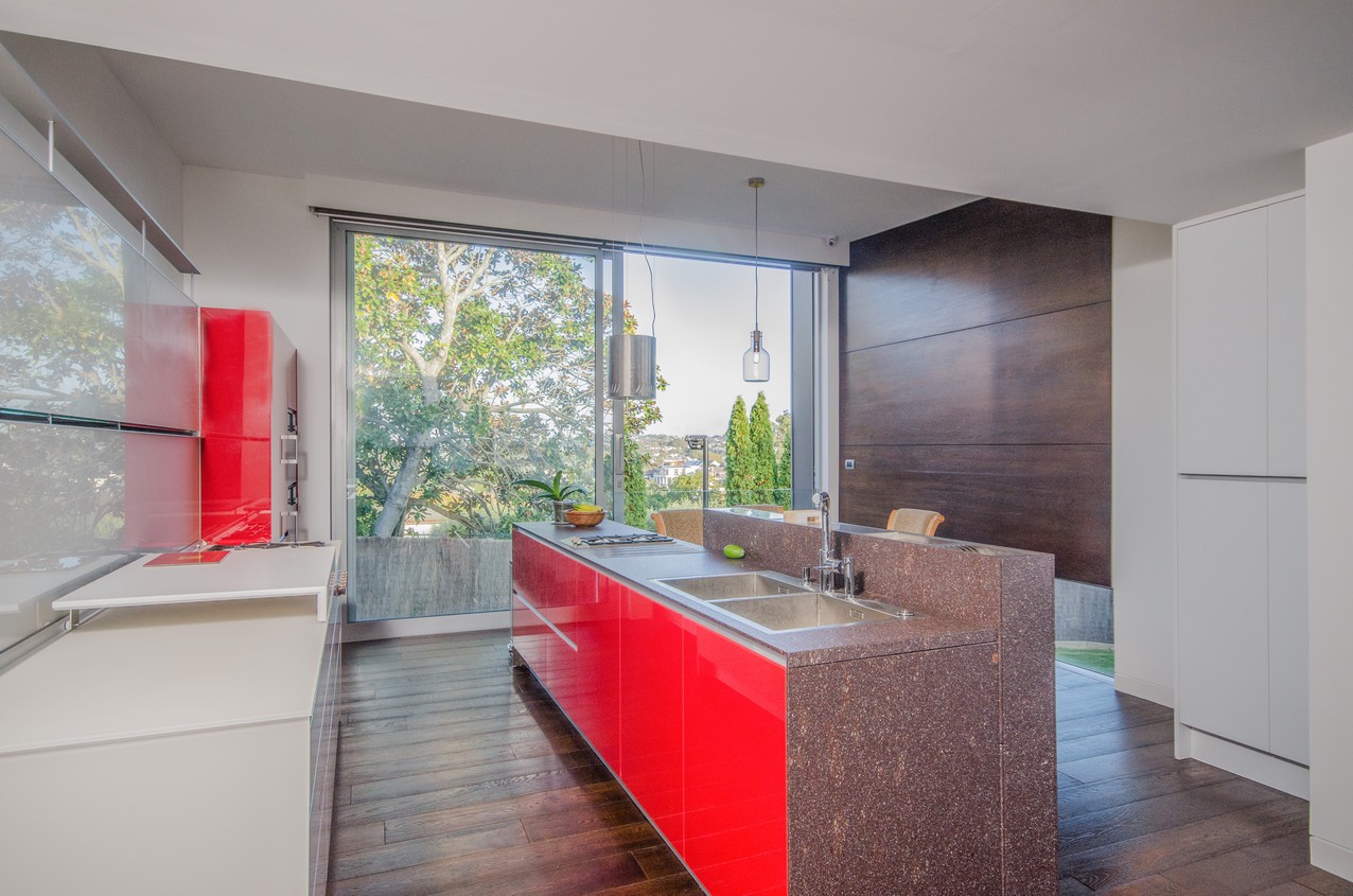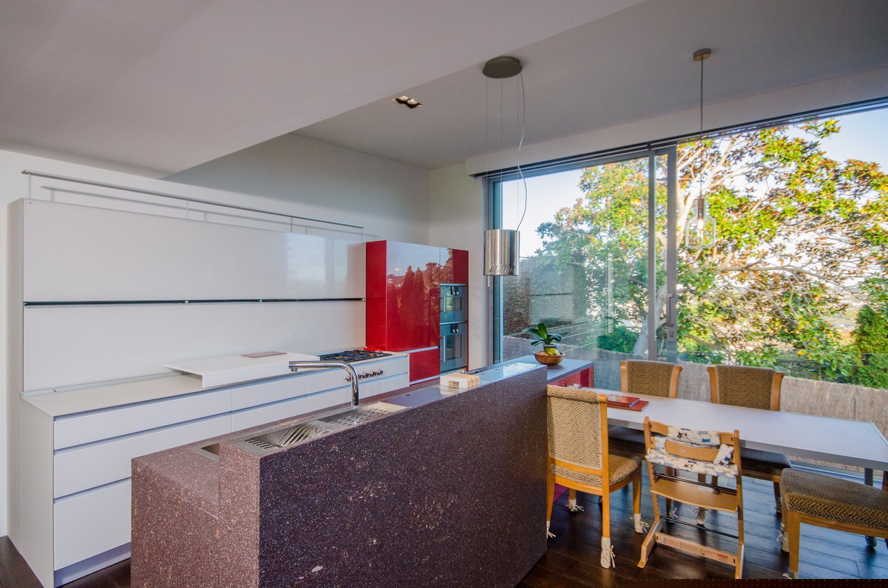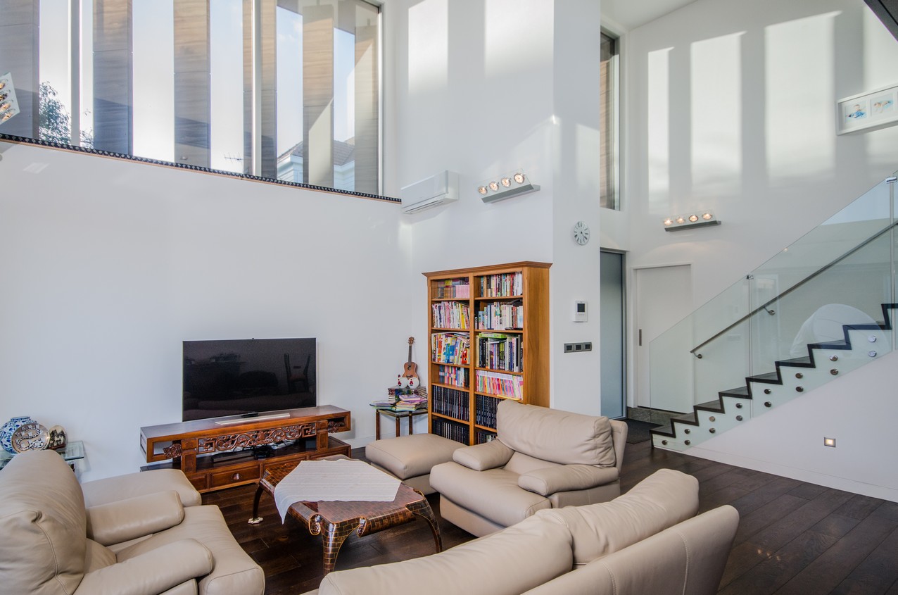 Comprising a series of elegant, interconnecting boxes, the dramatic exterior is undeniably modern. A selection of stylish feature materials accentuates the home’s volumes inside and out. Common outdoor areas offer space for family interaction. A double-height entry hints at the wide-open spaces within. Dark oak timber flooring provides thermal mass from the front door throughout the open-plan. The living room’s super-high ceiling drops below the upstairs walkway to create an intimate atmosphere in the formal dining area. The kitchen is positioned through double doors. Inside flows out through multiple glass sliders to decking and a shared courtyard. Four bedrooms include a master with unobstructed views towards Hobson Bay. A large built-in bathtub creates a spa-like experience in the ensuite. A tatami room provides a wonderful point of difference.