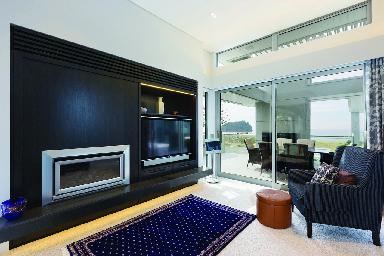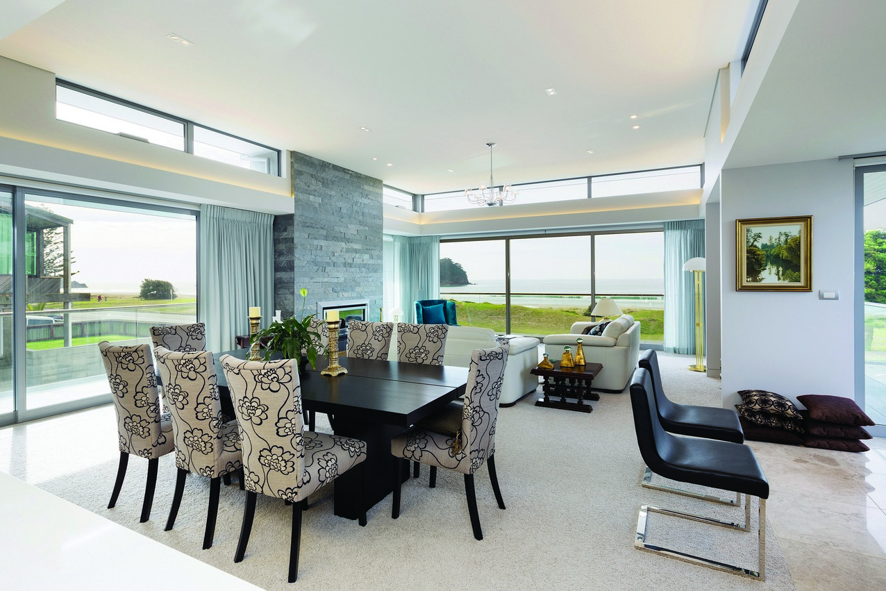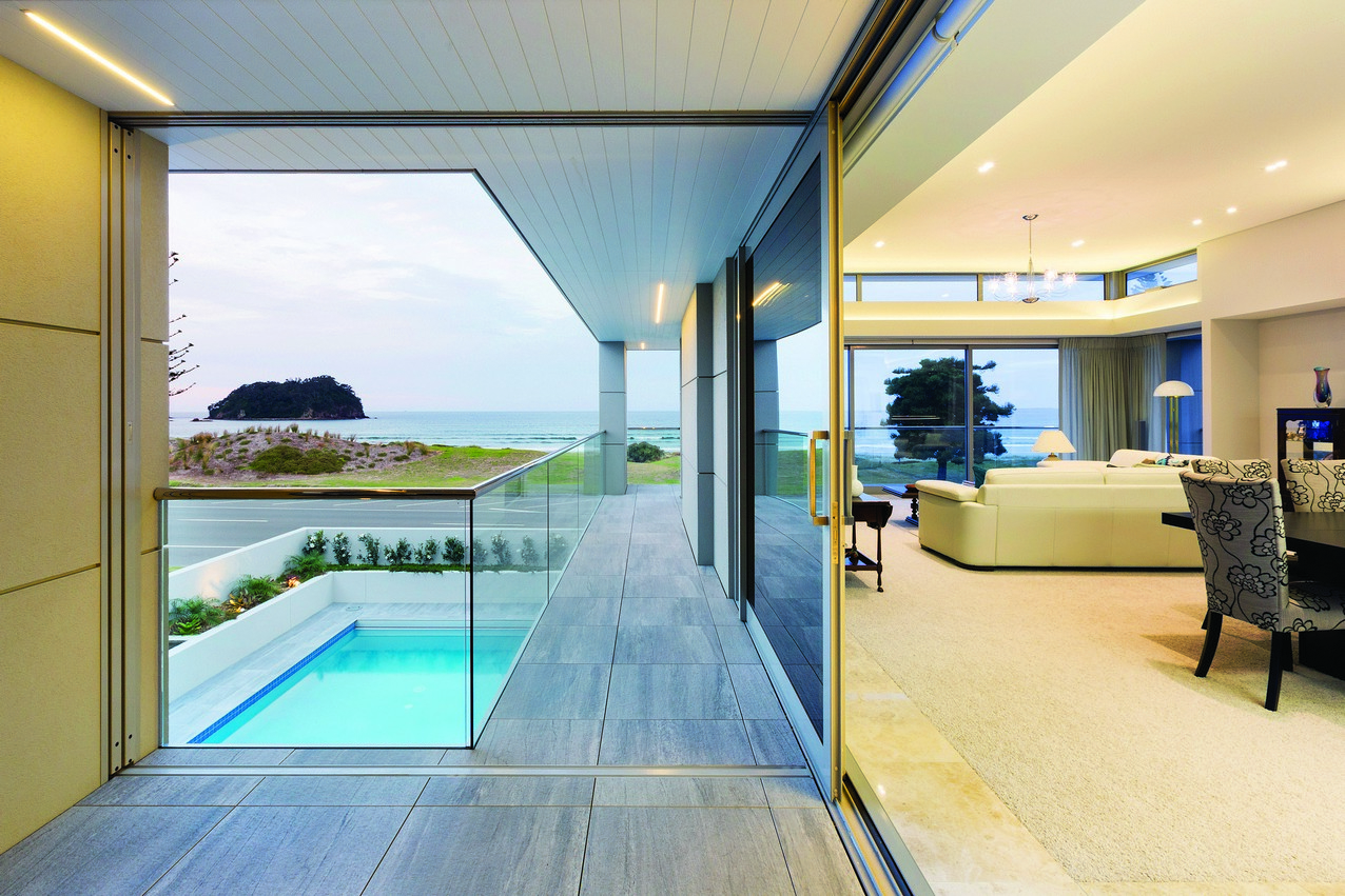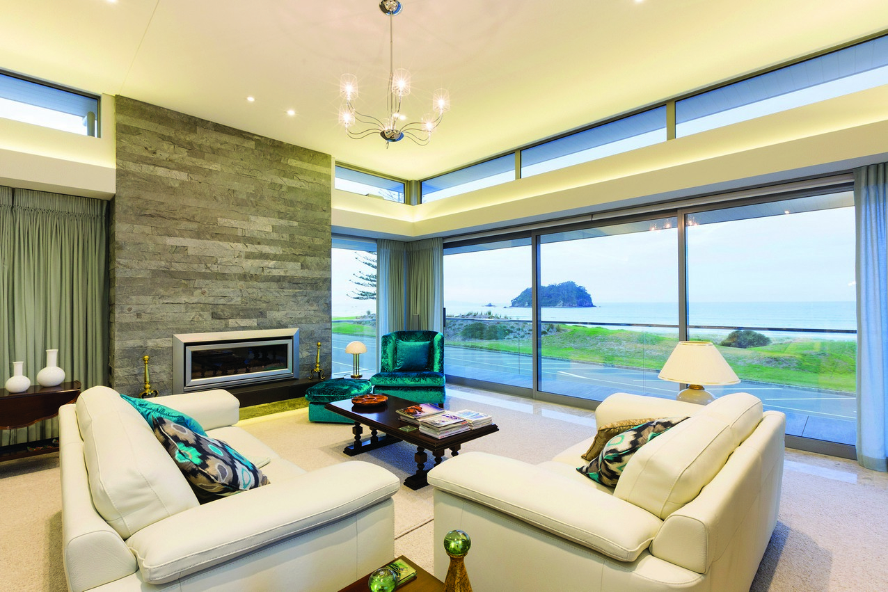 A 3.5m-high cedar door opens to the ultra-chic 419sqm interior of this modern Mt Maunganui marvel. Polished stone tiling in the entrance is a Turkish delight.