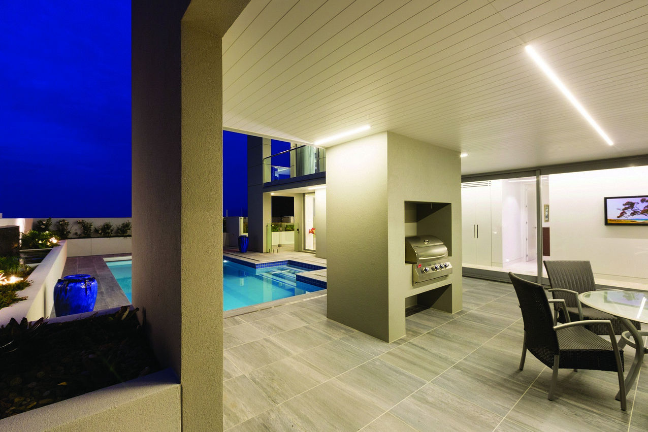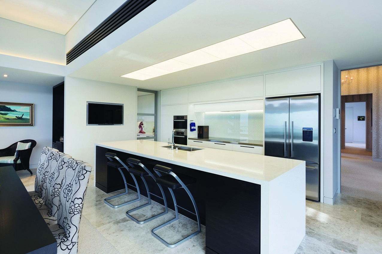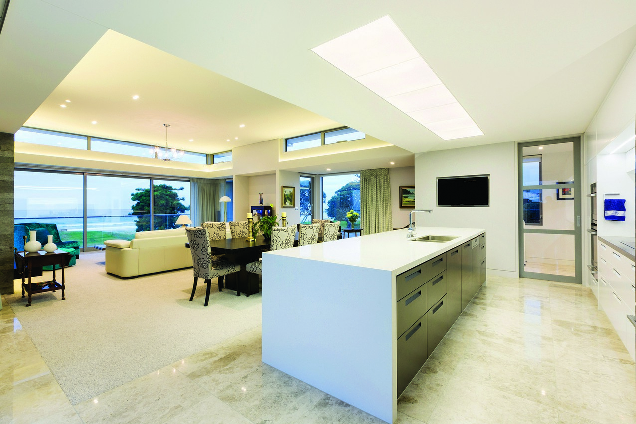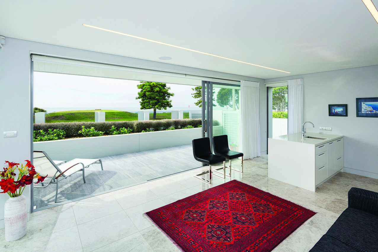 Follow the passageway to find two bedrooms, a study and a family room complete with kitchenette. Large glass sliders open from the hall to an outdoor entertaining area with barbecue, overlooking the stunning swimming pool. The lift or staircase will deliver you to the upper floor and incredible open-plan living space. A state-of-the-art kitchen and a dining-lounge area offer everydayindulgence. Spectacular beach views flood in through extensive glazing. If the residents ever tire of the outlook, there’s a television integrated into the kitchen wall, offering convenient viewing while preparing meals or snacks. A light and airy scullery with cavity slider allows items to be kept close at hand but out of view of the living area.