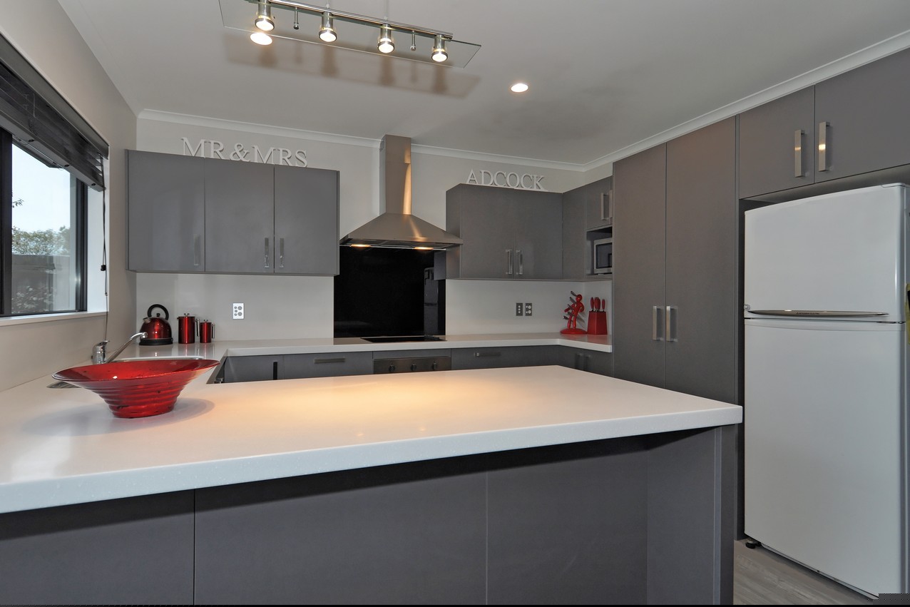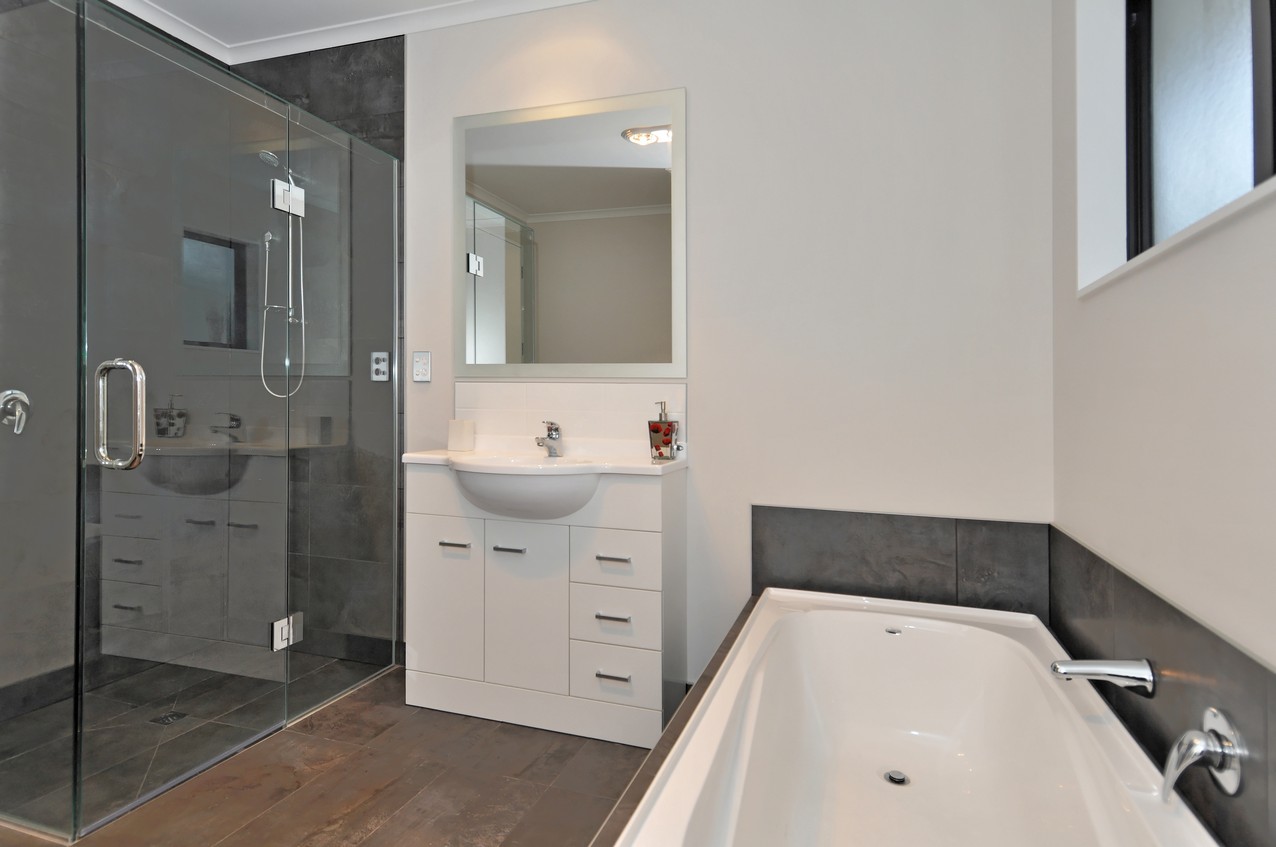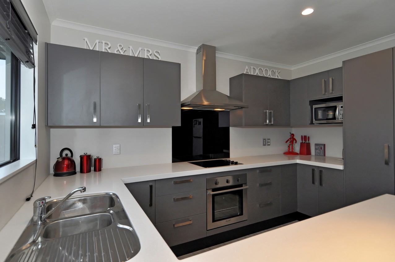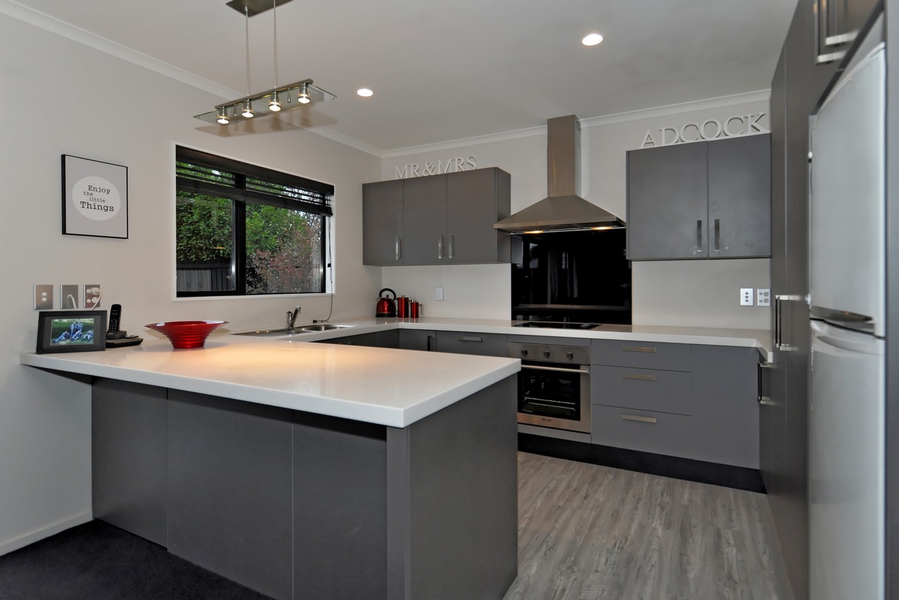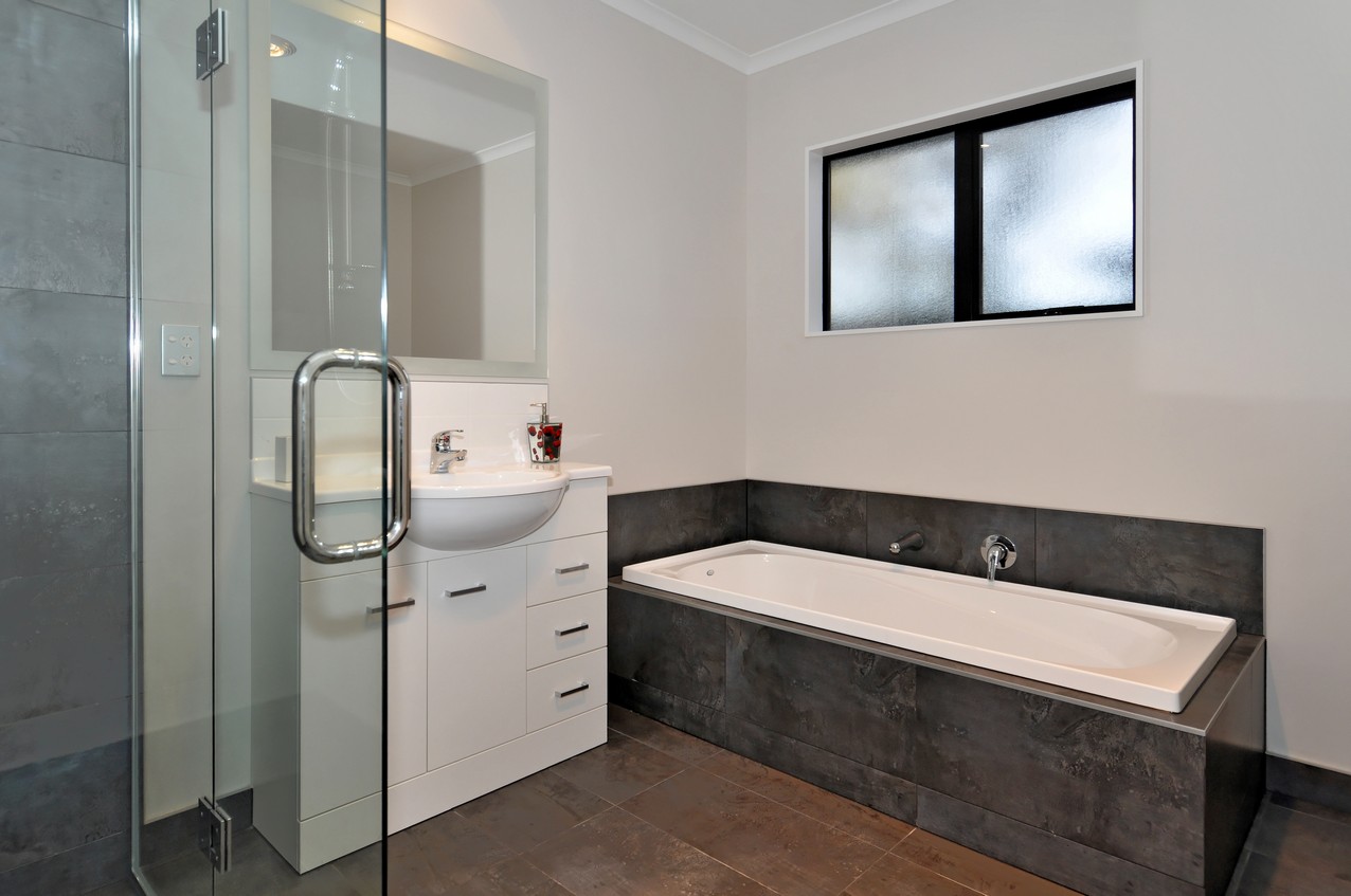 With a north-facing rear living space, this house is private and sunny. A heatpump keeps things cosy when it’s cold out. A coloured concrete patio off the living area adds indoor-outdoor flow for fine days. The good-sized kitchen provides a pleasant space to prepare meals while chatting to family at the breakfast bar. Brushed Pewter Melamine joinery works well with the Tristone bench in Frostland. The black toekicks and glass splashback continue the home’s classic palette, tying inside and out together. A good-sized laundry area in the garage comes complete with storage cupboard for keeping necessary items in reach but out of sight. Three bedrooms, a bathroom with shower and tub, and an ensuite and walk-in robe in the master bedroom, complete this well-planned and well-presented home.