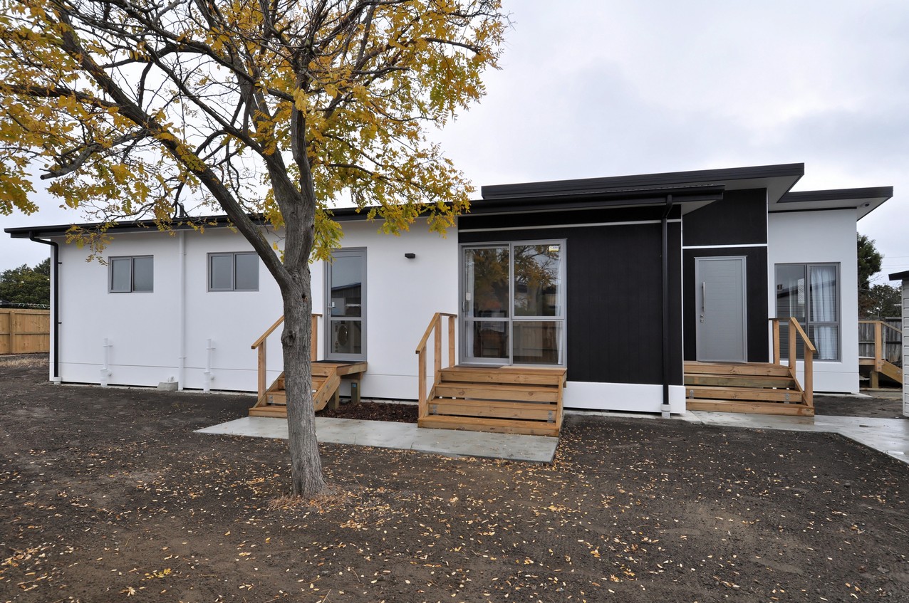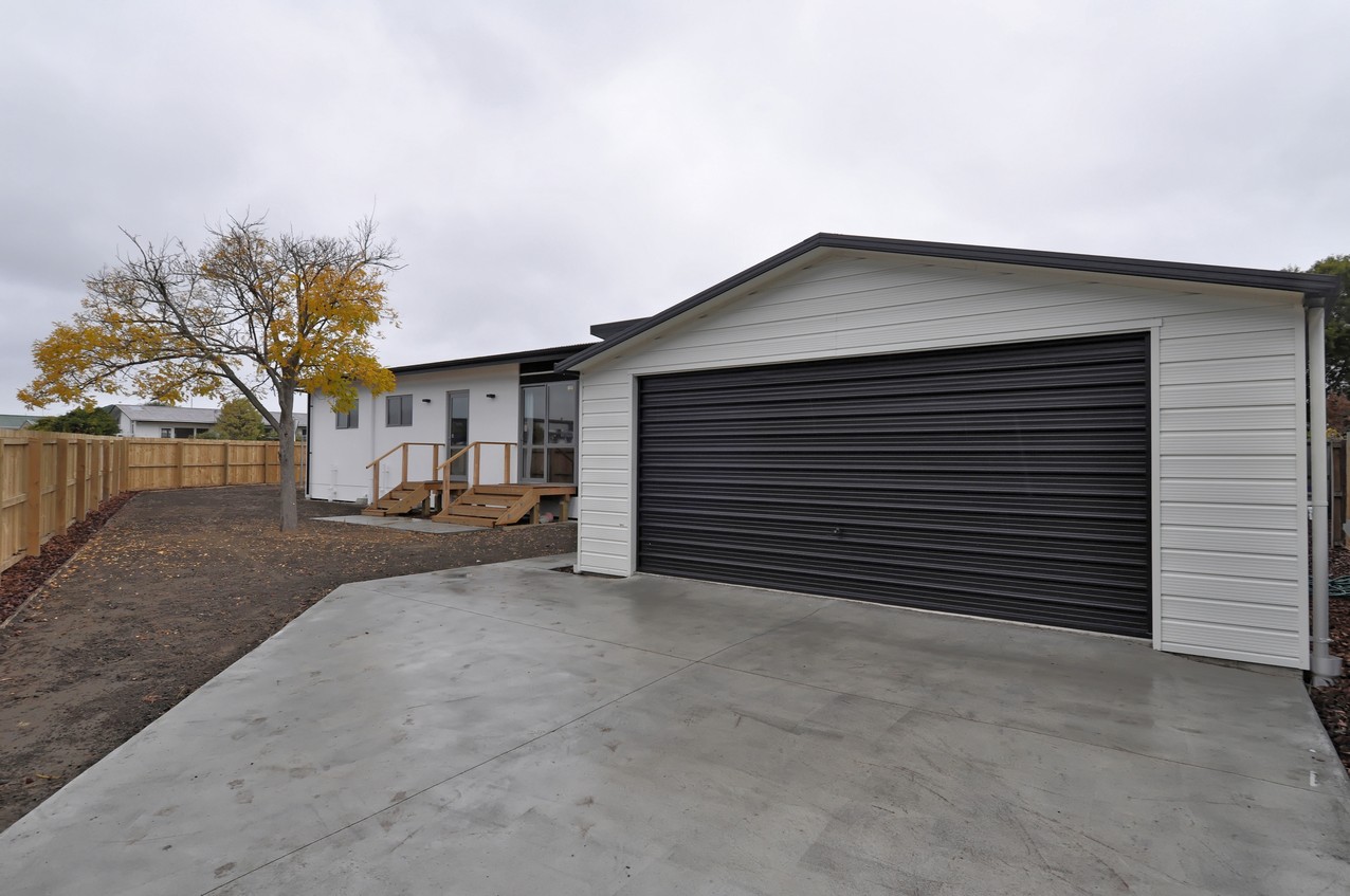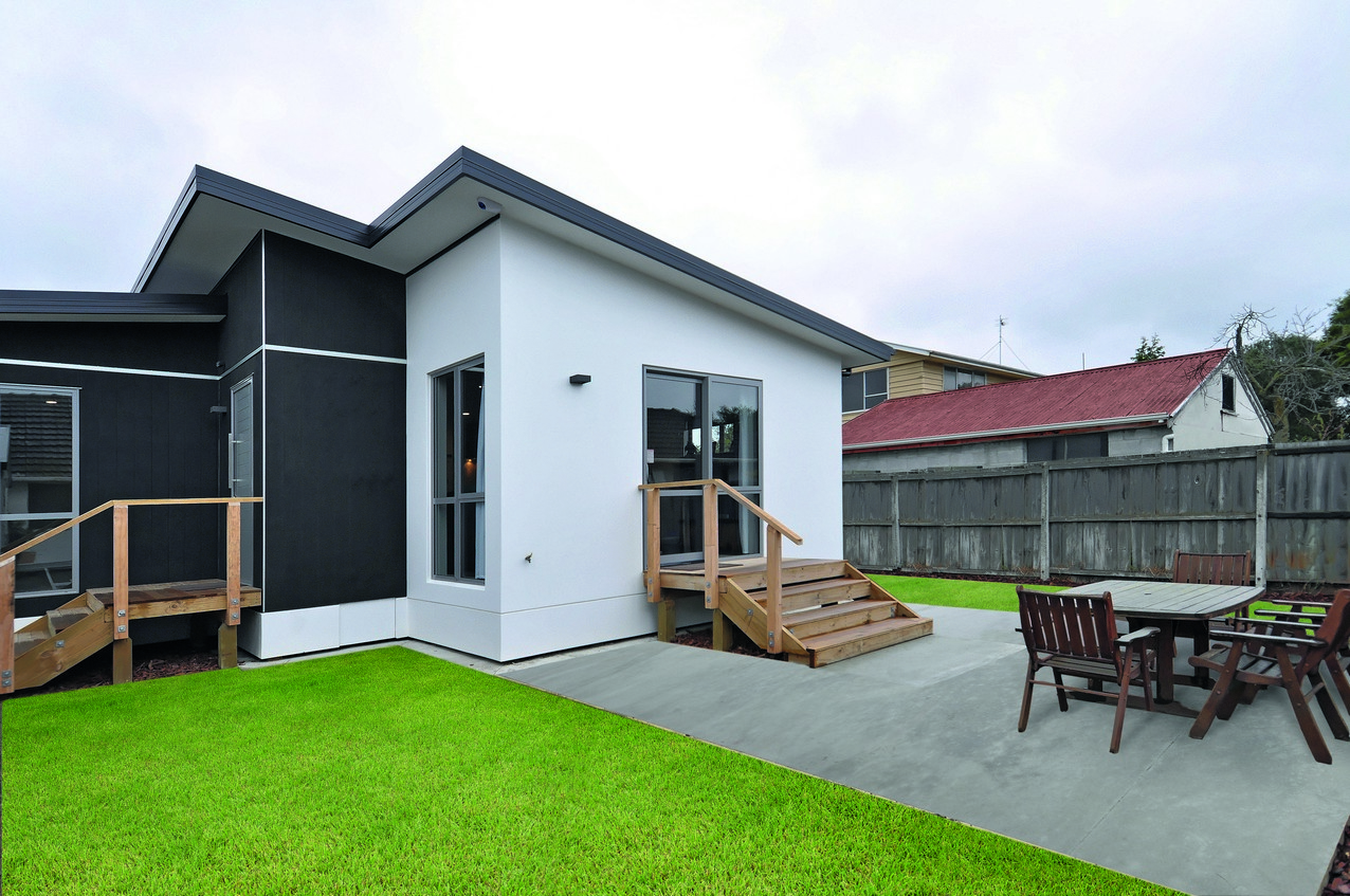 Rockcote Integra painted bright white, and Shadowclad stained in Pitch Black create a funky façade to this three-bedroom, two-bathroom family home, with outdoor living space in Wainoni, Christchurch.