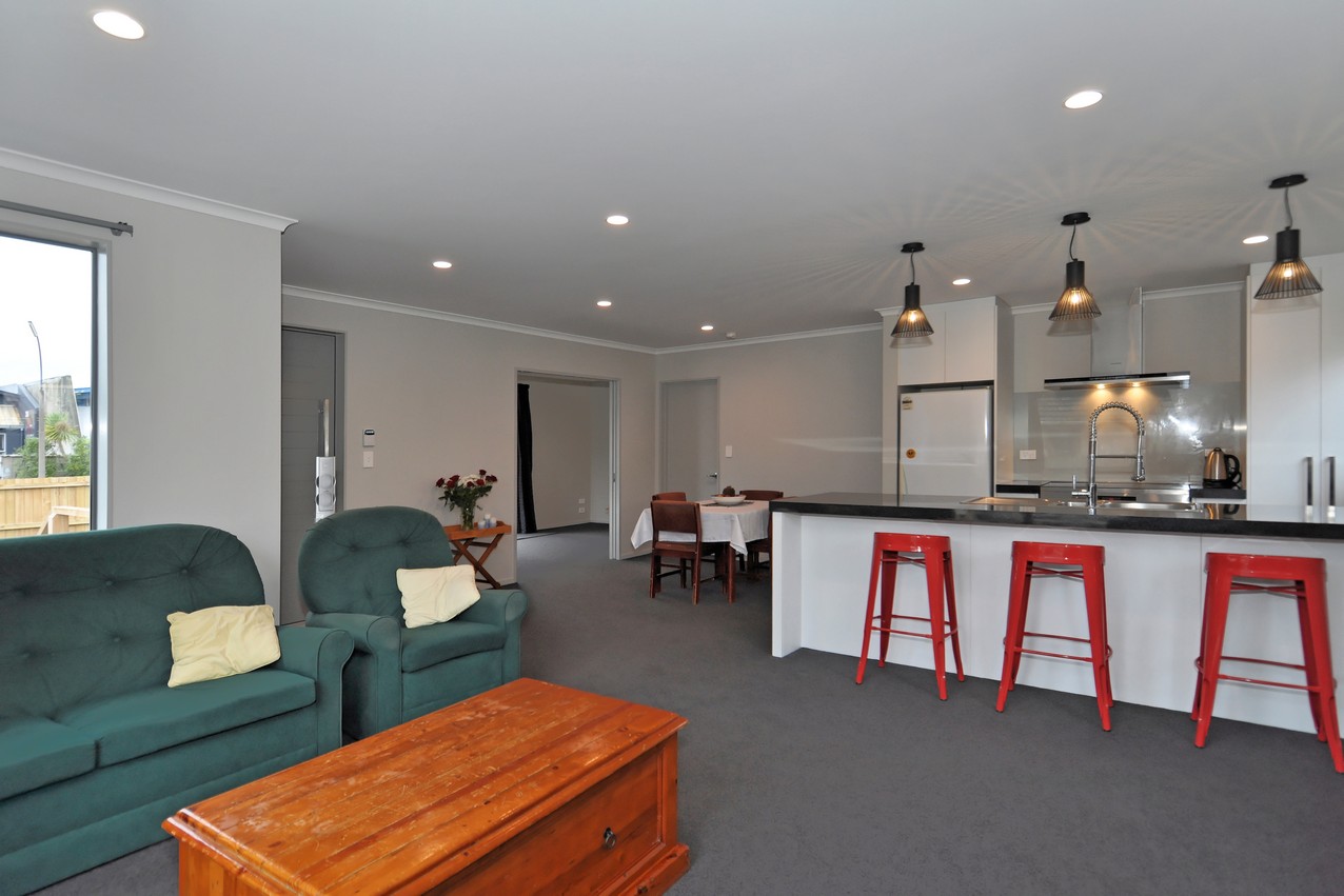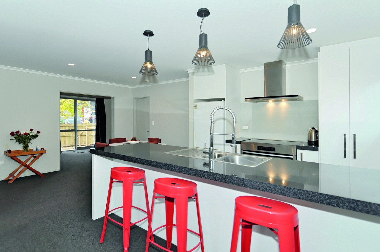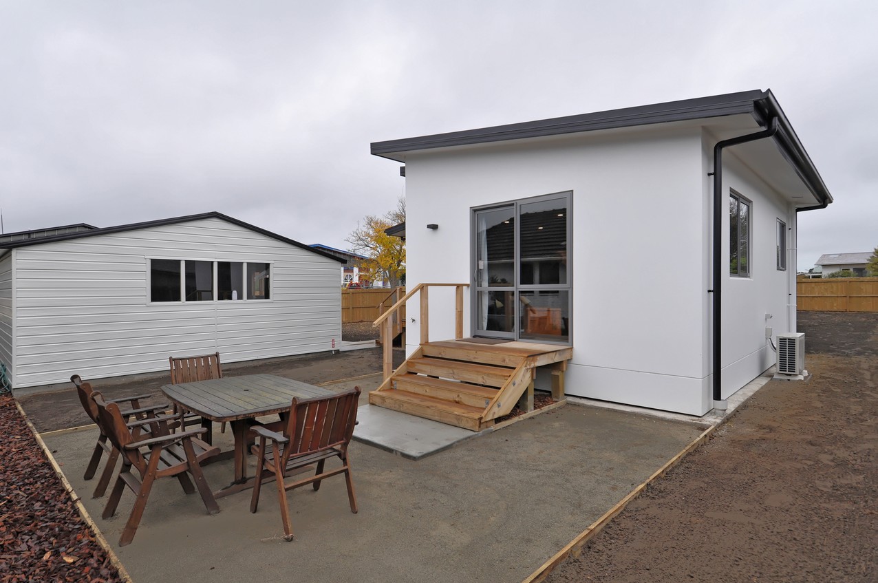 Rockcote Integra painted bright white, and Shadowclad stained in Pitch Black create a funky façade to this three-bedroom, two-bathroom family home, with outdoor living space in Wainoni, Christchurch.
