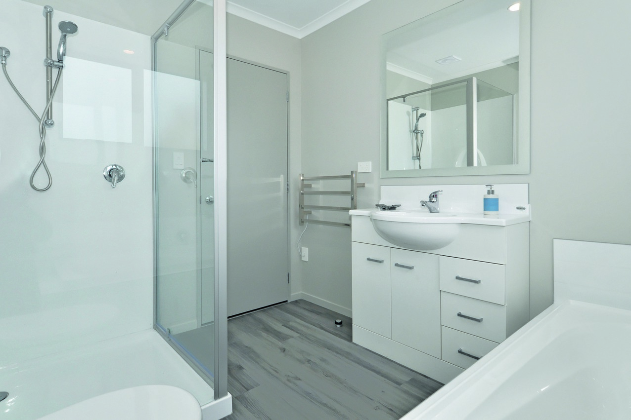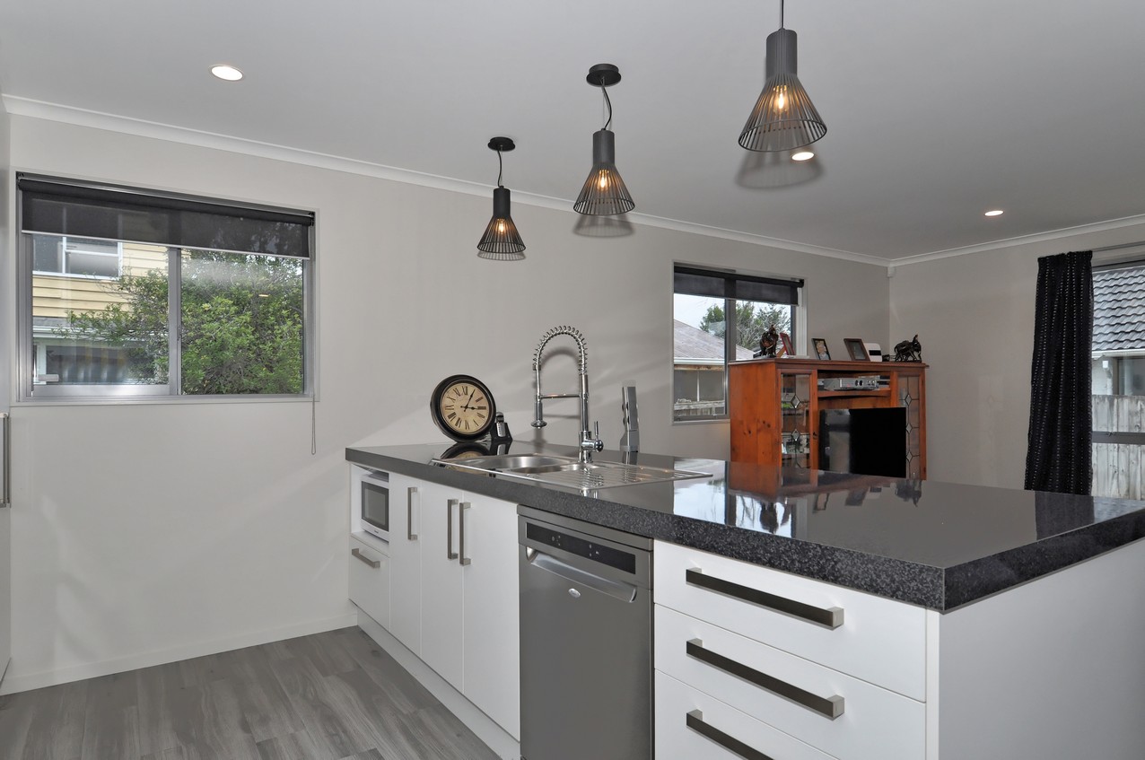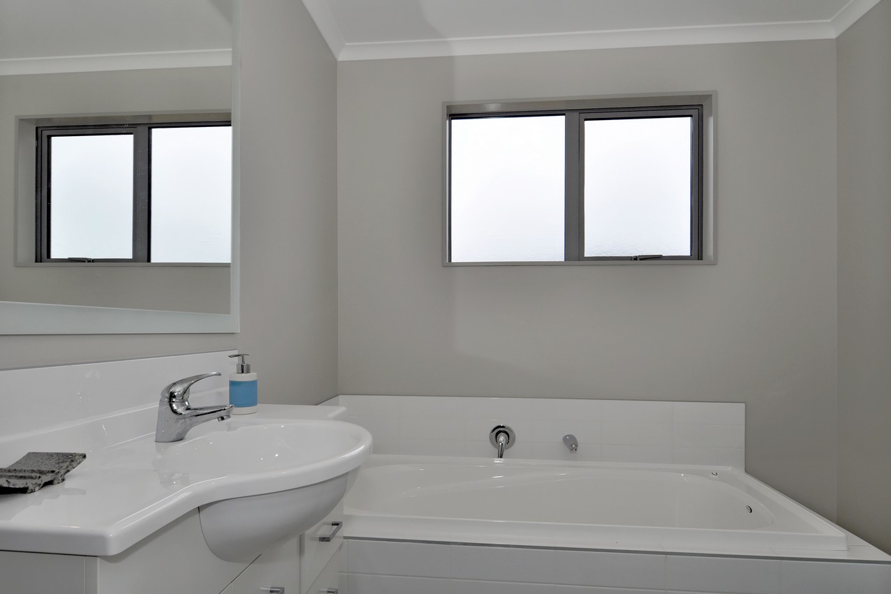 The classic palette flows to the interior of this home, creating a cohesive whole. The well-designed kitchen boasts a Bestwood Simply White finish with a Wilsonart Pure Gloss Black Scopia benchtop, which forms the centrepiece of the open-plan living-dining area. A heat pump keeps this shared family hub cosy. When its warm out, the paved area in the backyard is a real draw card. There’s even a lawn for the kids to run around on. Back inside, a separate family room incorporates a study nook, great for homework or a home office. Double cavity sliders allow the room to be closed or opened to the rest of the house. Three good-sized bedrooms, a separate laundry, alarm system, bathroom and an ensuite off the master bedroom omplete a practical package.