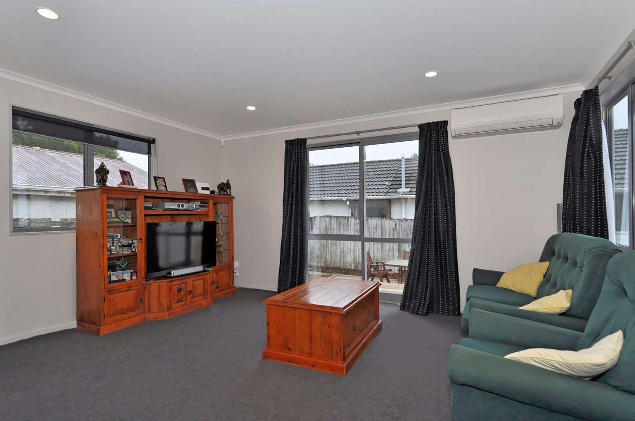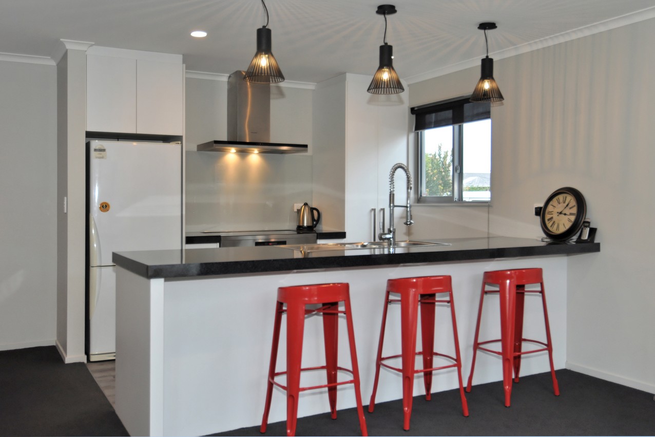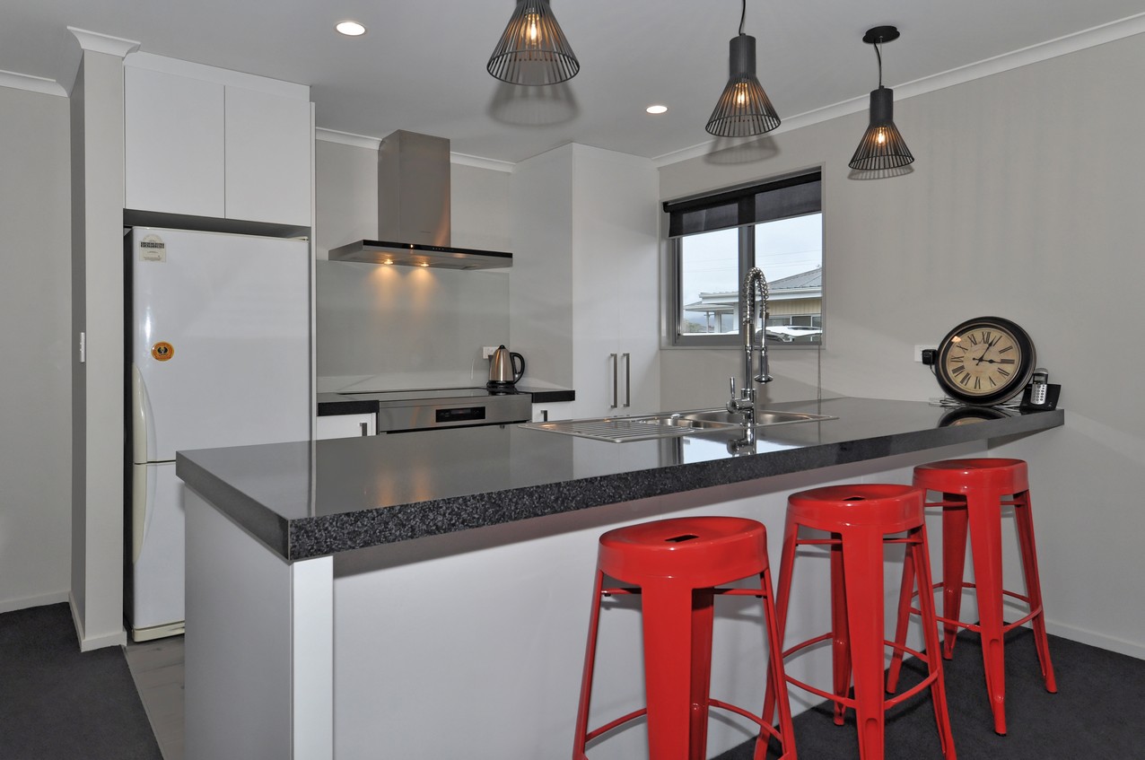 The classic palette flows to the interior of this home, creating a cohesive whole. The well-designed kitchen boasts a Bestwood Simply White finish with a Wilsonart Pure Gloss Black Scopia benchtop, which forms the centrepiece of the open-plan living-dining area. A heat pump keeps this shared family hub cosy. When its warm out, the paved area in the backyard is a real draw card. There’s even a lawn for the kids to run around on. Back inside, a separate family room incorporates a study nook, great for homework or a home office. Double cavity sliders allow the room to be closed or opened to the rest of the house. Three good-sized bedrooms, a separate laundry, alarm system, bathroom and an ensuite off the master bedroom omplete a practical package.
