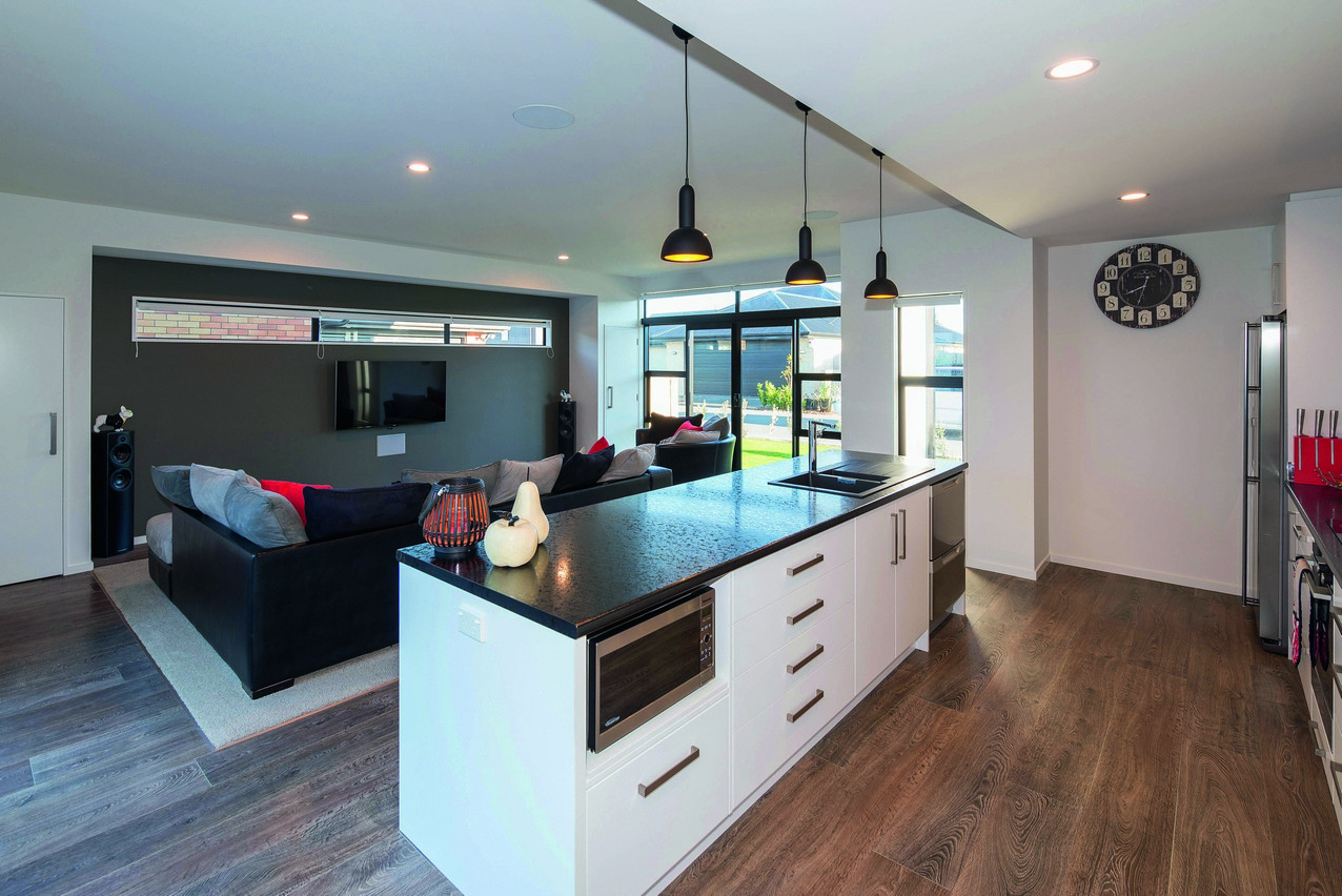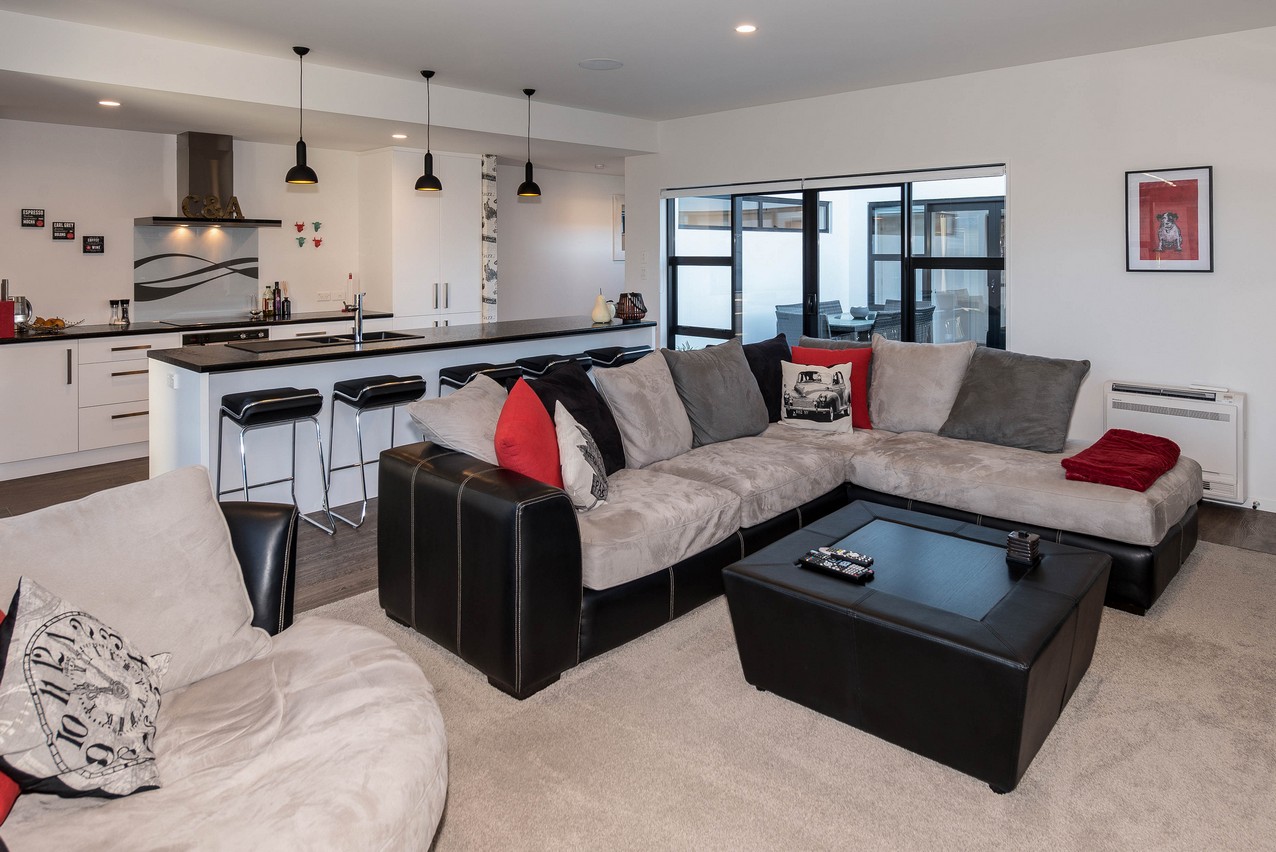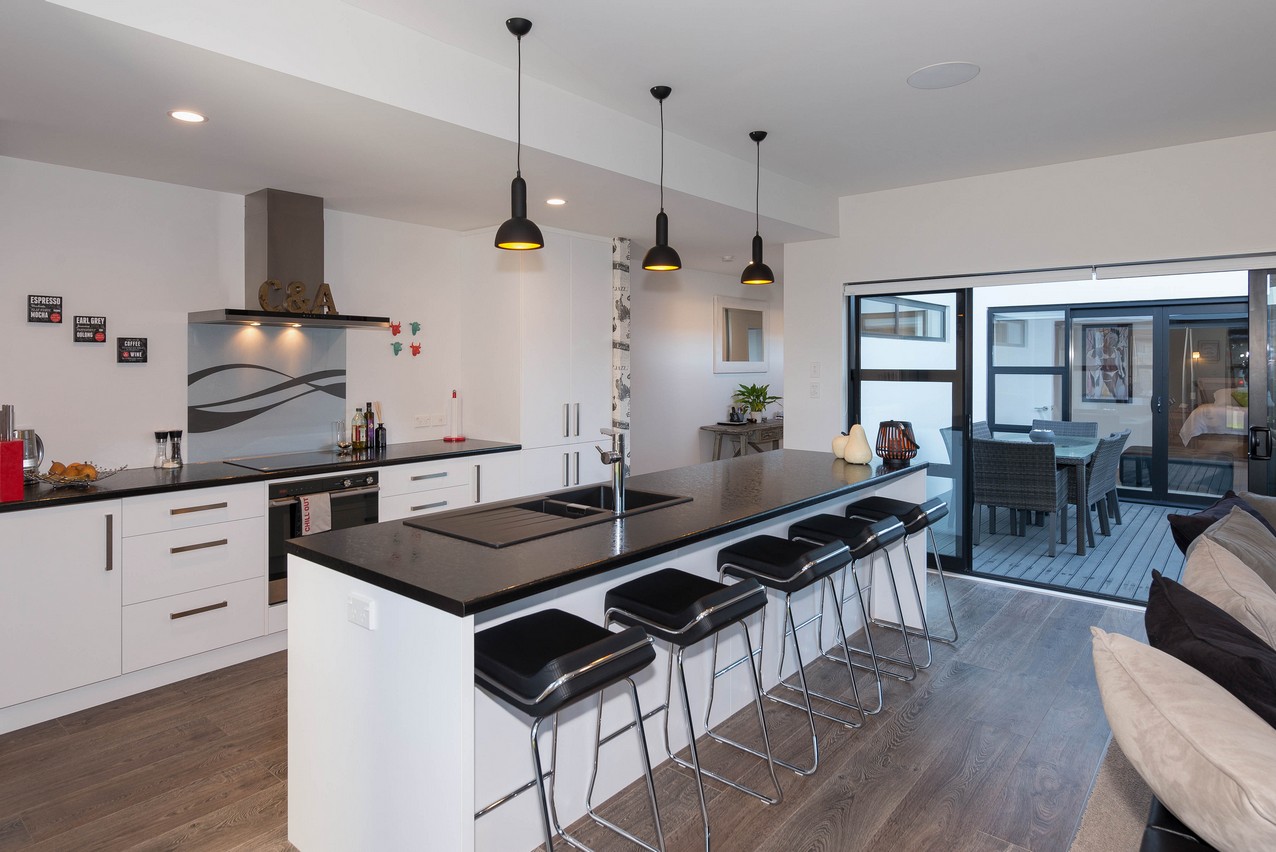 Rich flooring, white cabinetry and black benchtops create lovely layering in the modern kitchen. A bulkhead defines the space nicely. The kitchen island with seating for five holds a microwave and dish drawers. Overlooking the lounge, the chef can cook and keep up with the news. A recessed feature wall and carpeting clearly delineate the lounge space without the need for dividing walls. The open-plan enjoys easy access to central alfresco living, which suits the professionals who reside here. The space is sheltered from prevailing winds on three sides, making it a peaceful and private place to unwind or socialise with guests.
