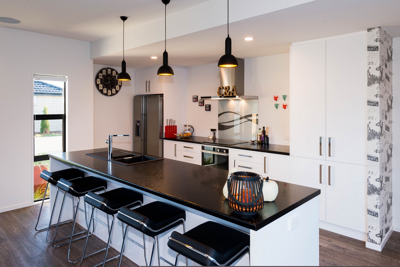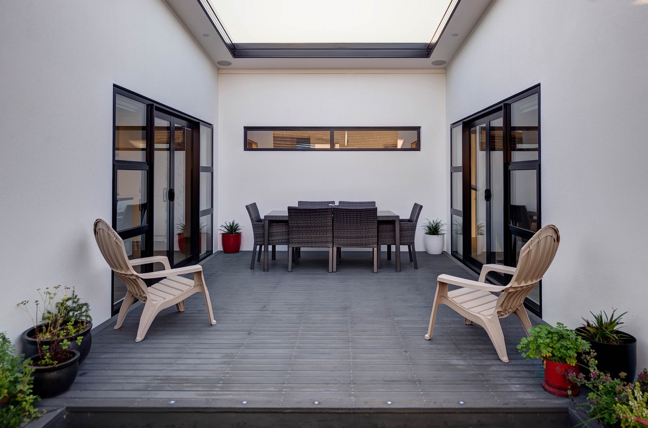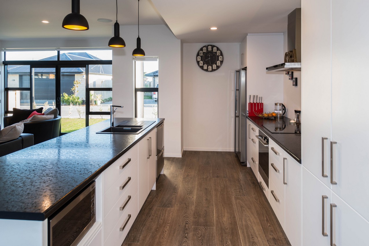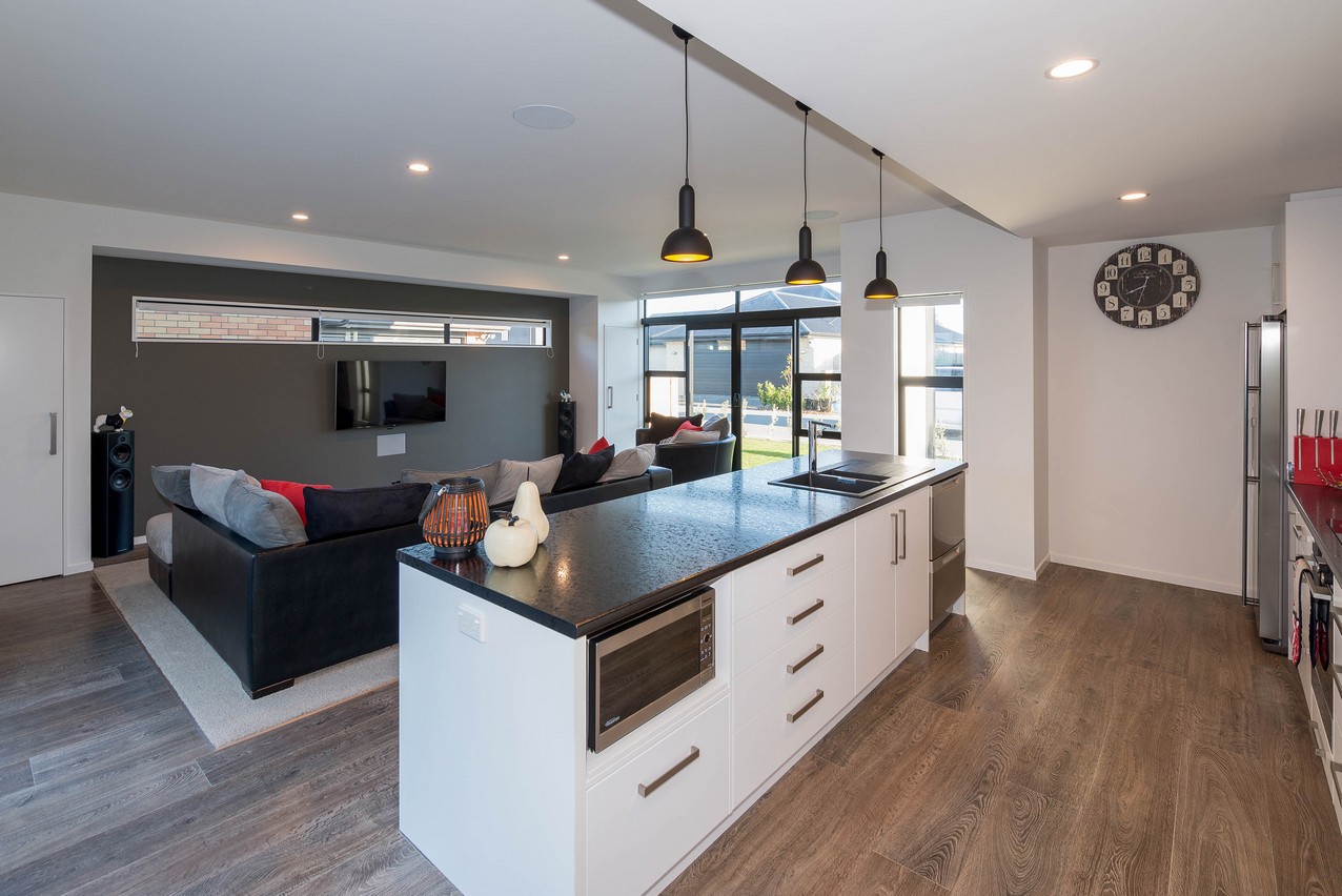 Rich flooring, white cabinetry and black benchtops create lovely layering in the modern kitchen. A bulkhead defines the space nicely. The kitchen island with seating for five holds a microwave and dish drawers. Overlooking the lounge, the chef can cook and keep up with the news. A recessed feature wall and carpeting clearly delineate the lounge space without the need for dividing walls. The open-plan enjoys easy access to central alfresco living, which suits the professionals who reside here. The space is sheltered from prevailing winds on three sides, making it a peaceful and private place to unwind or socialise with guests.