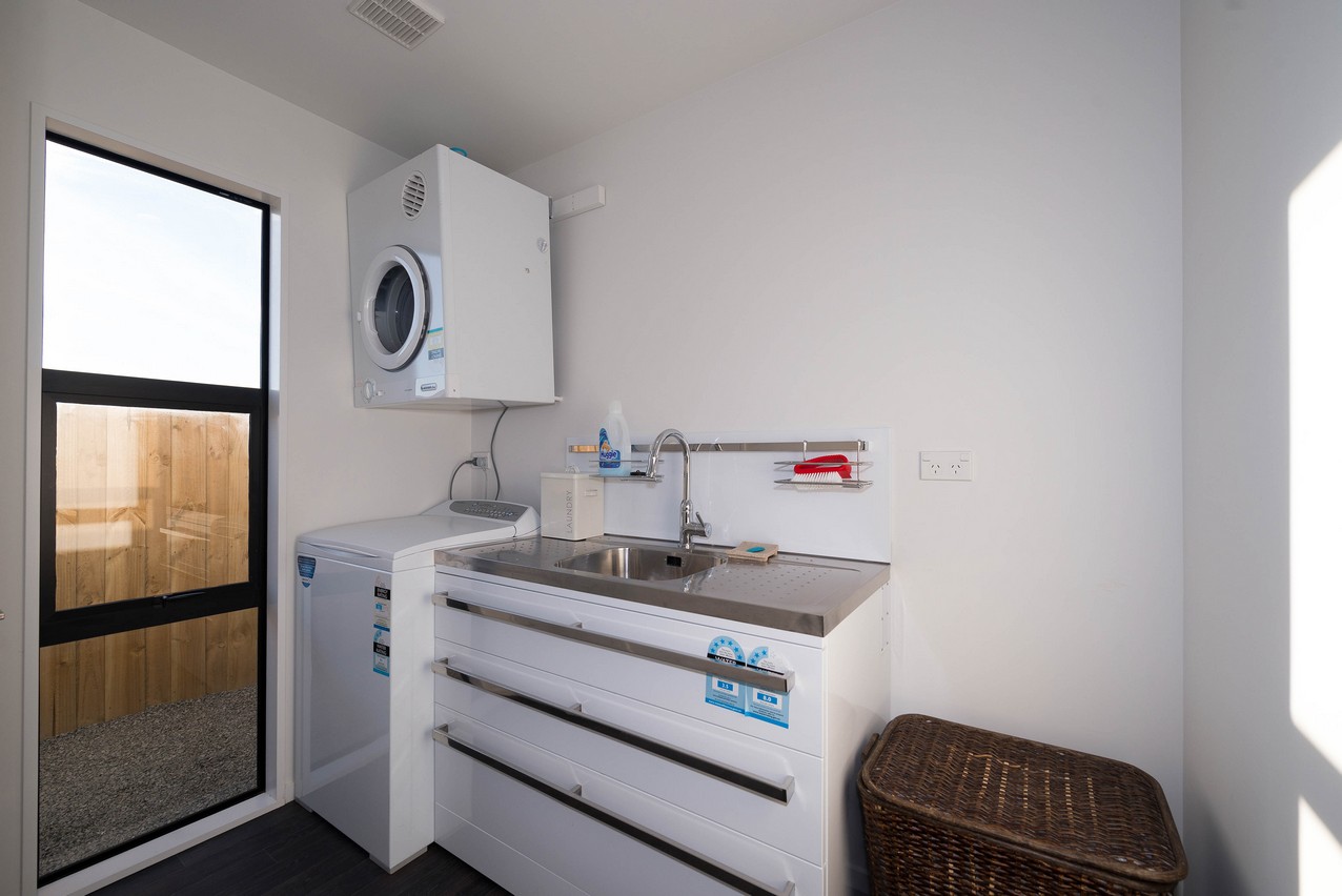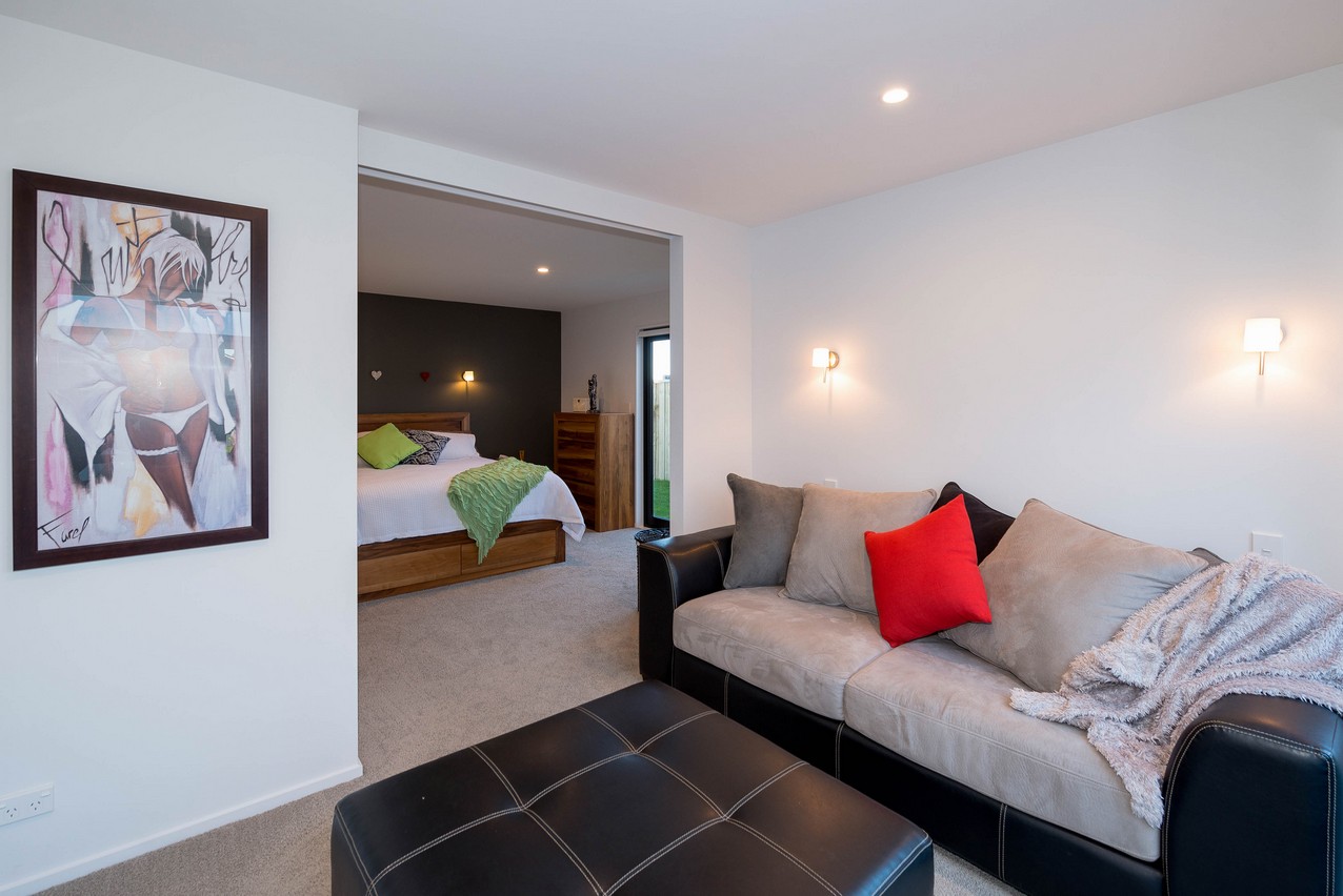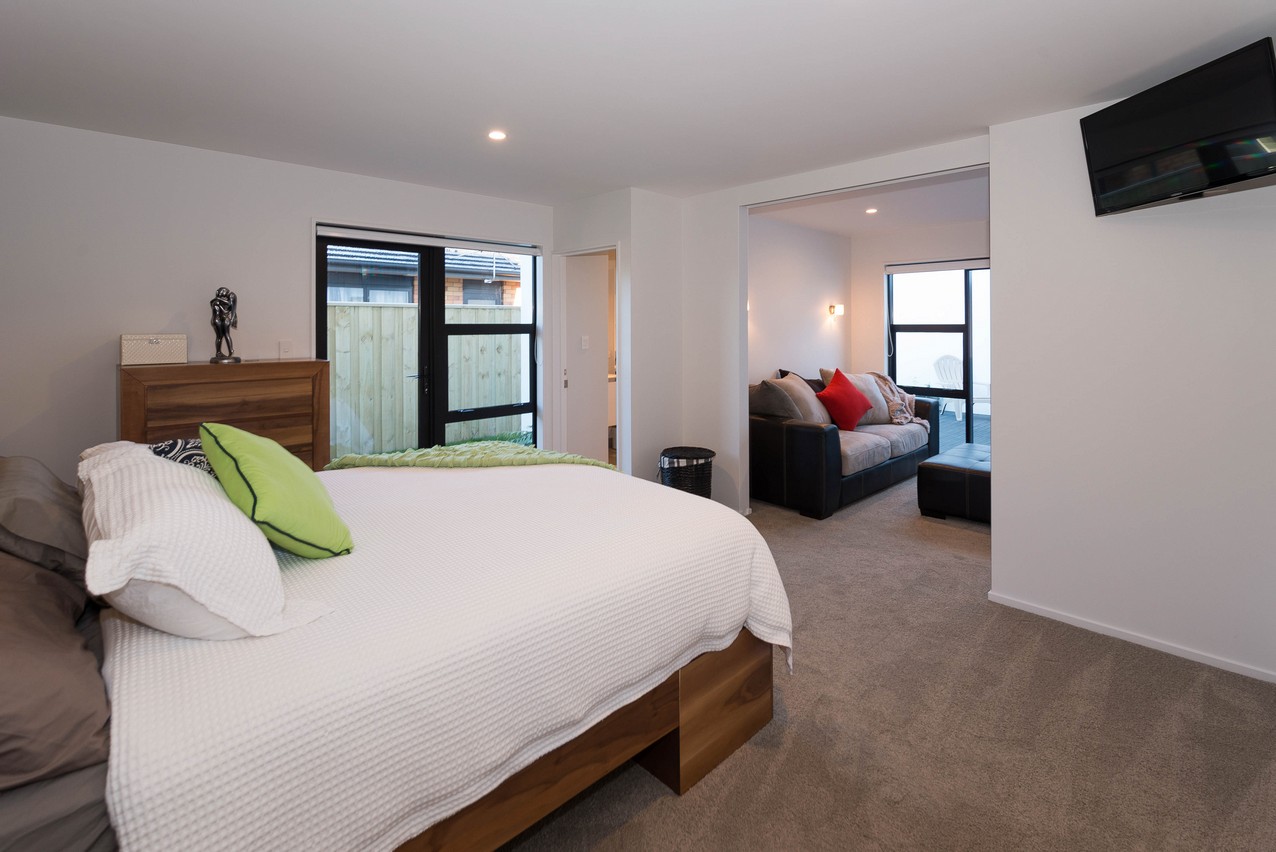 Continue across the deck to the superbly designed master suite. Its adjoining lounge with built-in wardrobe is practical and relaxing, allowing the residents their own space when required. Buried a little further back, the sleeping quarters beckon with their elegant feature wall and ensuite. Plush carpet adds extra luxury underfoot. Discreetly tucked away, the ensuite boasts a glazed shower and modern fixtures, fittings and storage. The main bathroom incorporates a dual tub-shower, partially glazed to avoid any off-spray. A separate laundry allows this necessary chore to be kept out of the way. A crisp, clean colour palette ties the whole home together, and is enhanced by natural light from the well-placed windows. The three bedrooms enjoy separate access to the rear yard.