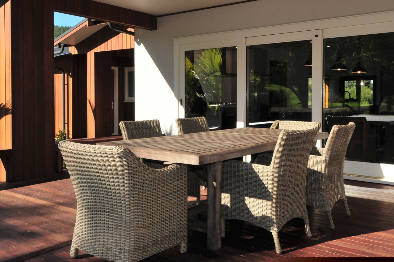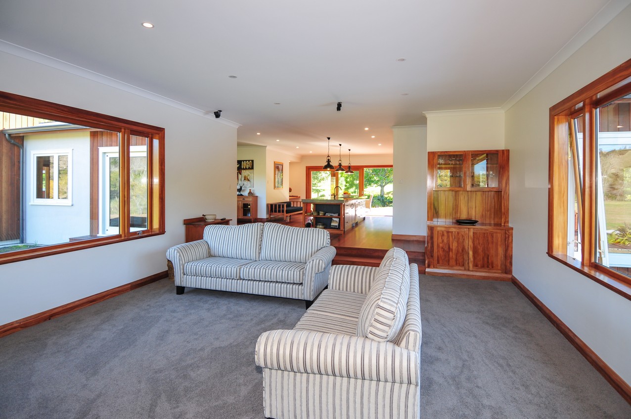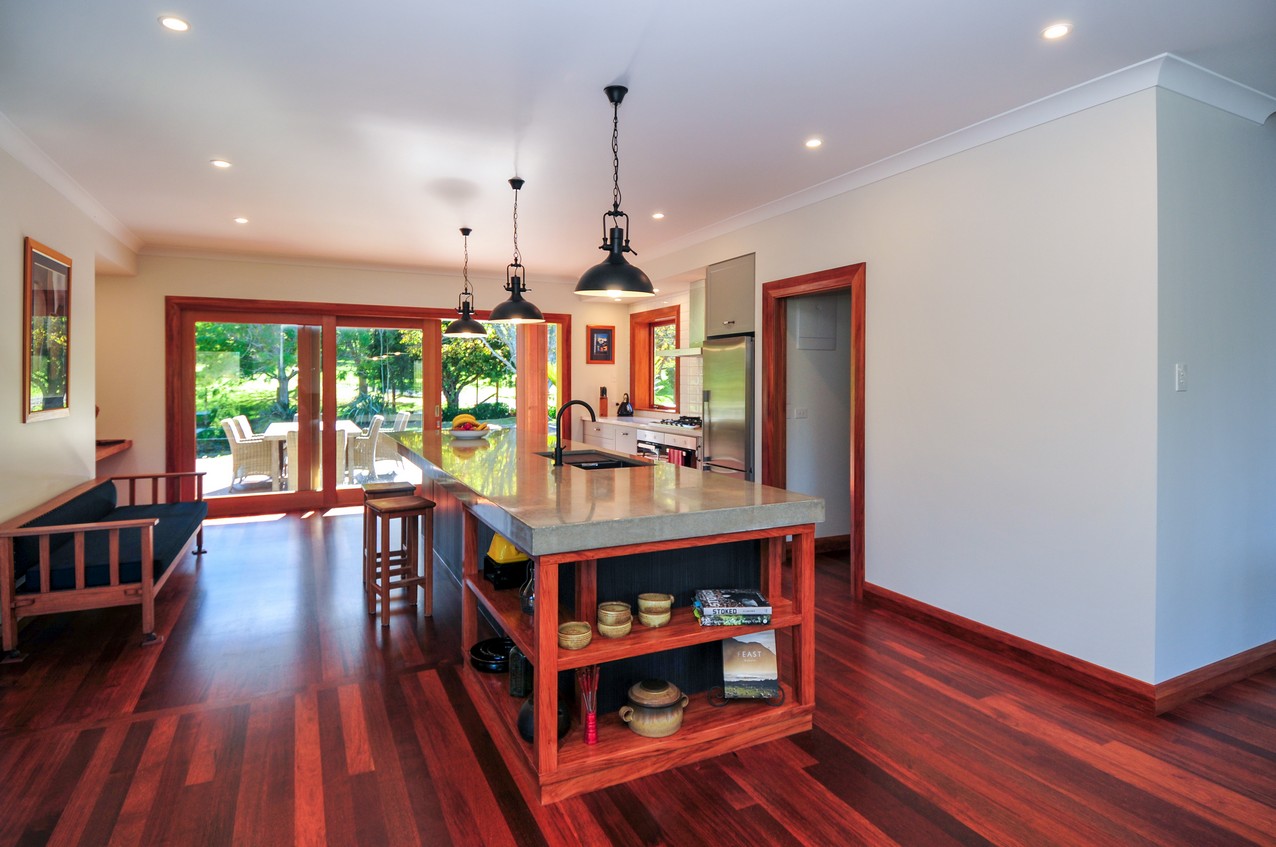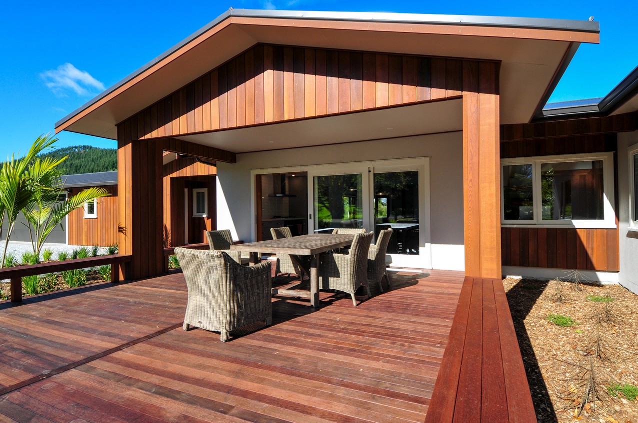 Tying in beautifully to the outdoor decking, the interior’s kwila floor sets off the eye-catching joinery. All the trims and doors are cedar or rimu throughout. Step down from the kitchen to the spacious central living area. The impressive 3m-high stud enhances the sense of space and light. The separate dining area provides a more formal setting for dinner parties or special occasions. Warmth emanates from a large granite hearth flanked by feature wood cupboards. A second fireplace can be found in the family room. Cedar sliding doors allow the formal dining room to be opened up on balmy evenings; the adjoining deck also serves the master bedroom. Orientation of the main deck, meanwhile, has put the existing pool at the heart of everyday life. The new entertainer’s kitchen is a dream space for anyone passionate about making great food. The polished concrete slab benchtop provides a sleek and hard-wearing work surface. A scullery allows extra appliances to be kept out of sight. Positioned close to the family dining room, the spacious central island also serves the covered alfresco area. It’s a lovely place to relax and soak up the relaxed surroundings. The sliding doors foster flow outdoors. Two of the three bathrooms boast floor-to-ceiling tiles, rimu vanities and underfloor heating. The third bathroom – once a detached garage – incorporates a workstation and laundry; it serves swimmers, and grubby youngsters returning from rugby training.