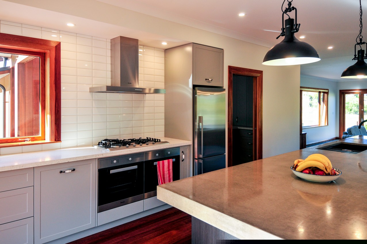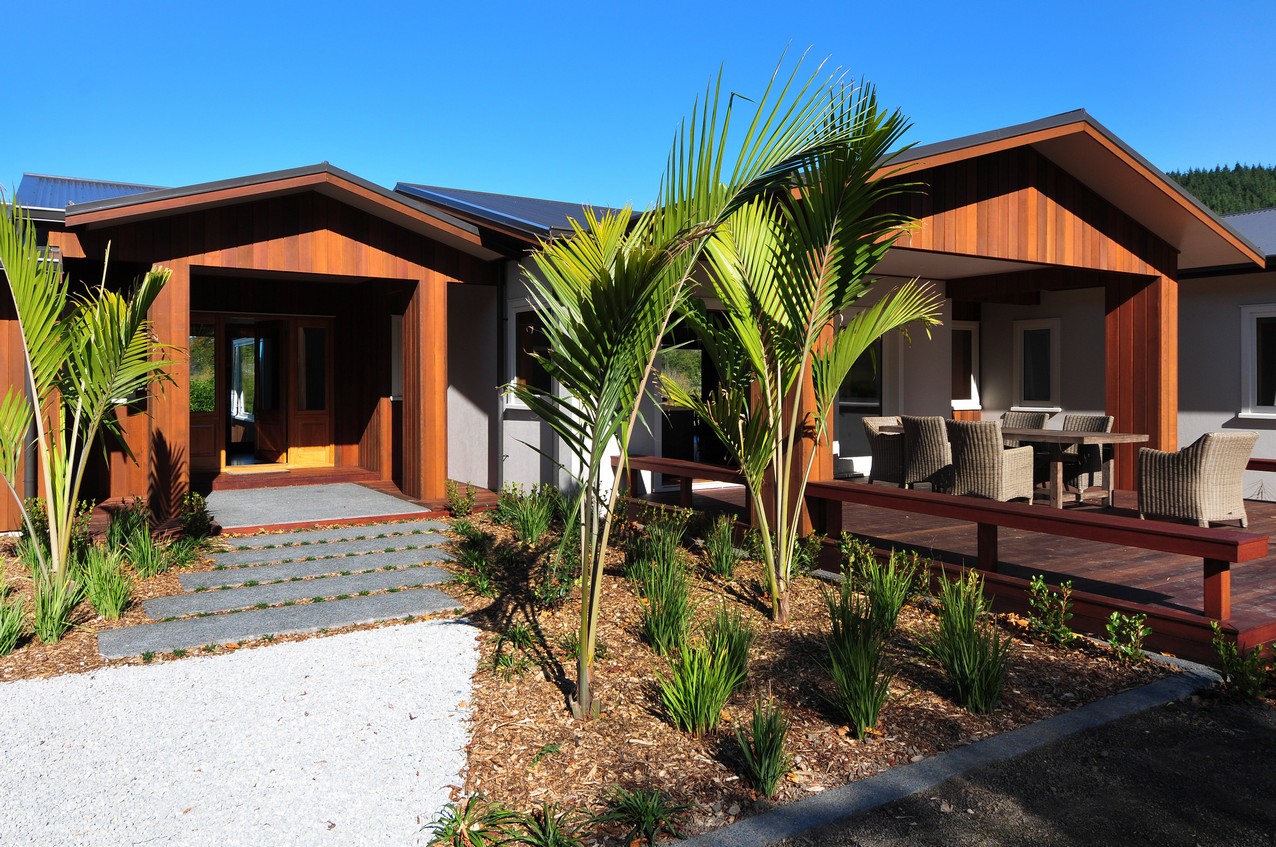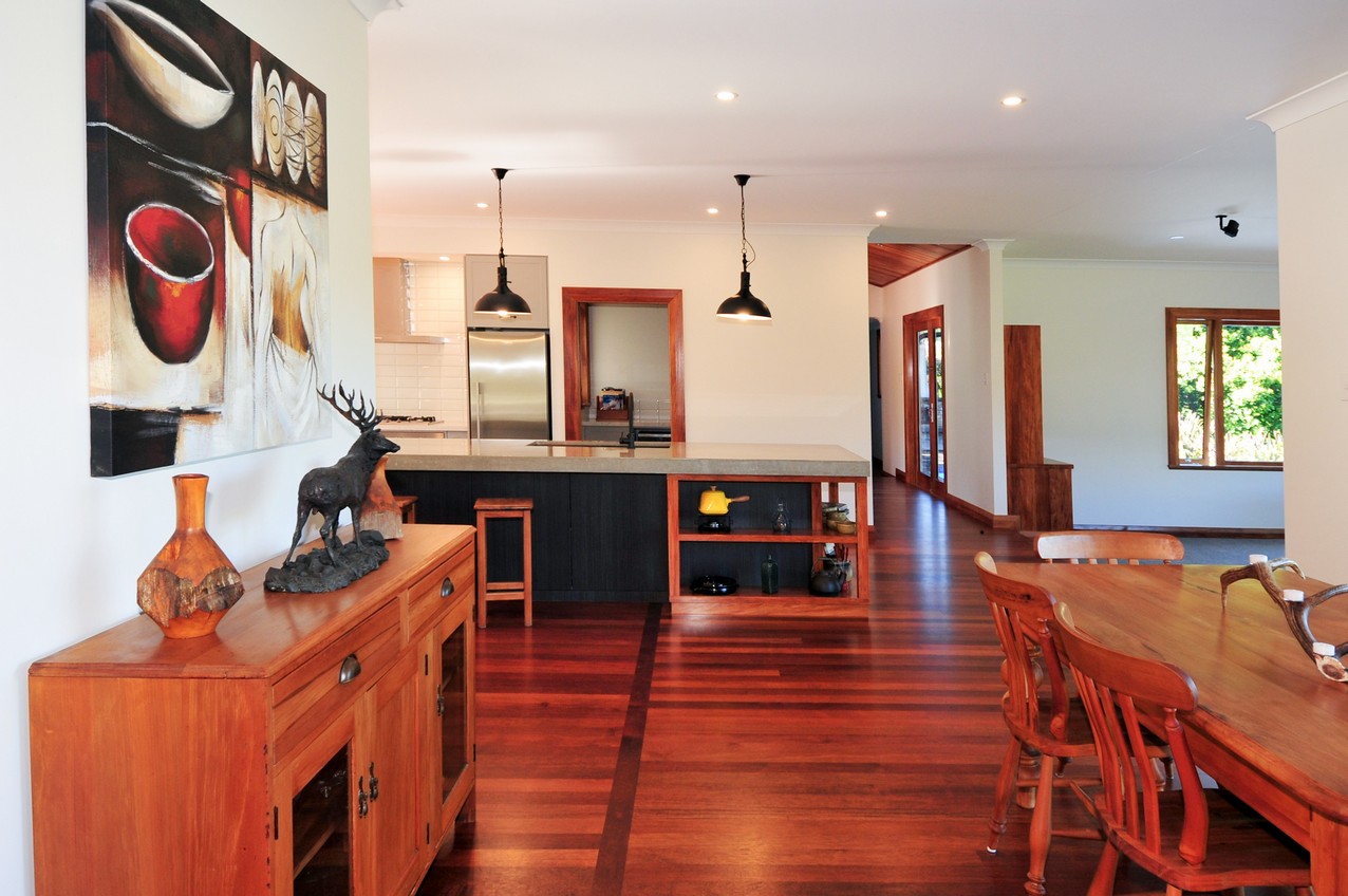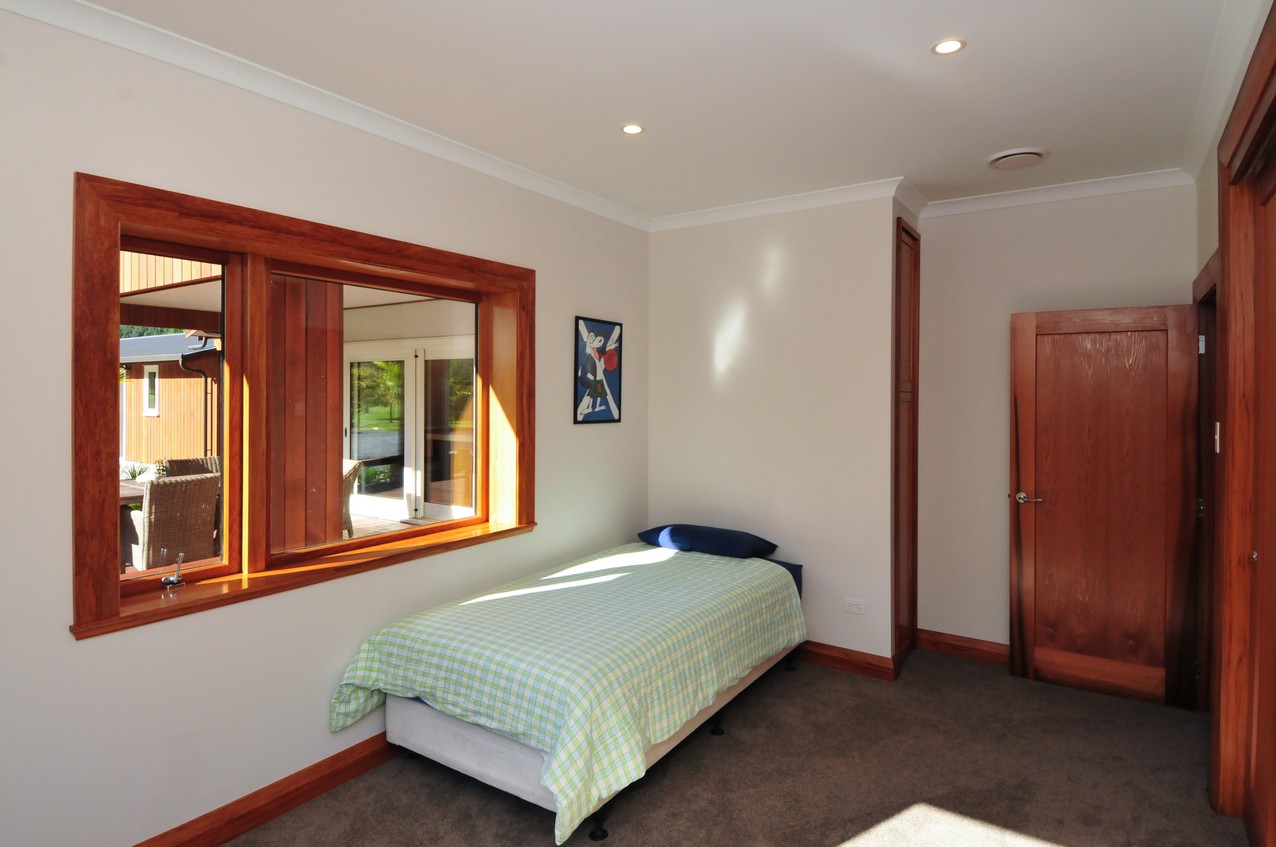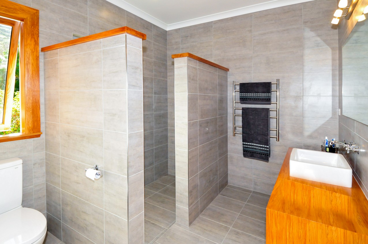 Tying in beautifully to the outdoor decking, the interior’s kwila floor sets off the eye-catching joinery. All the trims and doors are cedar or rimu throughout. Step down from the kitchen to the spacious central living area. The impressive 3m-high stud enhances the sense of space and light. The separate dining area provides a more formal setting for dinner parties or special occasions. Warmth emanates from a large granite hearth flanked by feature wood cupboards. A second fireplace can be found in the family room. Cedar sliding doors allow the formal dining room to be opened up on balmy evenings; the adjoining deck also serves the master bedroom. Orientation of the main deck, meanwhile, has put the existing pool at the heart of everyday life. The new entertainer’s kitchen is a dream space for anyone passionate about making great food. The polished concrete slab benchtop provides a sleek and hard-wearing work surface. A scullery allows extra appliances to be kept out of sight. Positioned close to the family dining room, the spacious central island also serves the covered alfresco area. It’s a lovely place to relax and soak up the relaxed surroundings. The sliding doors foster flow outdoors. Two of the three bathrooms boast floor-to-ceiling tiles, rimu vanities and underfloor heating. The third bathroom – once a detached garage – incorporates a workstation and laundry; it serves swimmers, and grubby youngsters returning from rugby training.