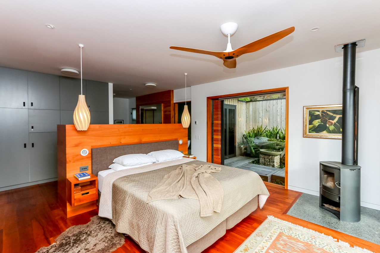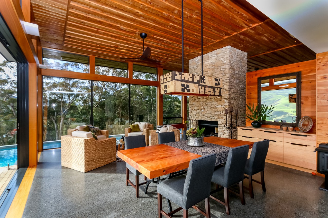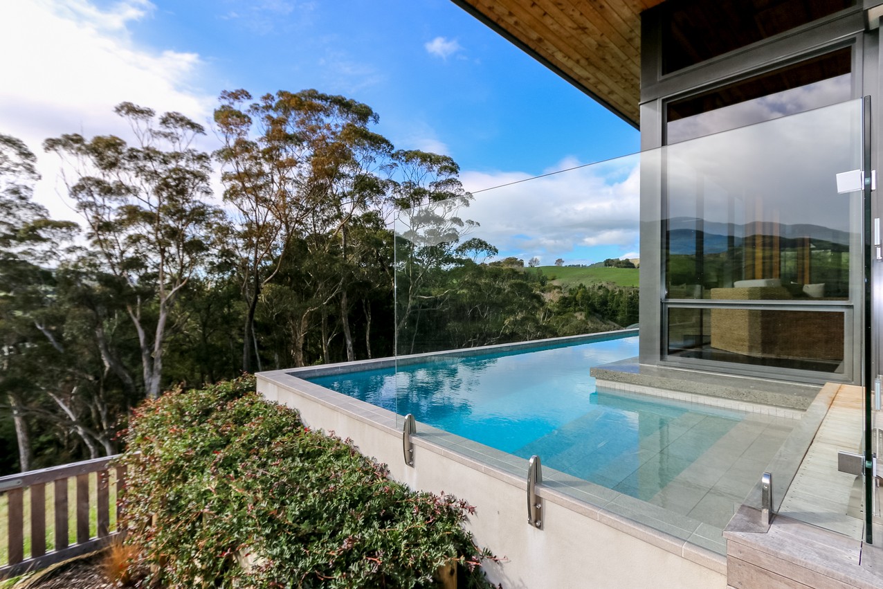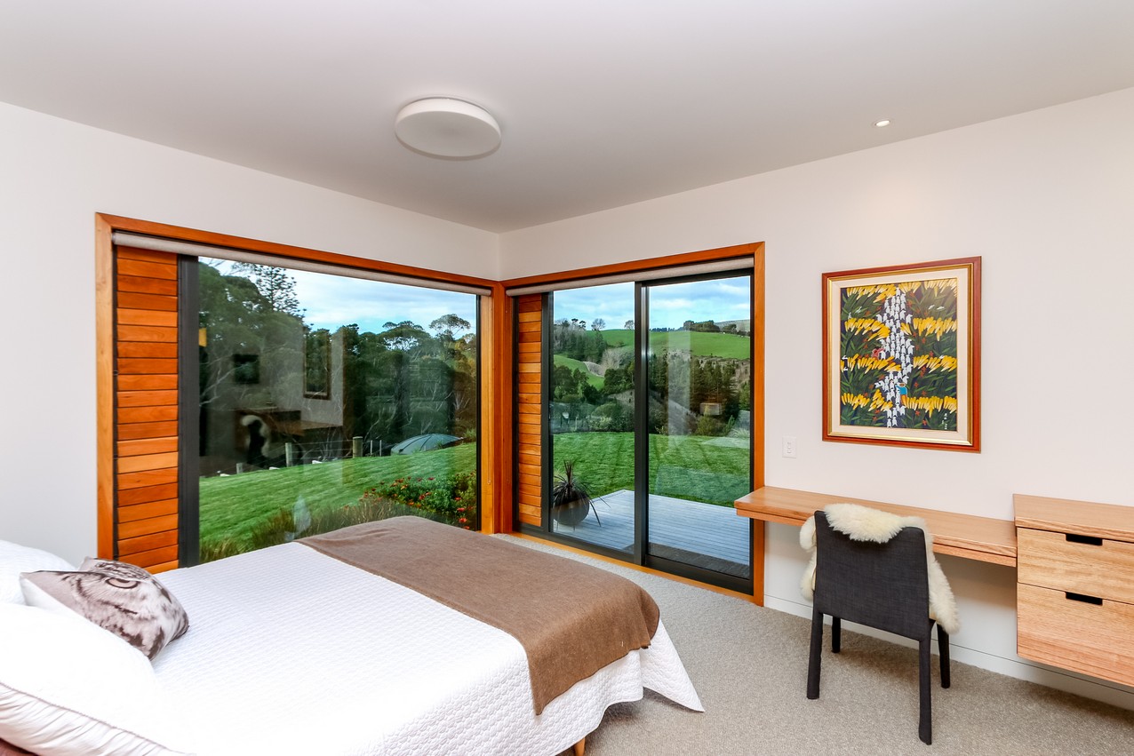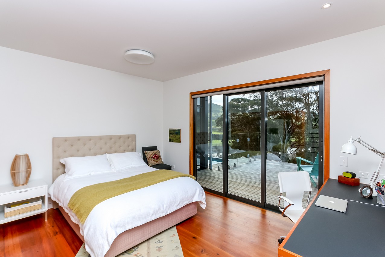 An inviting lap pool wraps around the home, offering unimpeded views of the countryside from the water’s edge. A cantilevered rooftop is its crowning glory. Back inside the living space, 3.6m ceilings draw gasps of admiration from guests. Views and natural light flood in through masses of glass. A full-height limestone fireplace commands attention and offers comfort on cold nights. A total of five timber decks are cleverly positioned for any weather or time of day. Floor-to-ceiling cavity sliders allow open spaces to merge on the generous 302sqm footprint. Three bedrooms accommodate the family of three and their frequent long-term guests. A mixture of recycled matai and polished concrete floors are practical, yet pleasing to the eye. Well- crafted built-ins provide storage and interest. Pre-cast concrete walls conceal wet-floor showers in two of the three bathrooms.