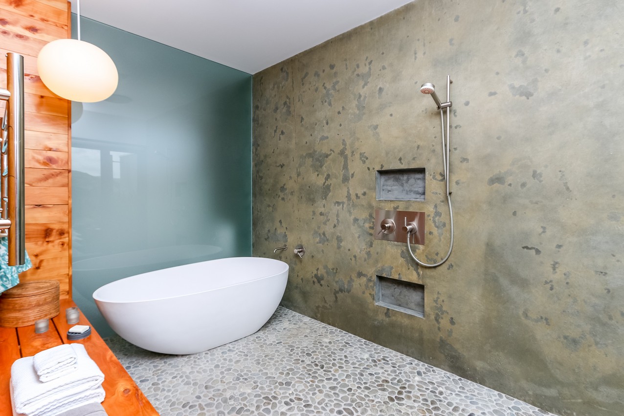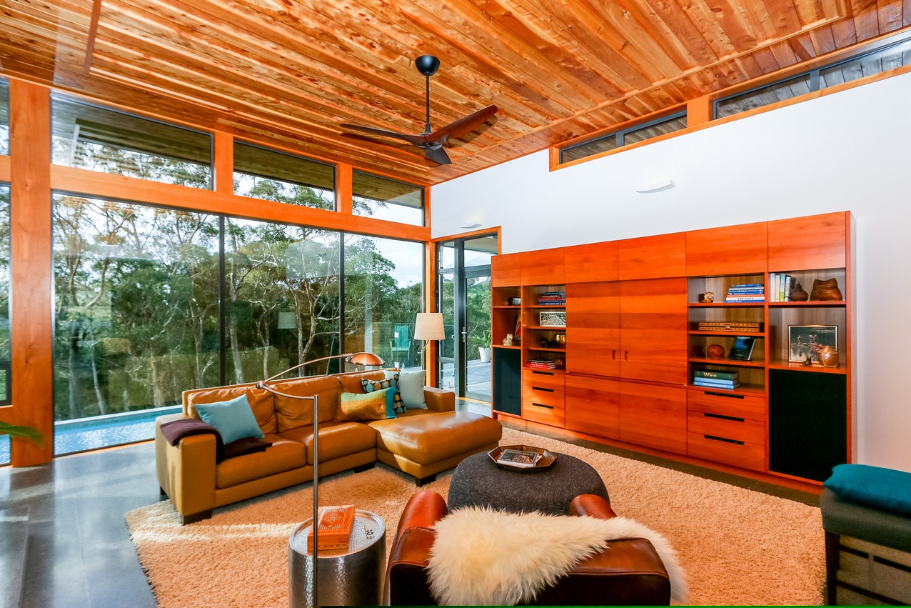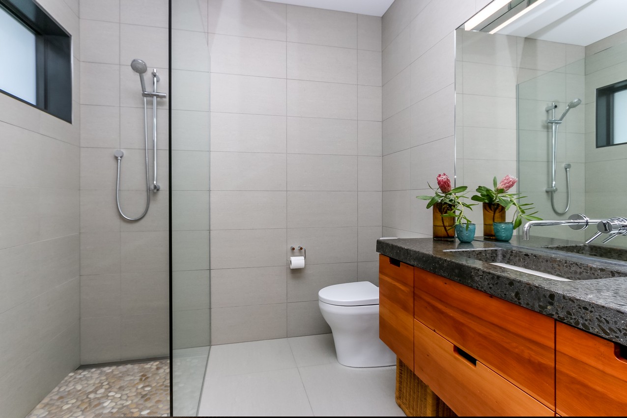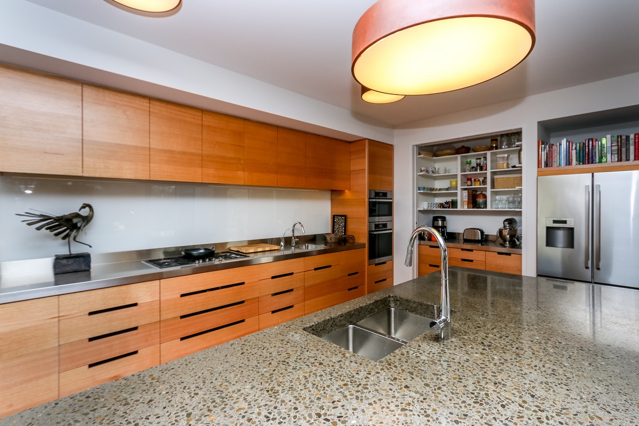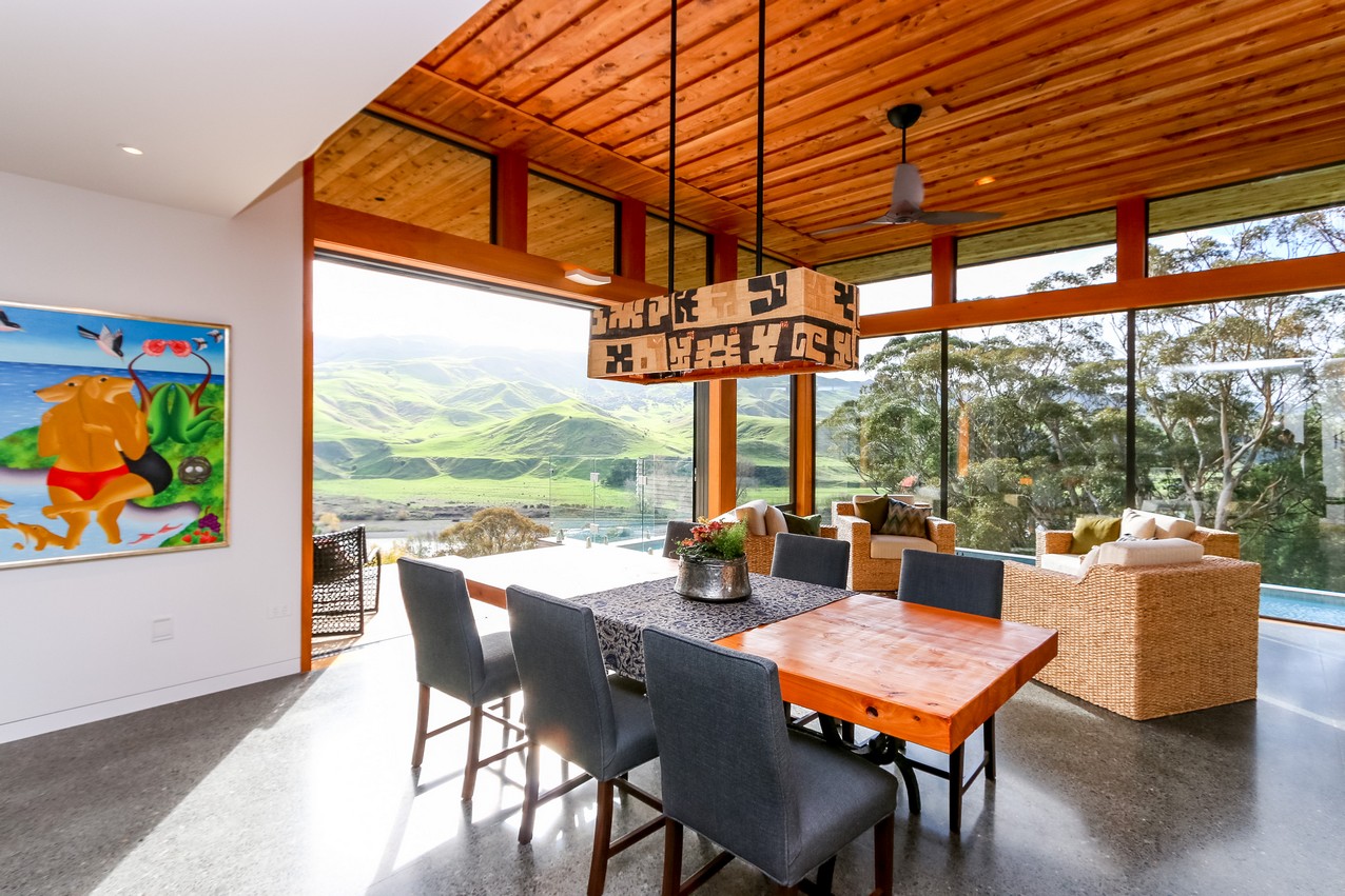 An inviting lap pool wraps around the home, offering unimpeded views of the countryside from the water’s edge. A cantilevered rooftop is its crowning glory. Back inside the living space, 3.6m ceilings draw gasps of admiration from guests. Views and natural light flood in through masses of glass. A full-height limestone fireplace commands attention and offers comfort on cold nights. A total of five timber decks are cleverly positioned for any weather or time of day. Floor-to-ceiling cavity sliders allow open spaces to merge on the generous 302sqm footprint. Three bedrooms accommodate the family of three and their frequent long-term guests. A mixture of recycled matai and polished concrete floors are practical, yet pleasing to the eye. Well- crafted built-ins provide storage and interest. Pre-cast concrete walls conceal wet-floor showers in two of the three bathrooms.