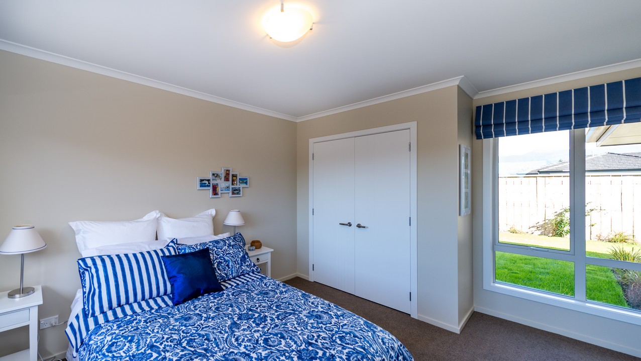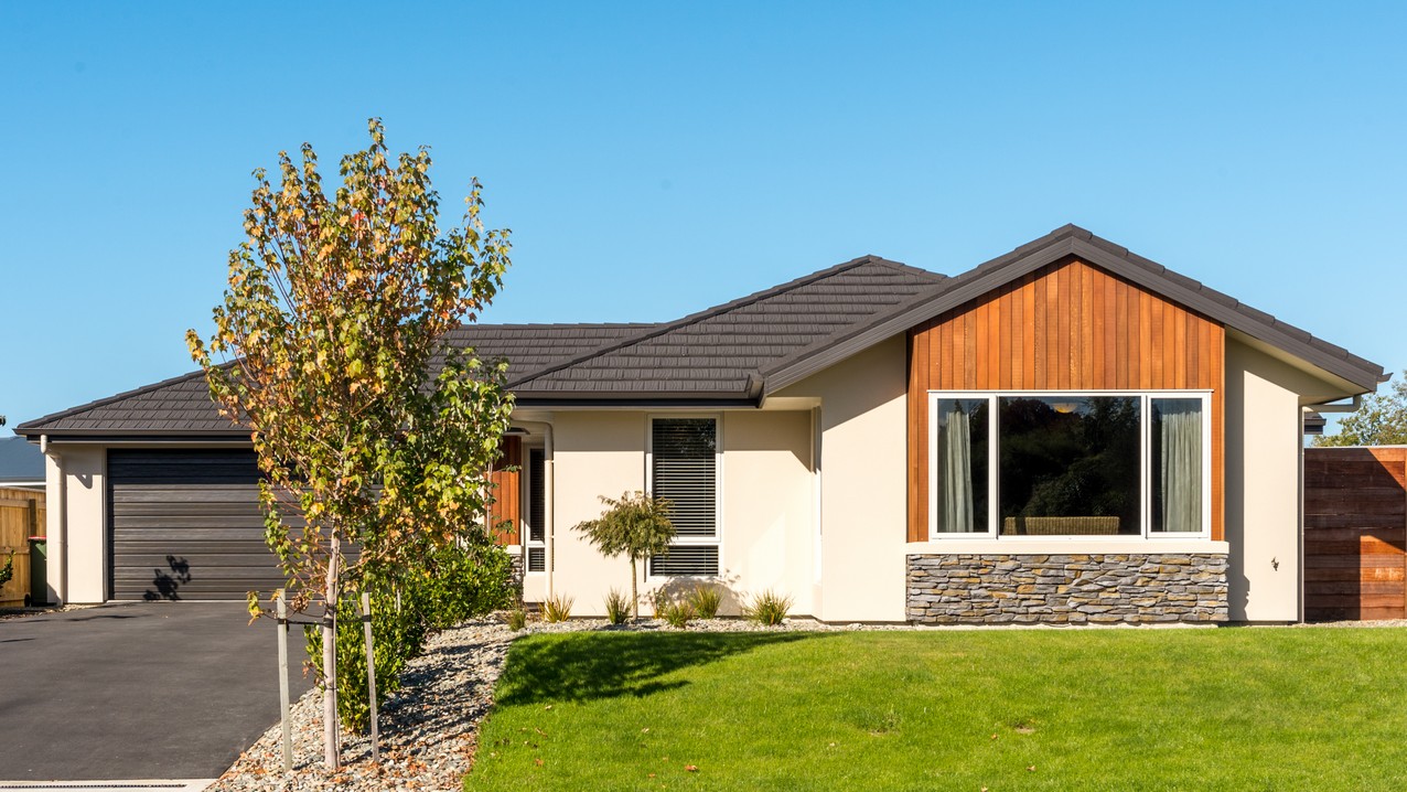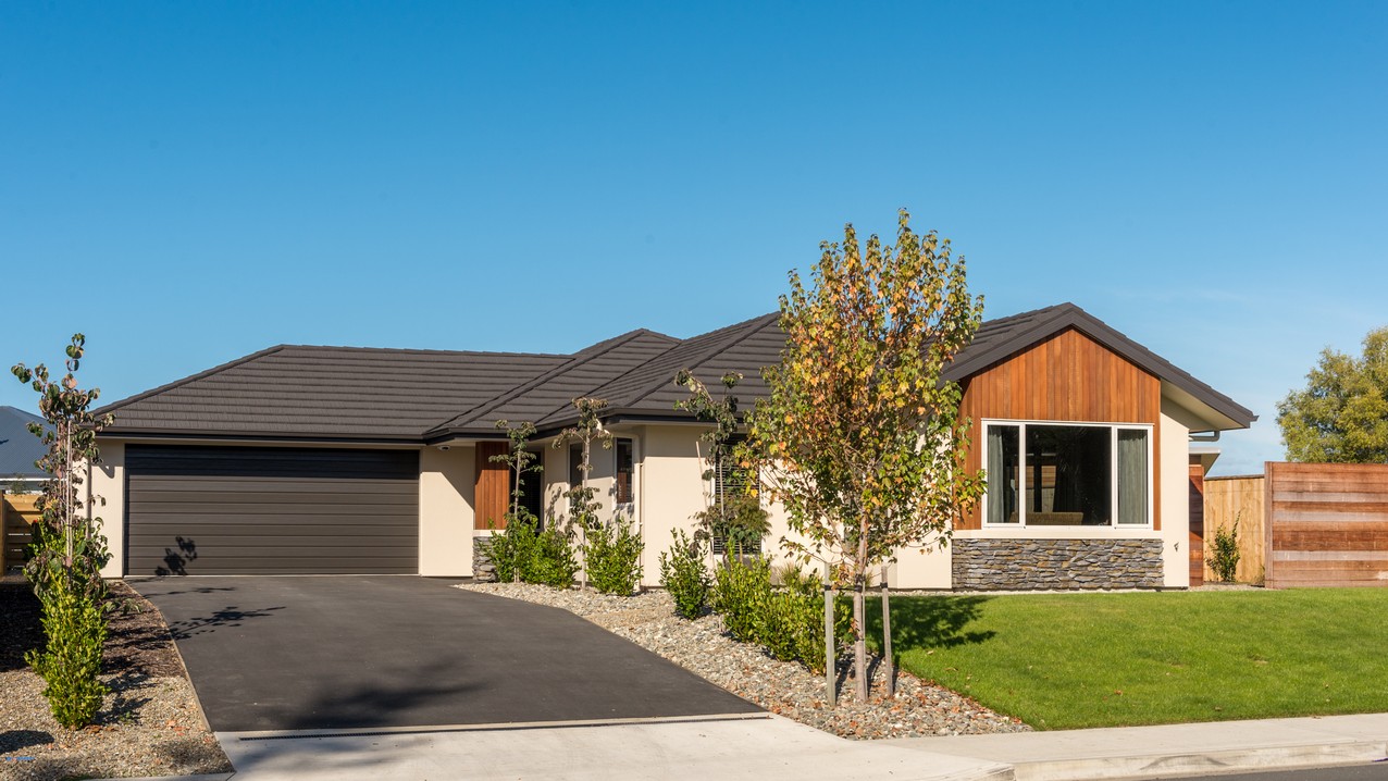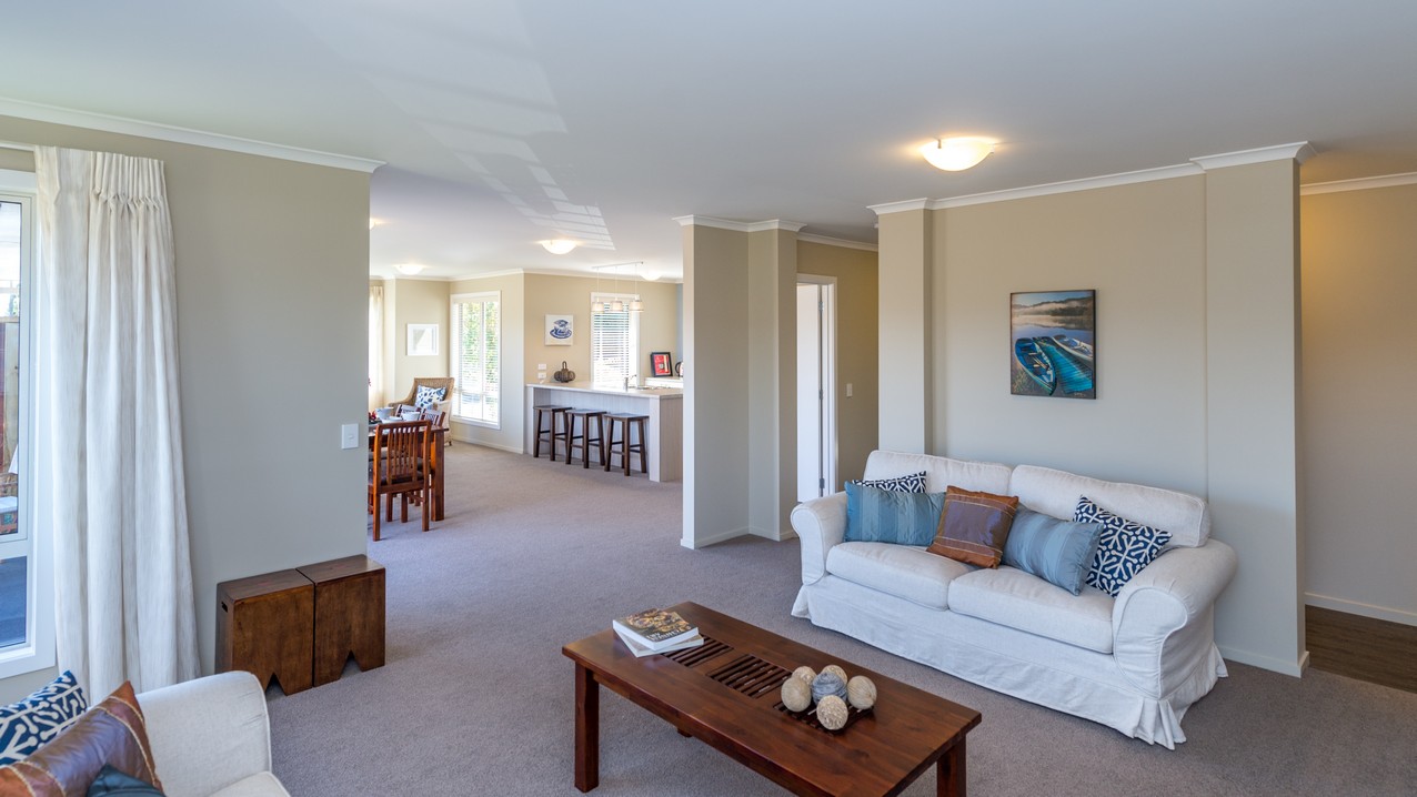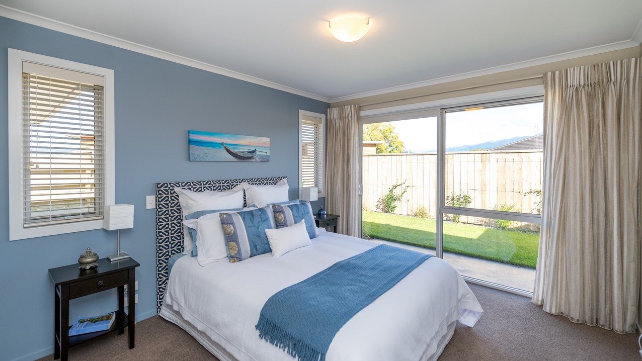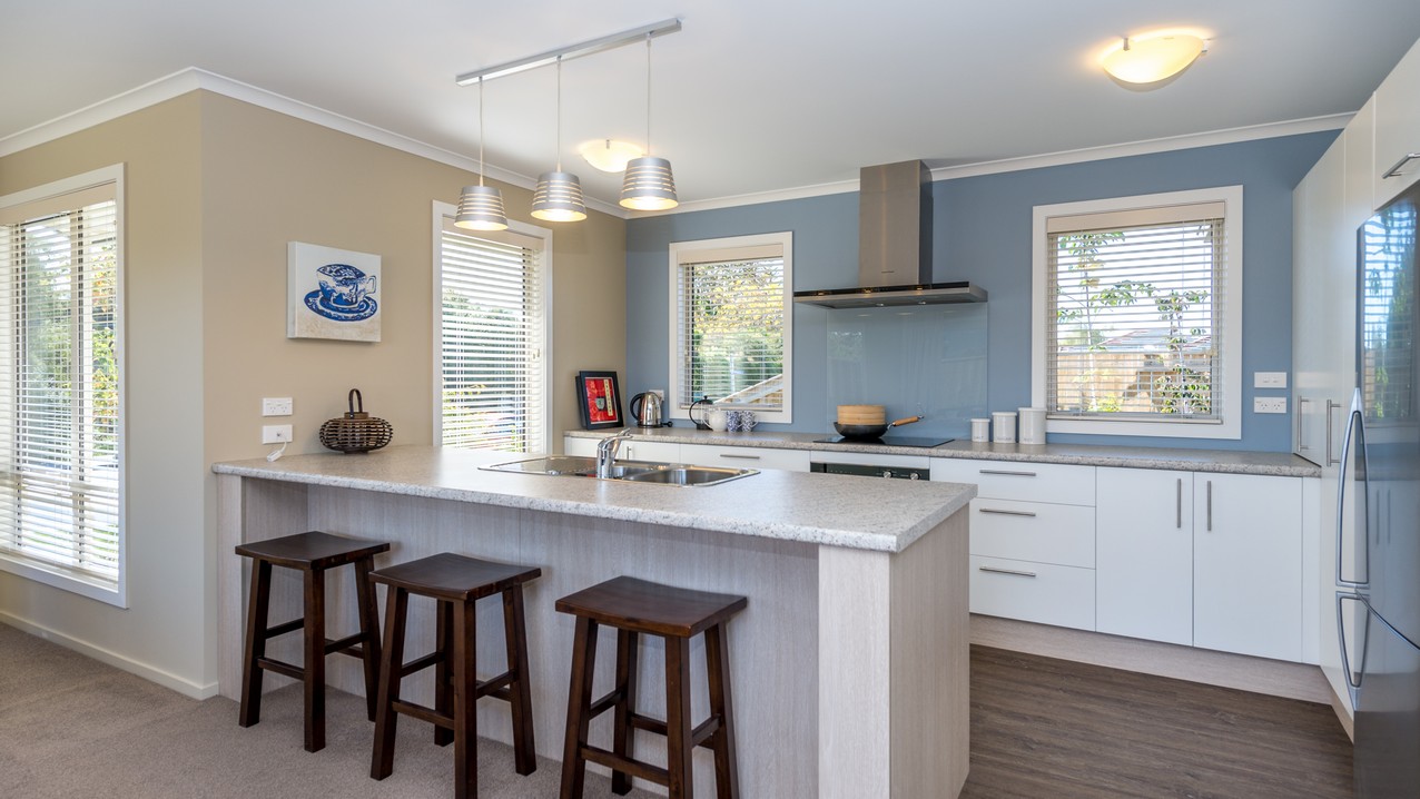 The 186sqm house makes a strong statement in cedar with stone pillars and trim. A set of privacy walls tastefully screen off the outdoor seating area so residents can soak up the scenery in peace until the sun sets behind the western mountains. The lovely low-maintenance landscaping is in keeping with the home’s easy-care nature. The spacious open-plan living-dining area is warm and welcoming. A large dining table caters to formal dining occasions. Glass sliders foster flow to the outdoors or can simply be opened to enjoy relaxing summer breezes. An energy-efficient heatpump ensures the whole home stays warm throughout winter. With lots of drawers, an above-bench pantry and a sink in the island bar, everything – including company – is close at hand in the kitchen. The cook can easily chat to guests while washing up or preparing after- dinner coffee. A relaxing blue (El Nino) wall defines this space nicely. Combined with the surrounding beige, a kind of ‘sea and sand’ effect is achieved. Large windows ensure the cook’s never kept in the dark. The separate lounge provides a quiet retreat for watching television or reading. Corner windows capture all-day sun. With three bedrooms and a large, light-filled main bathroom, there will be no shortage of visitors. The master bedroom has views to the mountains and features an ensuite and walk-in wardrobe. A glazed sliding door opens to the patio where morning coffee can be enjoyed alfresco.
