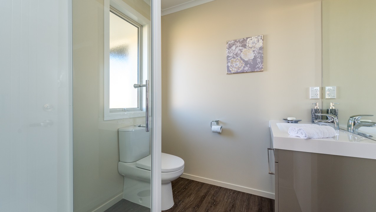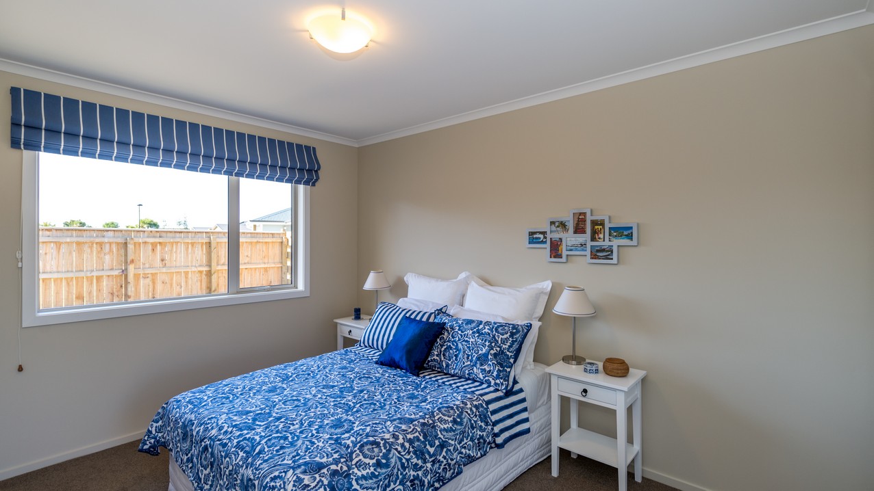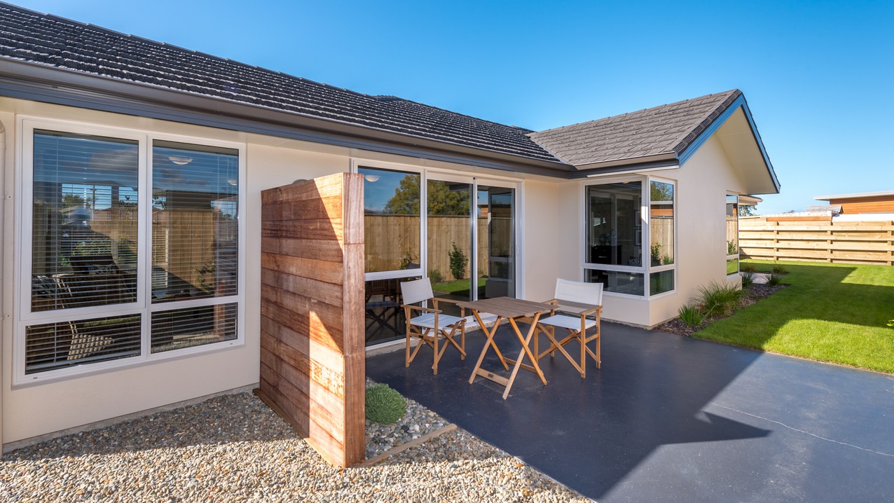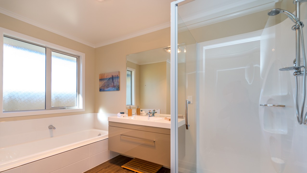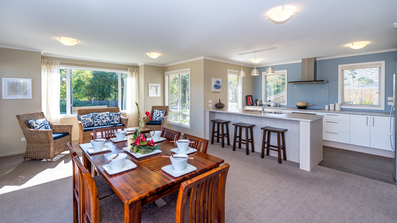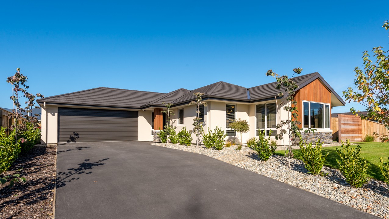 The 186sqm house makes a strong statement in cedar with stone pillars and trim. A set of privacy walls tastefully screen off the outdoor seating area so residents can soak up the scenery in peace until the sun sets behind the western mountains. The lovely low-maintenance landscaping is in keeping with the home’s easy-care nature. The spacious open-plan living-dining area is warm and welcoming. A large dining table caters to formal dining occasions. Glass sliders foster flow to the outdoors or can simply be opened to enjoy relaxing summer breezes. An energy-efficient heatpump ensures the whole home stays warm throughout winter. With lots of drawers, an above-bench pantry and a sink in the island bar, everything – including company – is close at hand in the kitchen. The cook can easily chat to guests while washing up or preparing after- dinner coffee. A relaxing blue (El Nino) wall defines this space nicely. Combined with the surrounding beige, a kind of ‘sea and sand’ effect is achieved. Large windows ensure the cook’s never kept in the dark. The separate lounge provides a quiet retreat for watching television or reading. Corner windows capture all-day sun. With three bedrooms and a large, light-filled main bathroom, there will be no shortage of visitors. The master bedroom has views to the mountains and features an ensuite and walk-in wardrobe. A glazed sliding door opens to the patio where morning coffee can be enjoyed alfresco.
