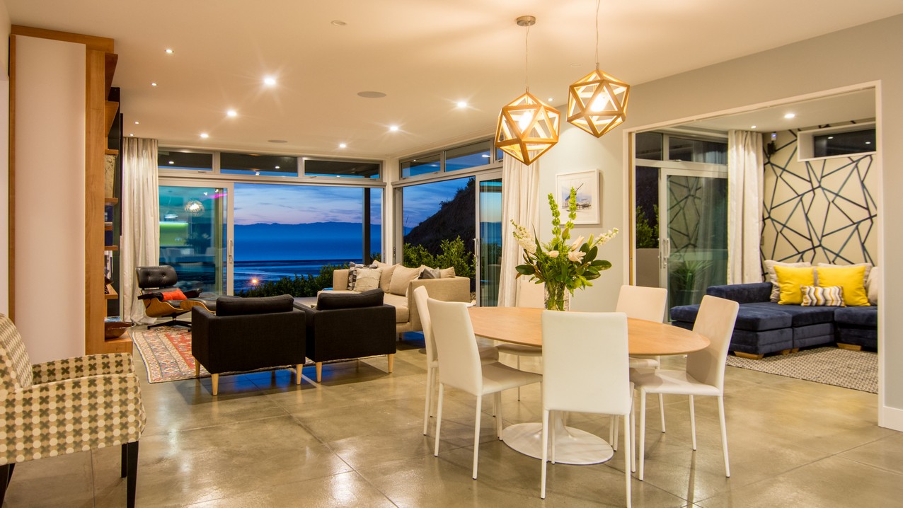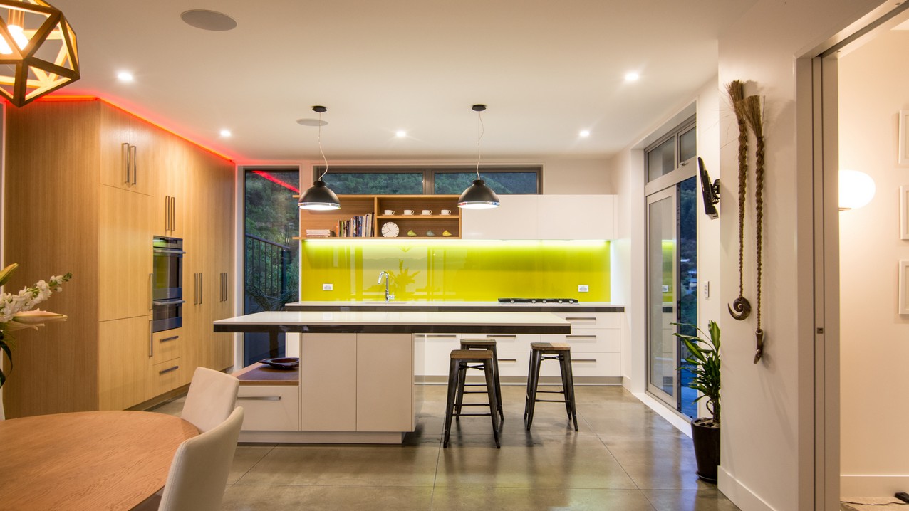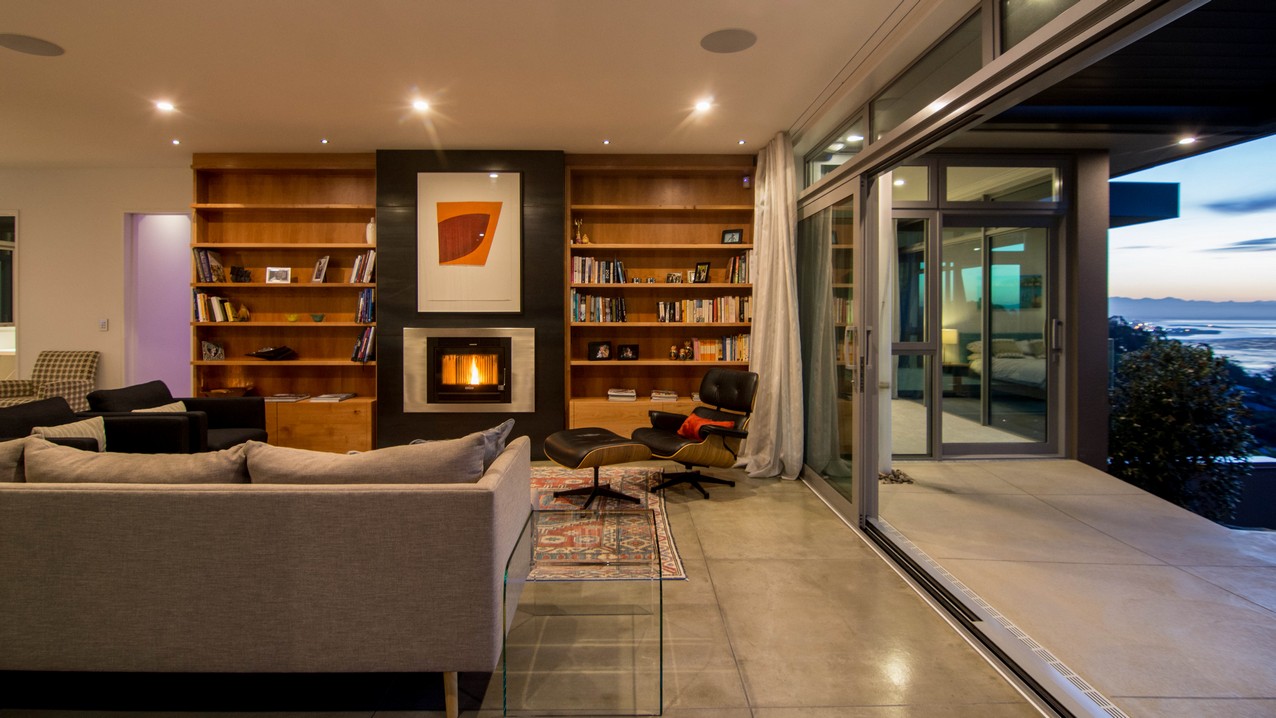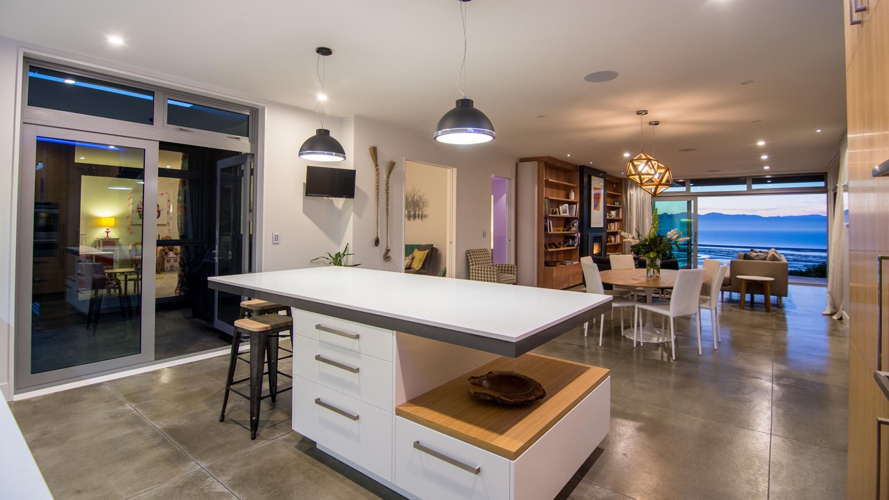 Not just a beautiful, healthy place for its growing family of four, the clever property also produces power, collects water, recycles grey water and is on its way to providing the occupants with most of their fruit and veges. Thermally broken foundations support a coloured polished concrete floor; a heat pump-driven under- floor heating system keeps the winter blues away. Thermally broken framing and windows as well as high-quality insulation do their bit too. Cleverly designed to sit on a very steep site, the home’s volumes shade each other in summer as the sun moves from east to west, all the while utilising passive solar design and maximising views of Nelson Bay, past the lighthouse and port. A modernist, mid-century architectural influence is observed inside and out. Interior design has turned this hardworking house into a home.