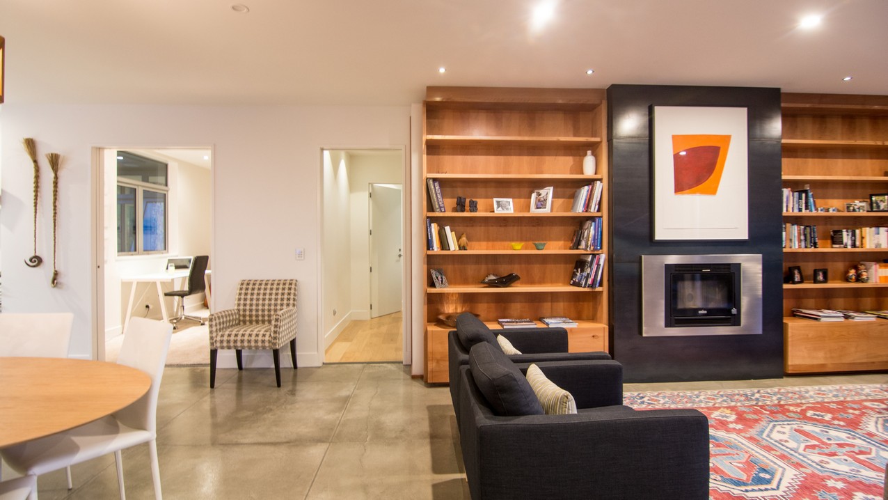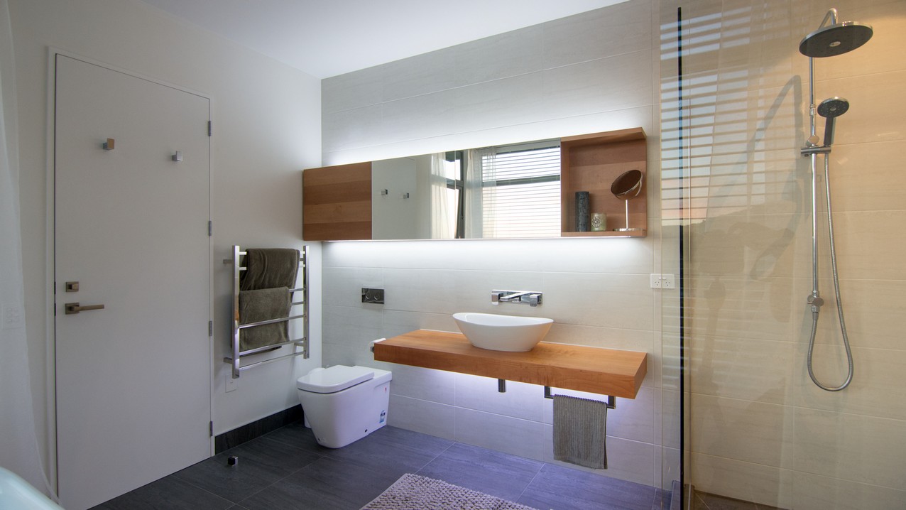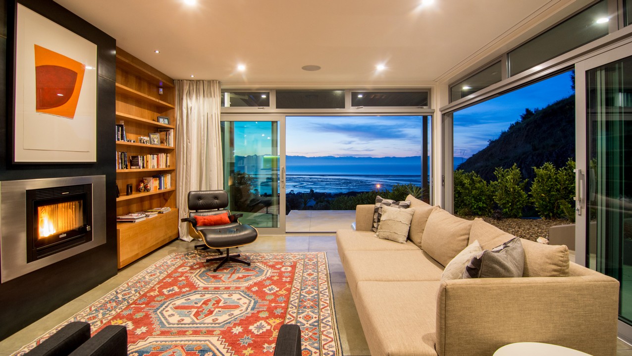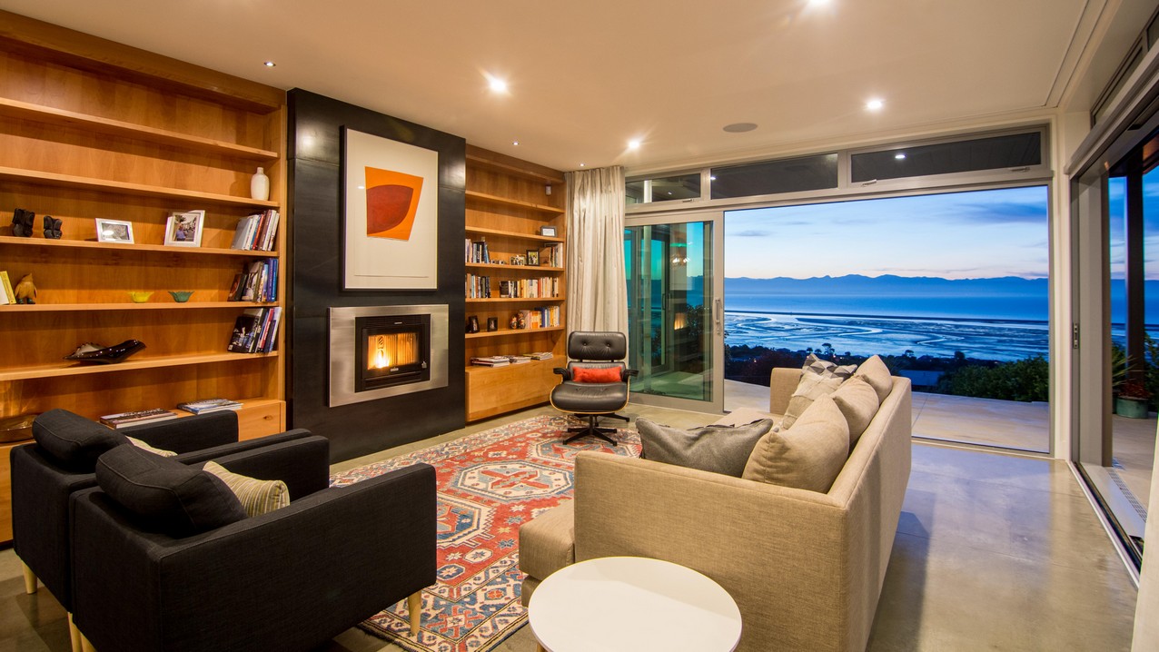 Not just a beautiful, healthy place for its growing family of four, the clever property also produces power, collects water, recycles grey water and is on its way to providing the occupants with most of their fruit and veges. Thermally broken foundations support a coloured polished concrete floor; a heat pump-driven under- floor heating system keeps the winter blues away. Thermally broken framing and windows as well as high-quality insulation do their bit too. Cleverly designed to sit on a very steep site, the home’s volumes shade each other in summer as the sun moves from east to west, all the while utilising passive solar design and maximising views of Nelson Bay, past the lighthouse and port. A modernist, mid-century architectural influence is observed inside and out. Interior design has turned this hardworking house into a home.