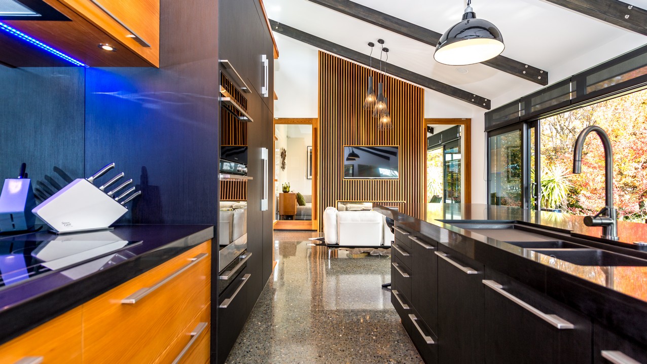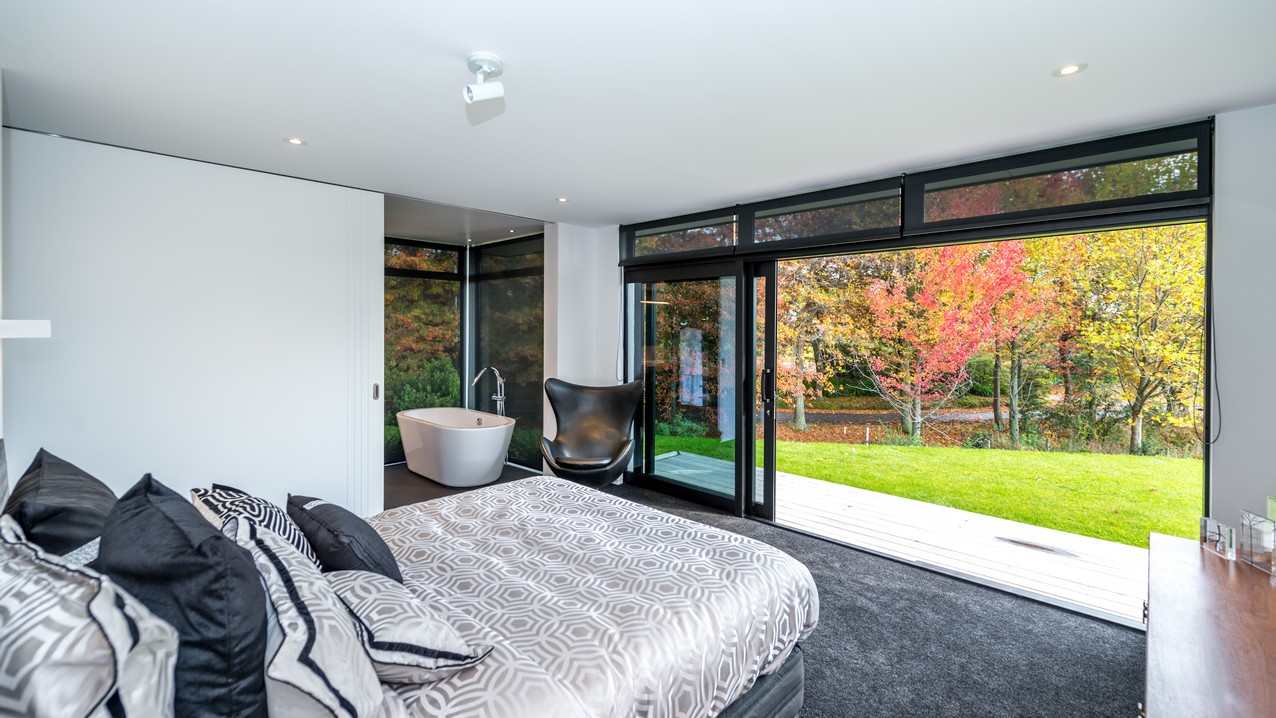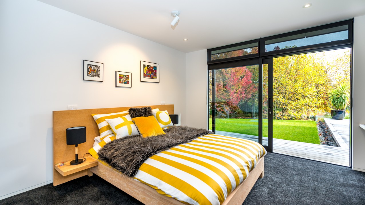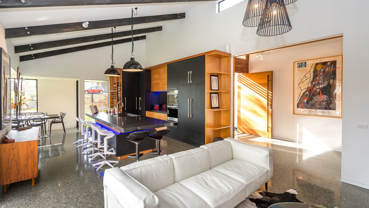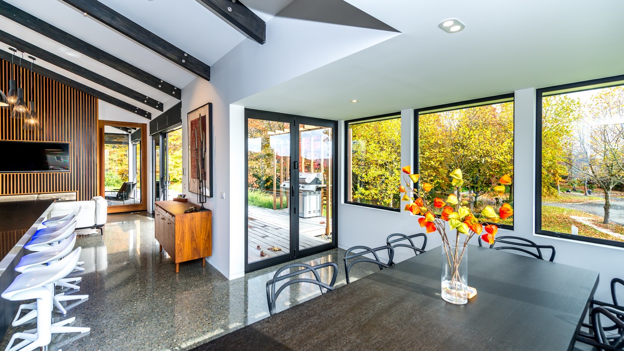 On chilly mornings, the three-bedroom, three- bathroom house stays warm thanks to superior insulation. Under-floor heating, powered by PV panels, radiates from the polished concrete floors. Swathes of glass bring the outdoors in and fill the home with light and warmth. The floor-to-ceiling fireplace in the living area can be opened up or closed off, depending on the season. A separate sitting room waits behind closed doors. Large wall spaces in the main entrance and living areas provide a blank canvas for displaying artwork. Dark surfaces in the entertainer’s kitchen eliminate glare when natural light comes streaming in. Resplendent in white and yellow, the scullery is served sunny side up. High ceilings, wide-open spaces and overheight doors enhance flow. Outside, decks connect to the bedrooms and living space, offering sun, shelter and privacy as the day progresses.