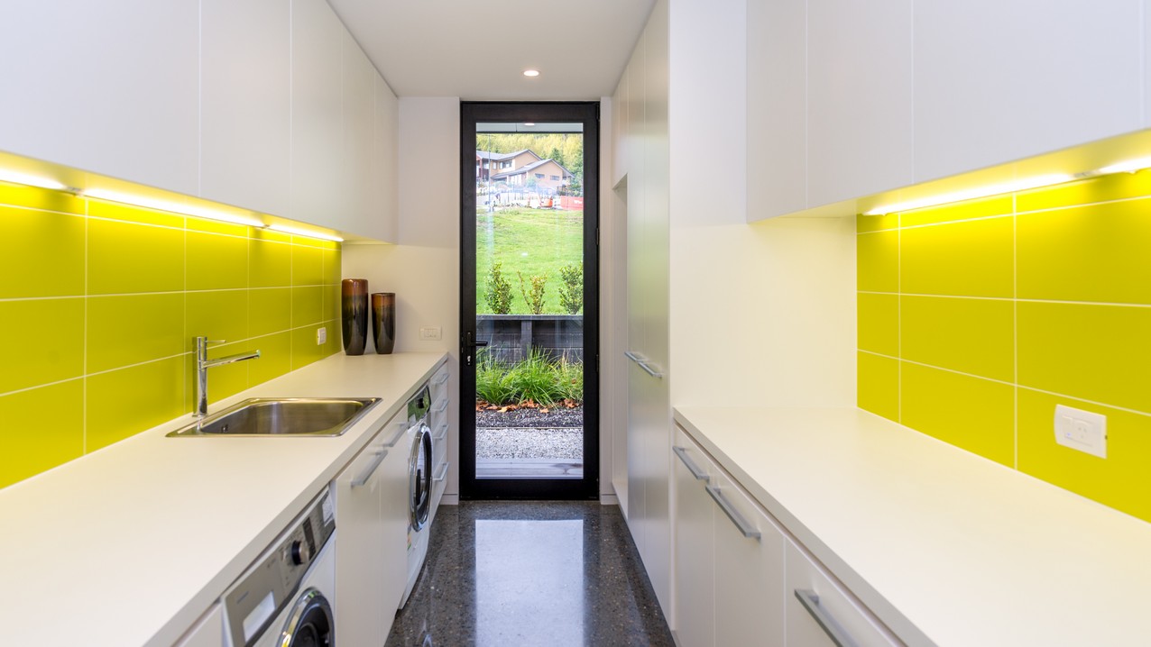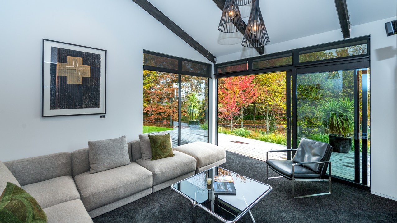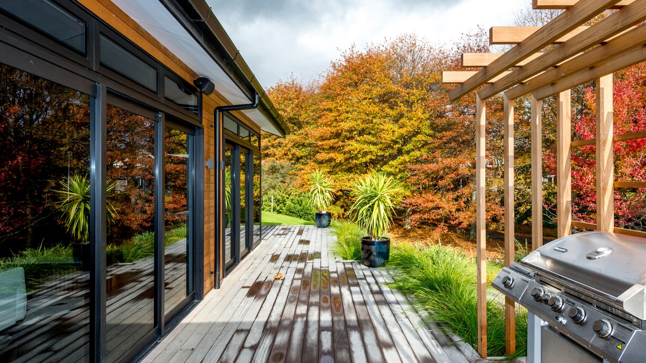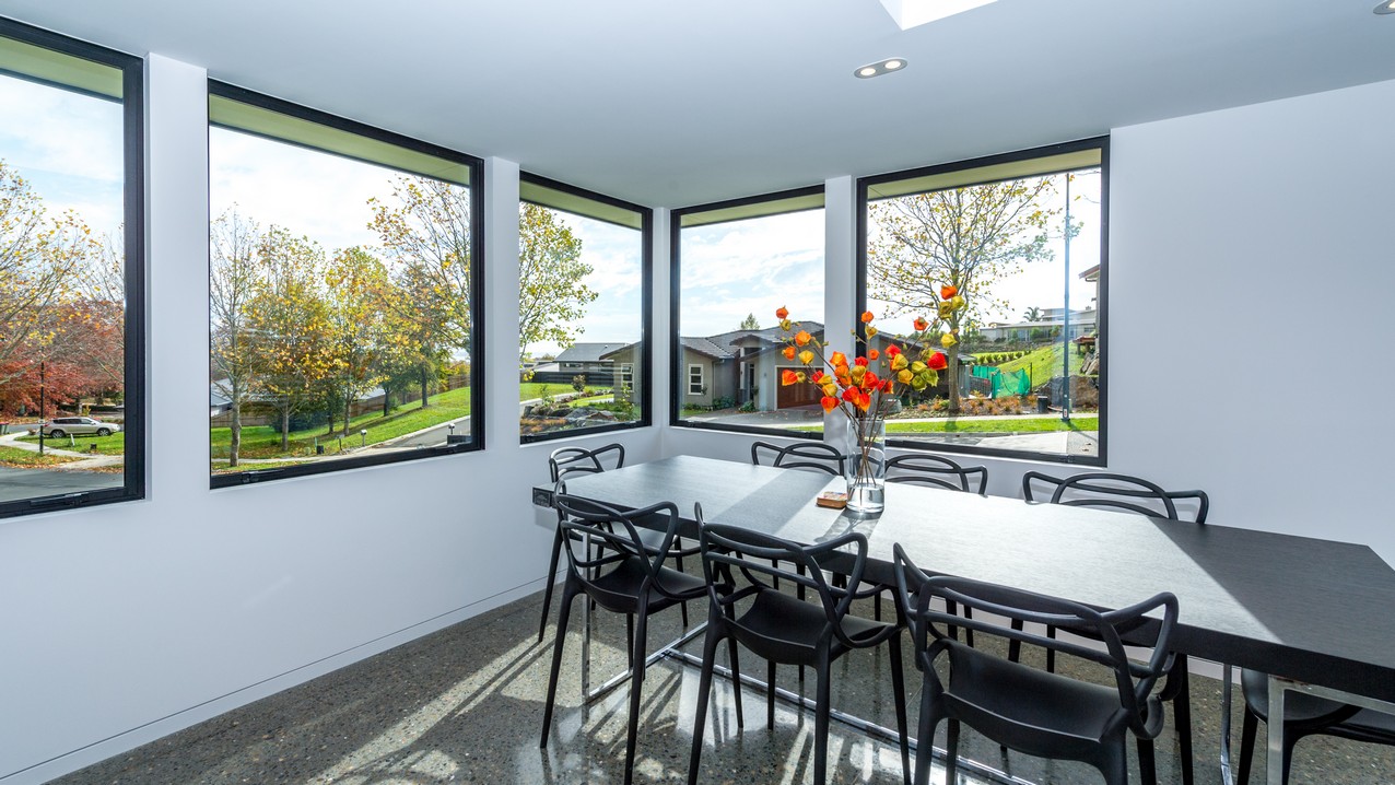 On chilly mornings, the three-bedroom, three- bathroom house stays warm thanks to superior insulation. Under-floor heating, powered by PV panels, radiates from the polished concrete floors. Swathes of glass bring the outdoors in and fill the home with light and warmth. The floor-to-ceiling fireplace in the living area can be opened up or closed off, depending on the season. A separate sitting room waits behind closed doors. Large wall spaces in the main entrance and living areas provide a blank canvas for displaying artwork. Dark surfaces in the entertainer’s kitchen eliminate glare when natural light comes streaming in. Resplendent in white and yellow, the scullery is served sunny side up. High ceilings, wide-open spaces and overheight doors enhance flow. Outside, decks connect to the bedrooms and living space, offering sun, shelter and privacy as the day progresses.