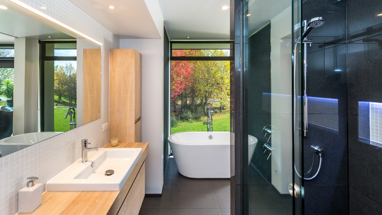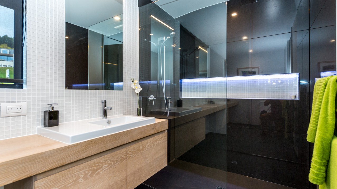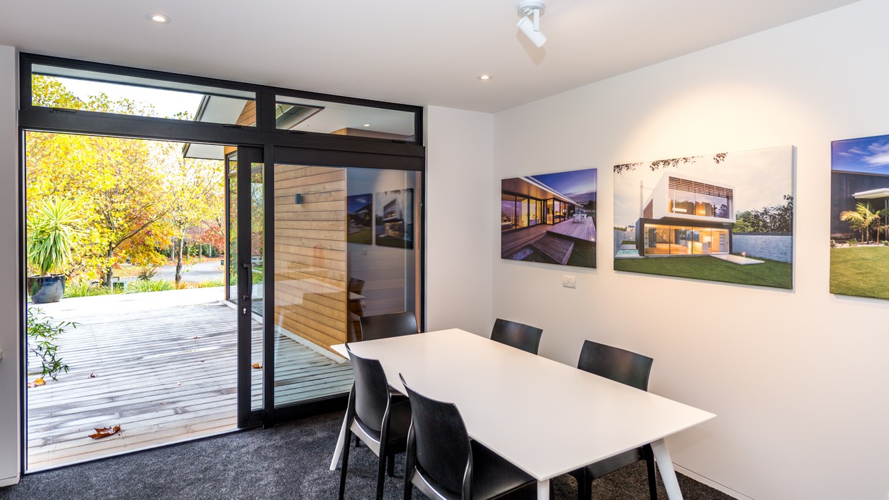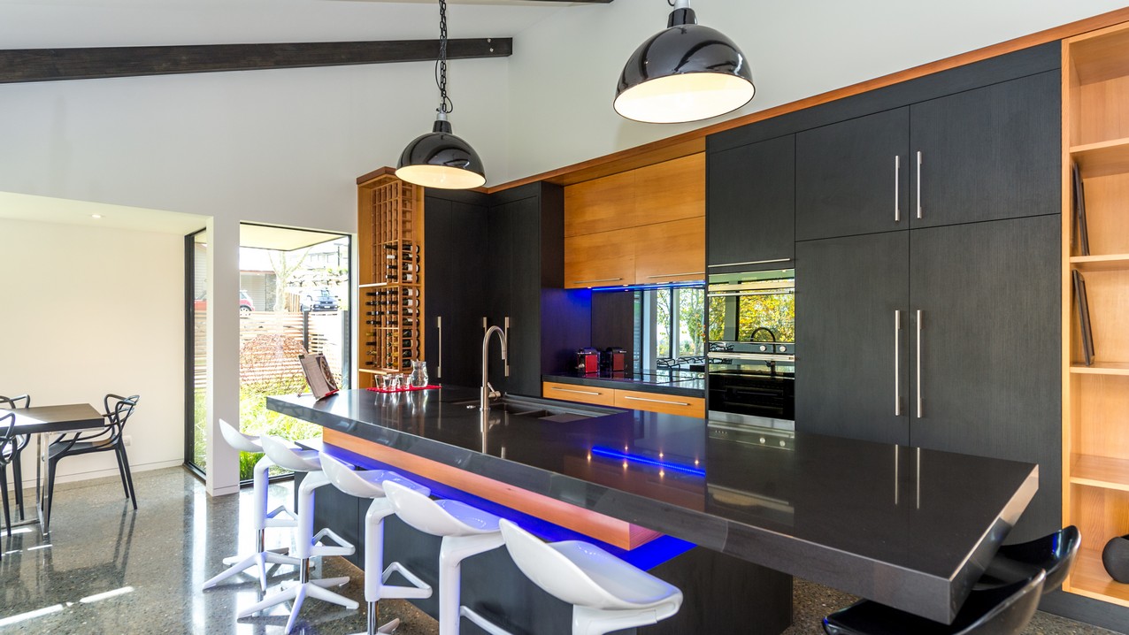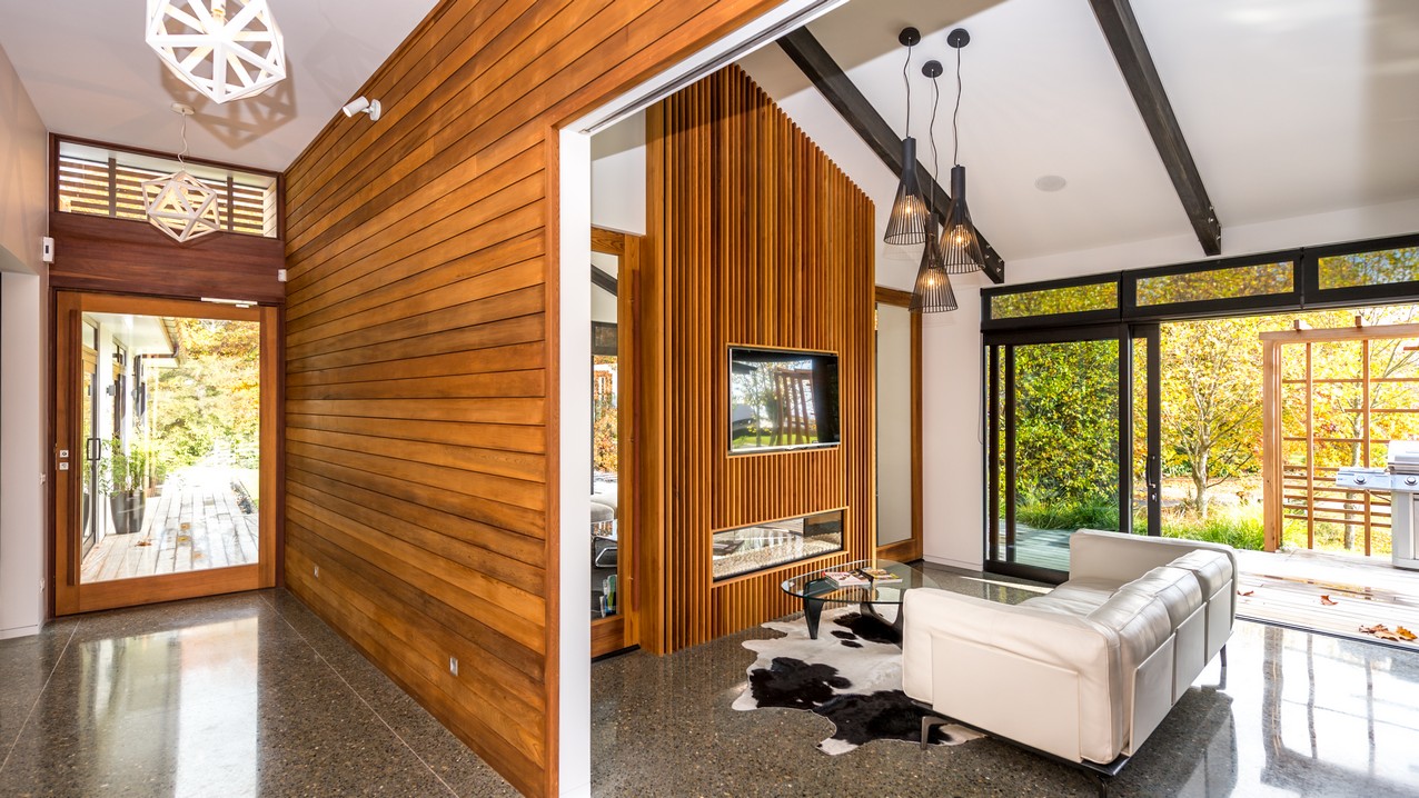 On chilly mornings, the three-bedroom, three- bathroom house stays warm thanks to superior insulation. Under-floor heating, powered by PV panels, radiates from the polished concrete floors. Swathes of glass bring the outdoors in and fill the home with light and warmth. The floor-to-ceiling fireplace in the living area can be opened up or closed off, depending on the season. A separate sitting room waits behind closed doors. Large wall spaces in the main entrance and living areas provide a blank canvas for displaying artwork. Dark surfaces in the entertainer’s kitchen eliminate glare when natural light comes streaming in. Resplendent in white and yellow, the scullery is served sunny side up. High ceilings, wide-open spaces and overheight doors enhance flow. Outside, decks connect to the bedrooms and living space, offering sun, shelter and privacy as the day progresses.