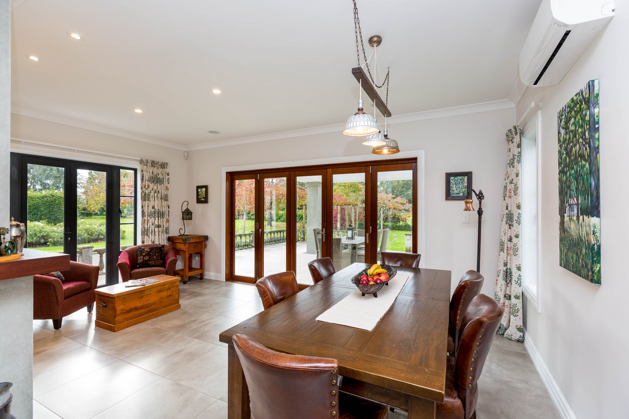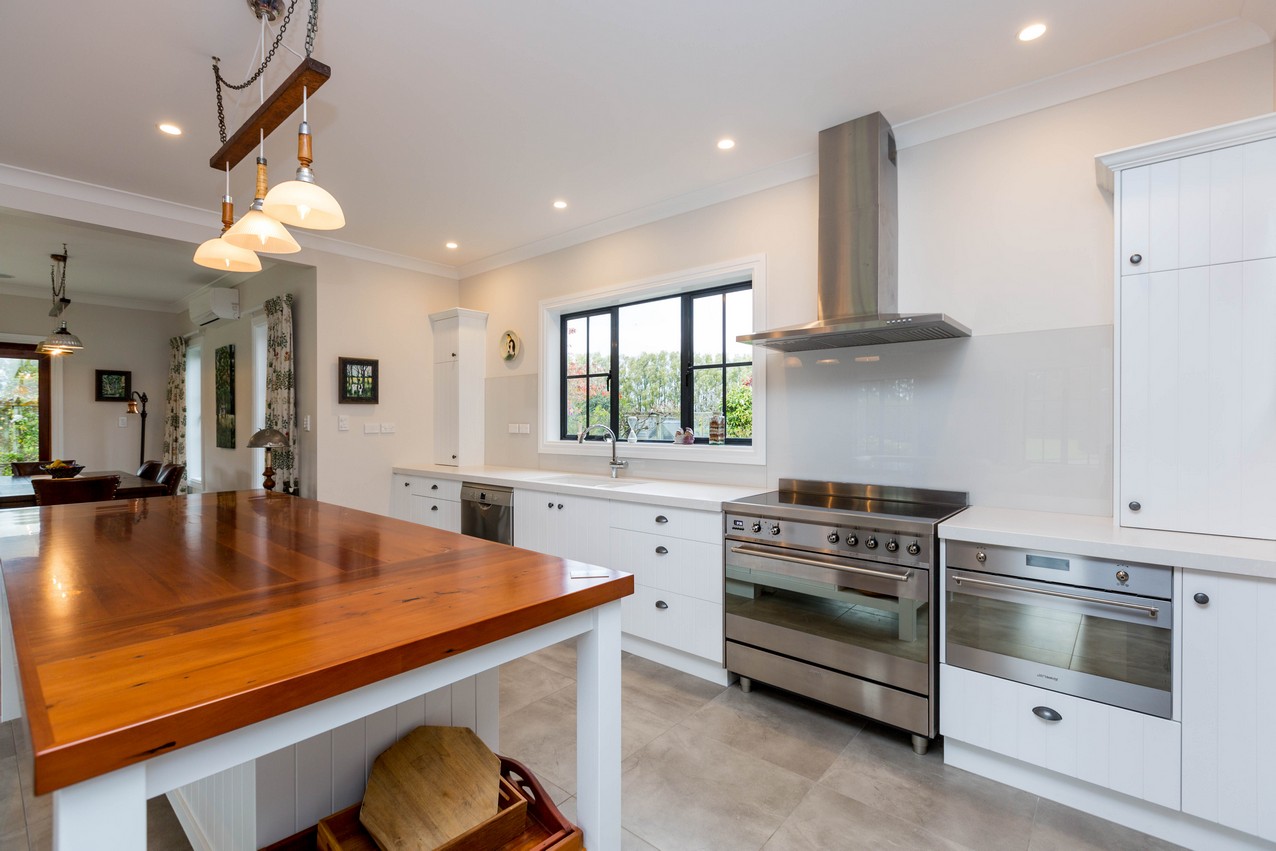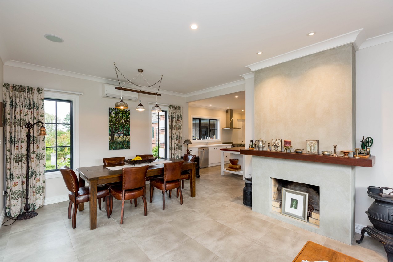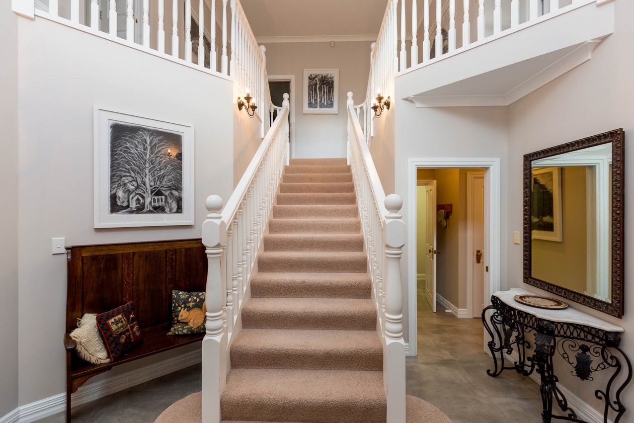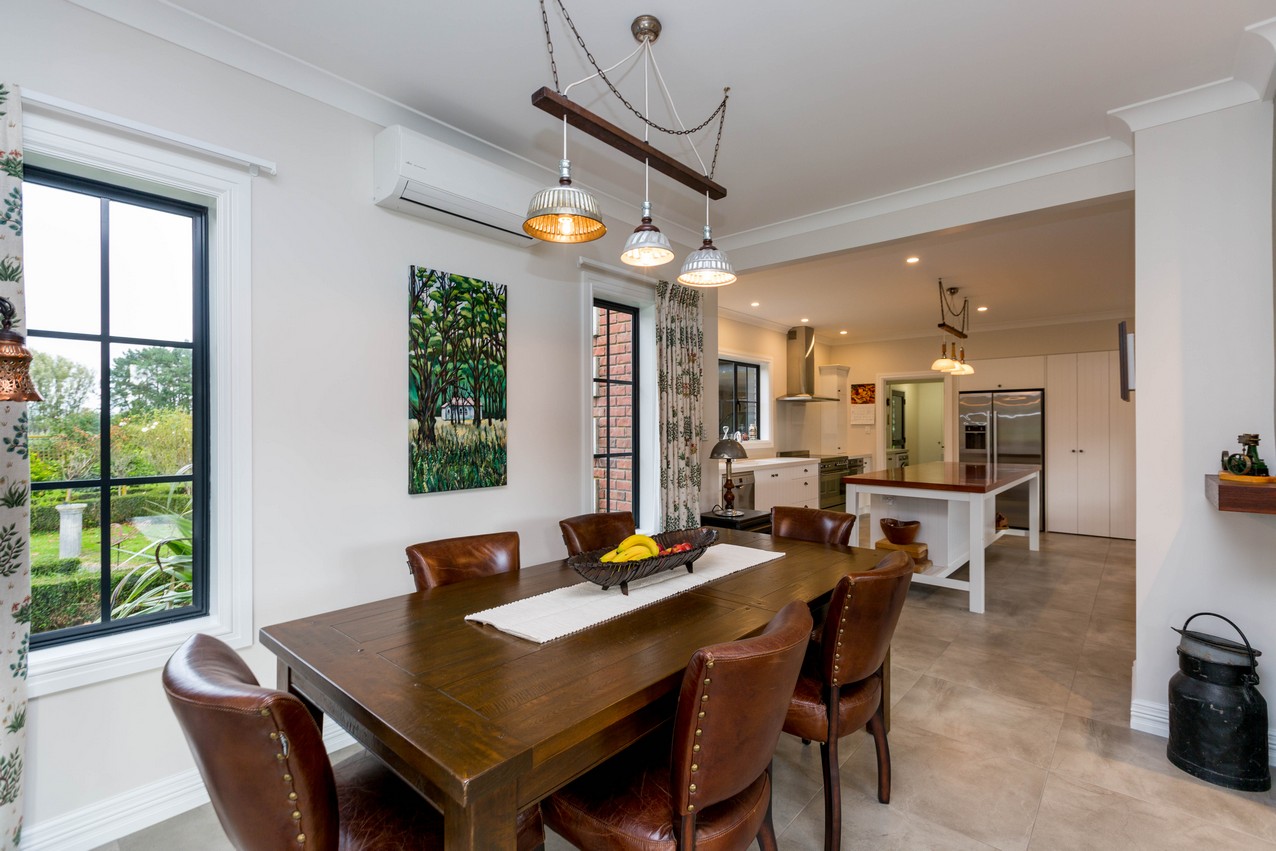 Dark dividing walls were downed, making way for up-to-date, light-filled, open-plan living. There’s loads of room to catch up with visitors in the brand-new kitchen with modern appliances and a large pantry. In a loving nod to the past, the oak dining table and coffee table from the original rooms of the house were remodelled to form the new island benchtop, along with other parts of the new joinery. The laundry attached to the kitchen was fitted with fresh cabinetry to match. A new roof and supporting structure have been seamlessly installed at the entrance. Cedar doors greet guests on arrival. Like the building itself, the foyer is grand and inviting, offering multiple passages into the home. The beautiful, carpeted central staircase invites visitors up to the classically balustraded mezzanine. Below, a series of doorways draw you deeper into the lower-level living spaces. French doors in the lounge area have been taken out and the opening widened to accommodate contemporary glass bi-folds. Bricks that had been removed from the existing house were re-laid around the new bi-folds. The outdoor entertaining space is topped off with beautifully constructed timber rafters. Pendant lights made from recycled cake tins and teapots add a charmingly old-fashioned personal touch. With five bedrooms and three living spaces, this newly refurbished English-style country home won’t stay empty for long.