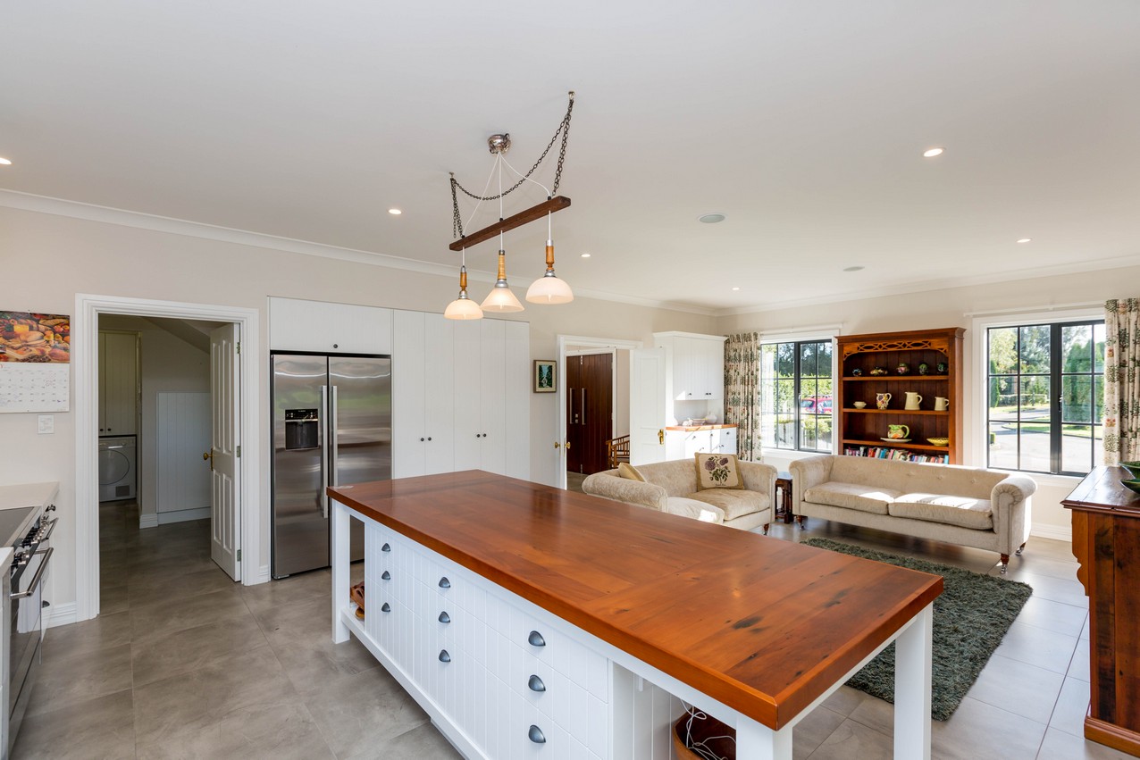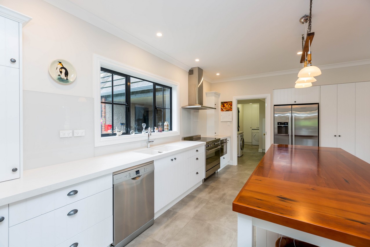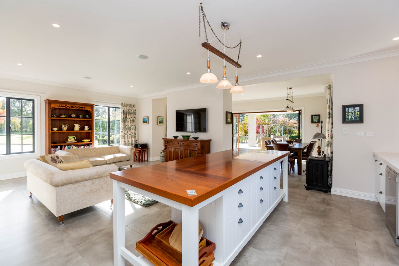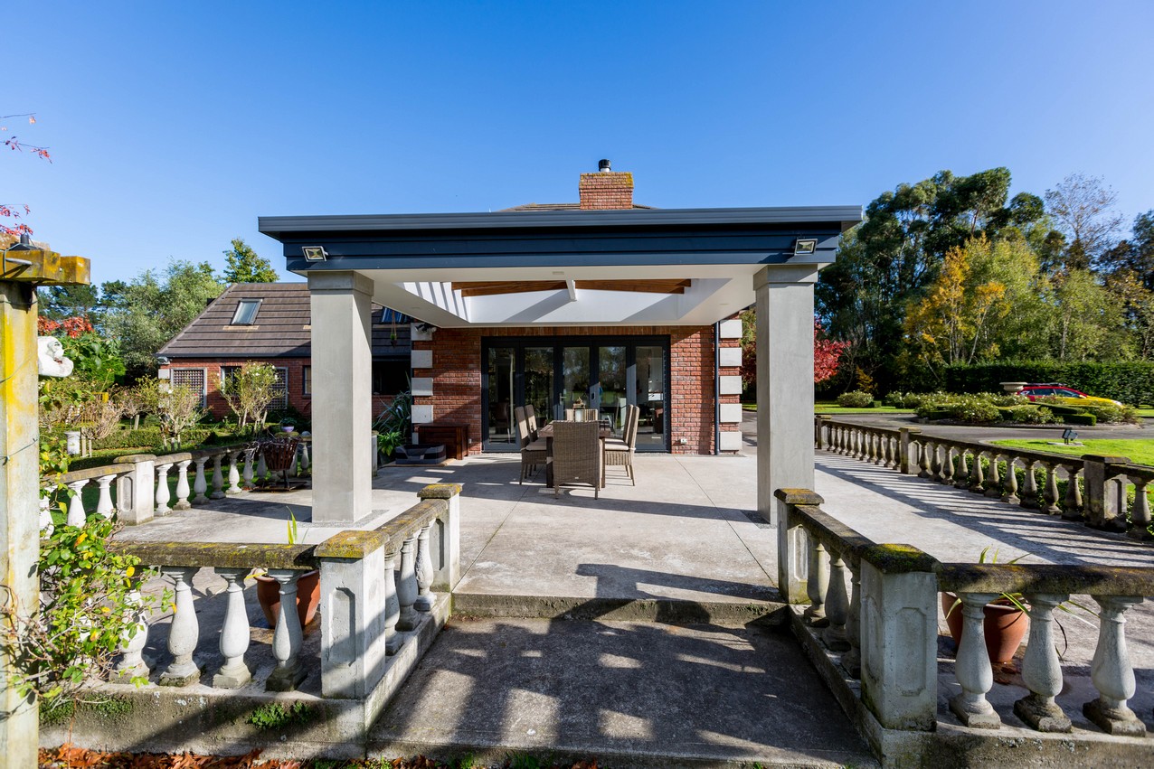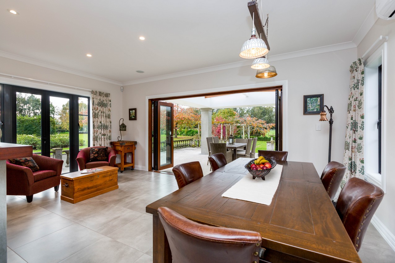 Dark dividing walls were downed, making way for up-to-date, light-filled, open-plan living. There’s loads of room to catch up with visitors in the brand-new kitchen with modern appliances and a large pantry. In a loving nod to the past, the oak dining table and coffee table from the original rooms of the house were remodelled to form the new island benchtop, along with other parts of the new joinery. The laundry attached to the kitchen was fitted with fresh cabinetry to match. A new roof and supporting structure have been seamlessly installed at the entrance. Cedar doors greet guests on arrival. Like the building itself, the foyer is grand and inviting, offering multiple passages into the home. The beautiful, carpeted central staircase invites visitors up to the classically balustraded mezzanine. Below, a series of doorways draw you deeper into the lower-level living spaces. French doors in the lounge area have been taken out and the opening widened to accommodate contemporary glass bi-folds. Bricks that had been removed from the existing house were re-laid around the new bi-folds. The outdoor entertaining space is topped off with beautifully constructed timber rafters. Pendant lights made from recycled cake tins and teapots add a charmingly old-fashioned personal touch. With five bedrooms and three living spaces, this newly refurbished English-style country home won’t stay empty for long.