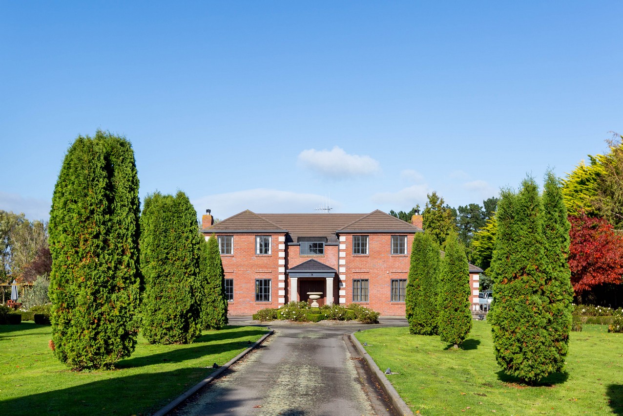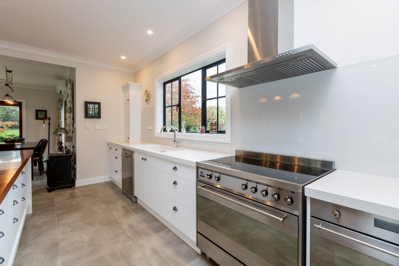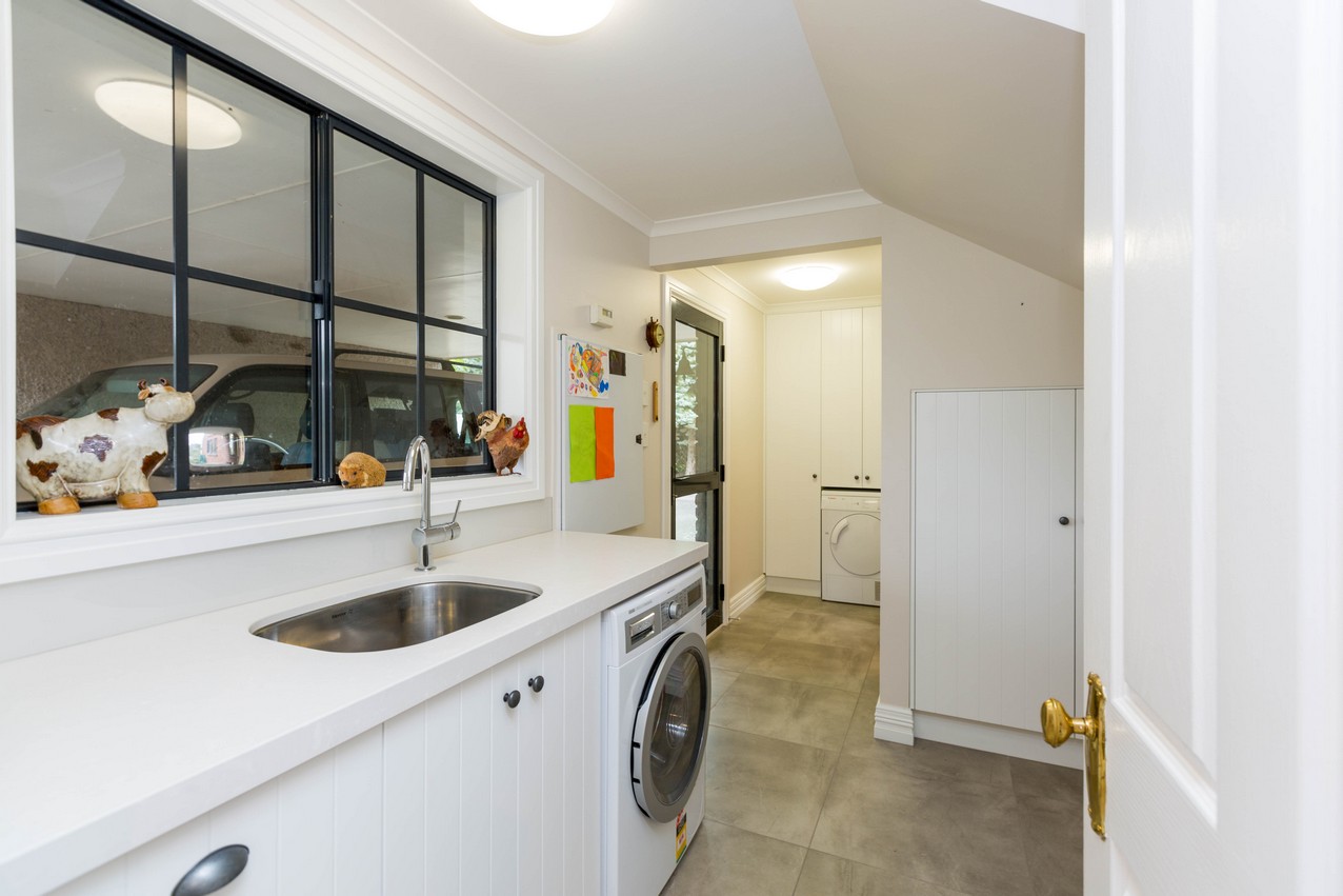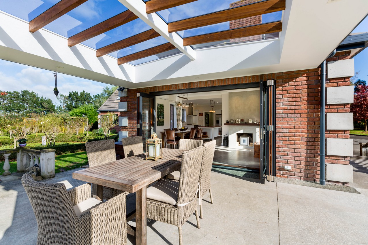 Dark dividing walls were downed, making way for up-to-date, light-filled, open-plan living. There’s loads of room to catch up with visitors in the brand-new kitchen with modern appliances and a large pantry. In a loving nod to the past, the oak dining table and coffee table from the original rooms of the house were remodelled to form the new island benchtop, along with other parts of the new joinery. The laundry attached to the kitchen was fitted with fresh cabinetry to match. A new roof and supporting structure have been seamlessly installed at the entrance. Cedar doors greet guests on arrival. Like the building itself, the foyer is grand and inviting, offering multiple passages into the home. The beautiful, carpeted central staircase invites visitors up to the classically balustraded mezzanine. Below, a series of doorways draw you deeper into the lower-level living spaces. French doors in the lounge area have been taken out and the opening widened to accommodate contemporary glass bi-folds. Bricks that had been removed from the existing house were re-laid around the new bi-folds. The outdoor entertaining space is topped off with beautifully constructed timber rafters. Pendant lights made from recycled cake tins and teapots add a charmingly old-fashioned personal touch. With five bedrooms and three living spaces, this newly refurbished English-style country home won’t stay empty for long.
