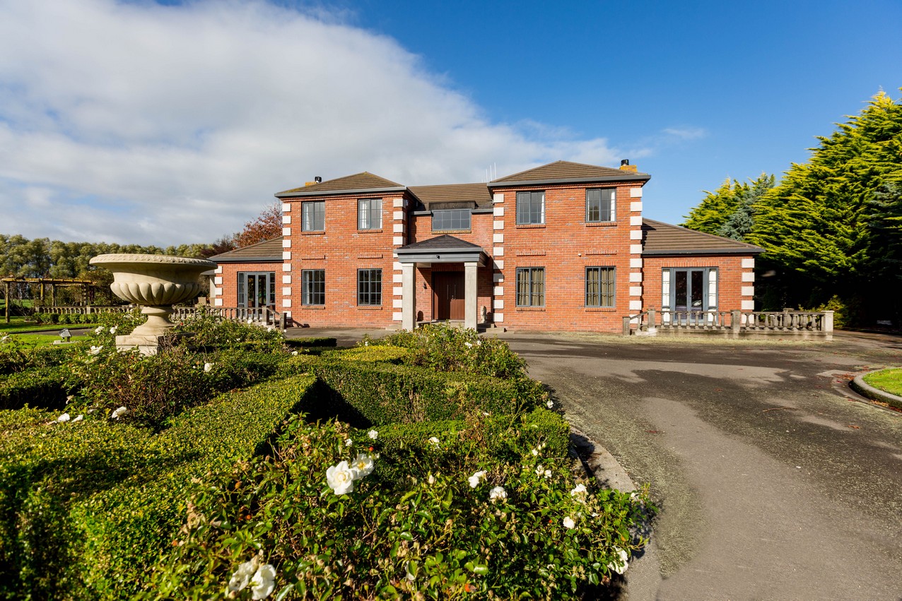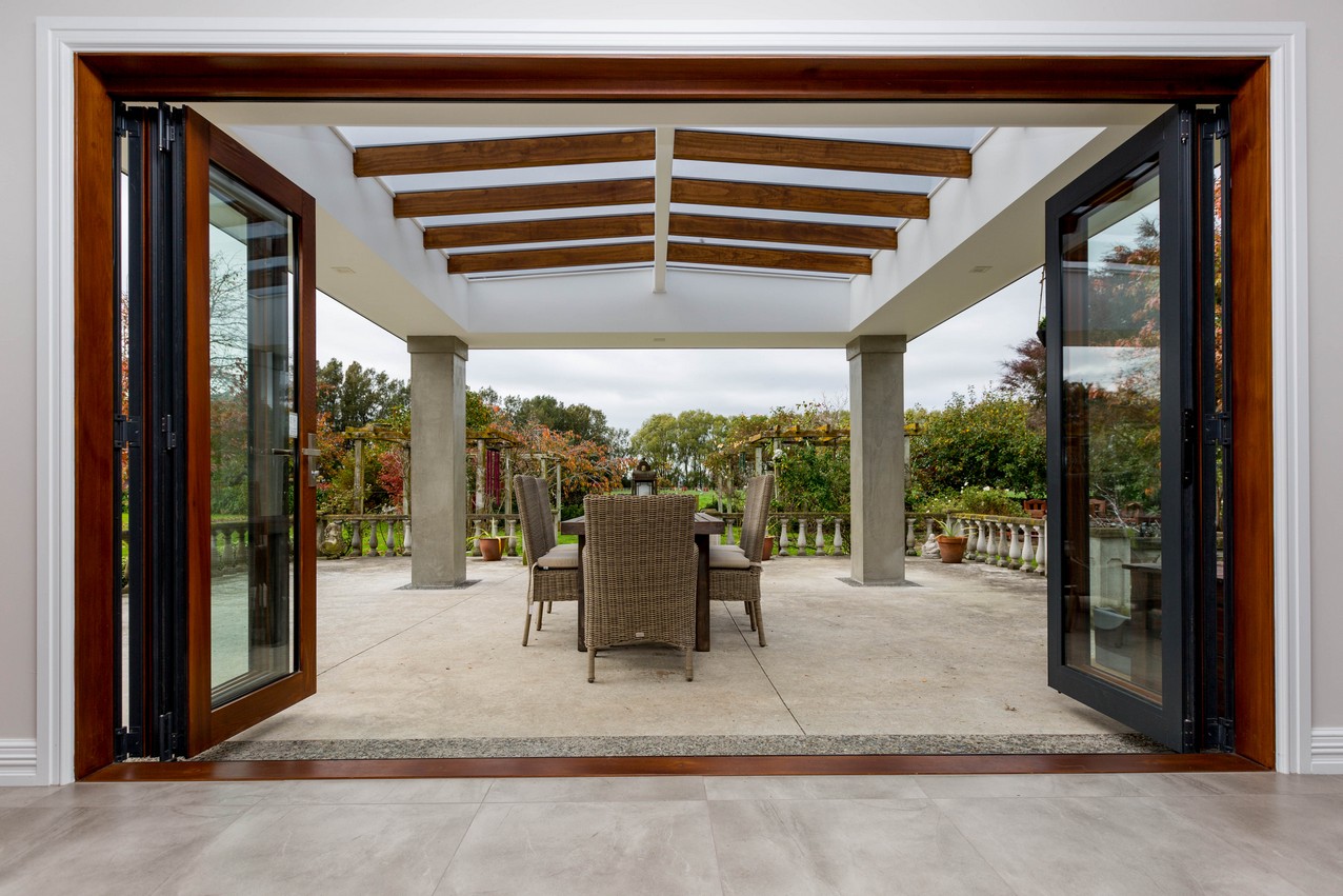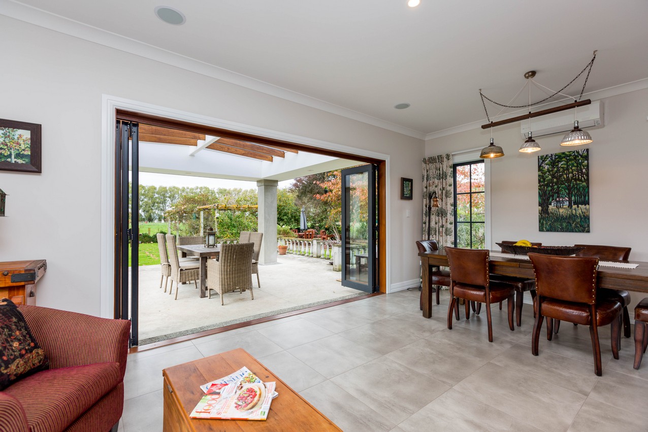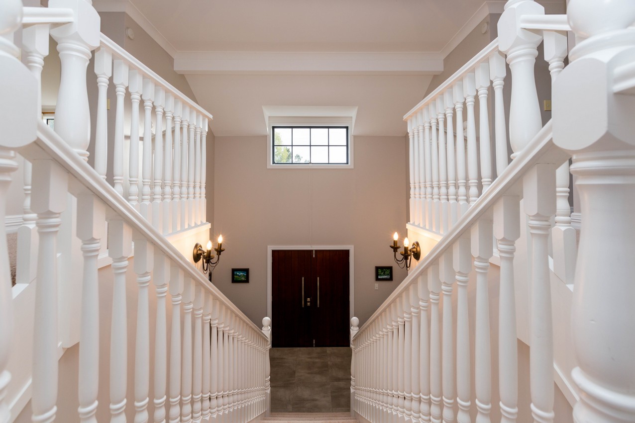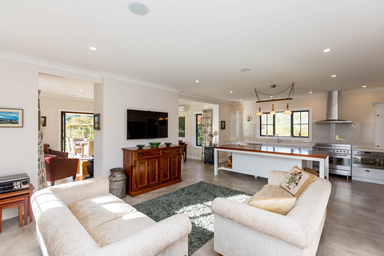 Dark dividing walls were downed, making way for up-to-date, light-filled, open-plan living. There’s loads of room to catch up with visitors in the brand-new kitchen with modern appliances and a large pantry. In a loving nod to the past, the oak dining table and coffee table from the original rooms of the house were remodelled to form the new island benchtop, along with other parts of the new joinery. The laundry attached to the kitchen was fitted with fresh cabinetry to match. A new roof and supporting structure have been seamlessly installed at the entrance. Cedar doors greet guests on arrival. Like the building itself, the foyer is grand and inviting, offering multiple passages into the home. The beautiful, carpeted central staircase invites visitors up to the classically balustraded mezzanine. Below, a series of doorways draw you deeper into the lower-level living spaces. French doors in the lounge area have been taken out and the opening widened to accommodate contemporary glass bi-folds. Bricks that had been removed from the existing house were re-laid around the new bi-folds. The outdoor entertaining space is topped off with beautifully constructed timber rafters. Pendant lights made from recycled cake tins and teapots add a charmingly old-fashioned personal touch. With five bedrooms and three living spaces, this newly refurbished English-style country home won’t stay empty for long.