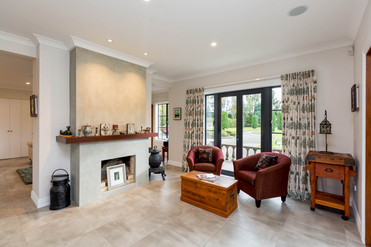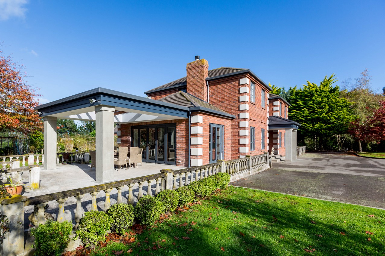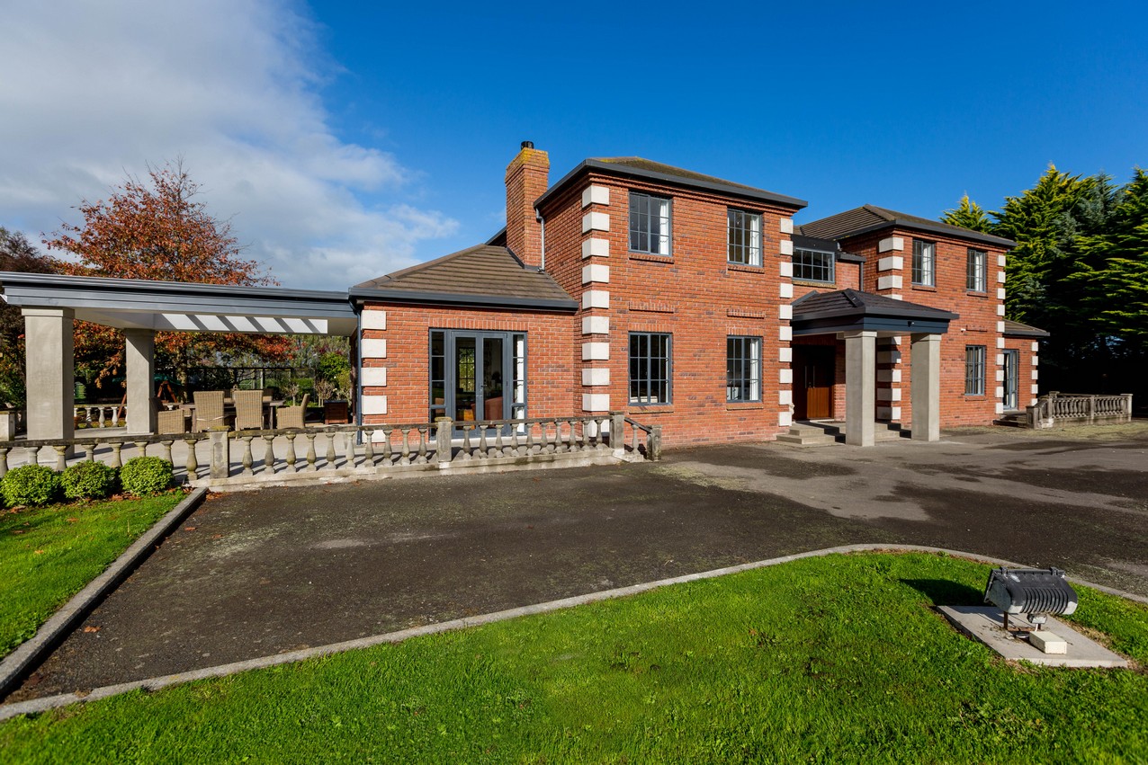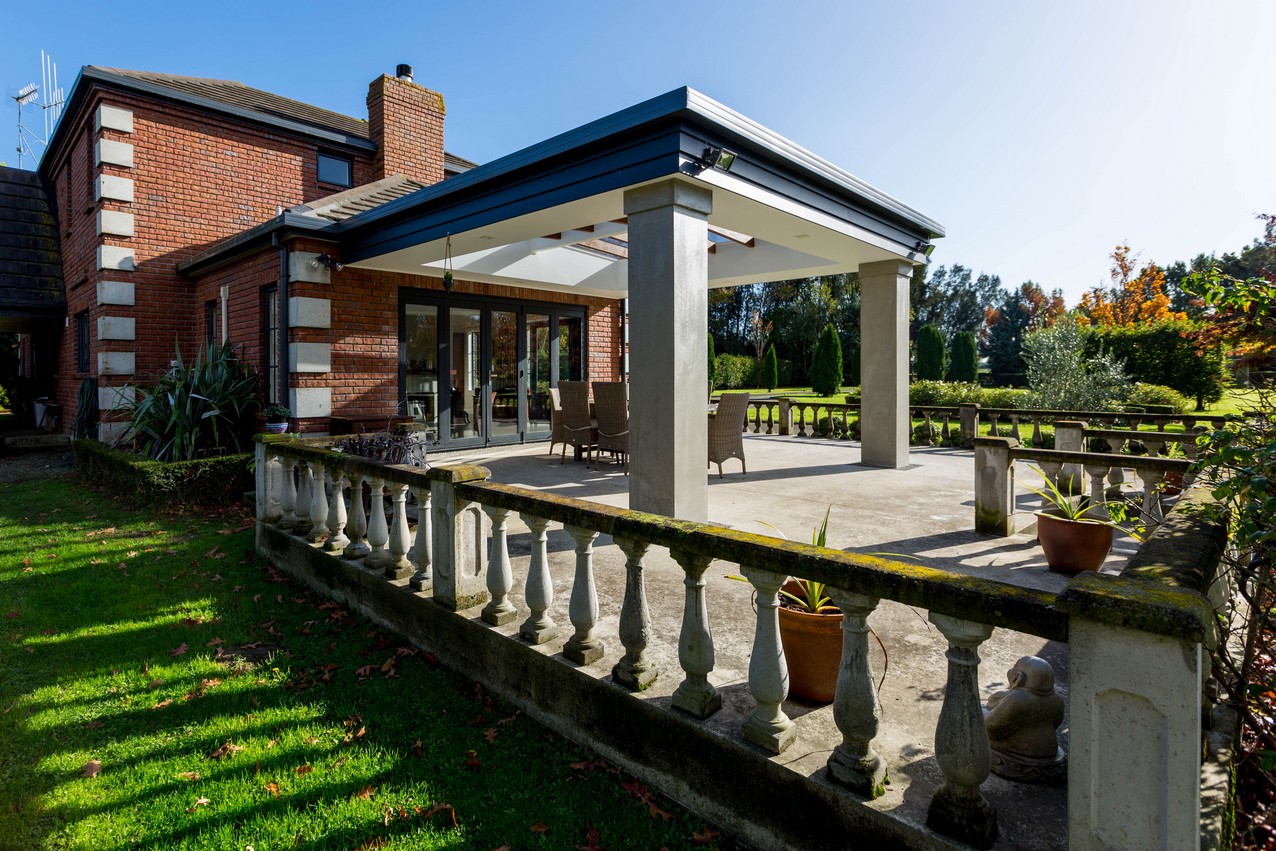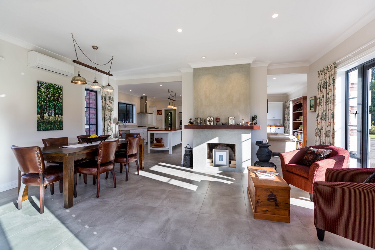 Dark dividing walls were downed, making way for up-to-date, light-filled, open-plan living. There’s loads of room to catch up with visitors in the brand-new kitchen with modern appliances and a large pantry. In a loving nod to the past, the oak dining table and coffee table from the original rooms of the house were remodelled to form the new island benchtop, along with other parts of the new joinery. The laundry attached to the kitchen was fitted with fresh cabinetry to match. A new roof and supporting structure have been seamlessly installed at the entrance. Cedar doors greet guests on arrival. Like the building itself, the foyer is grand and inviting, offering multiple passages into the home. The beautiful, carpeted central staircase invites visitors up to the classically balustraded mezzanine. Below, a series of doorways draw you deeper into the lower-level living spaces. French doors in the lounge area have been taken out and the opening widened to accommodate contemporary glass bi-folds. Bricks that had been removed from the existing house were re-laid around the new bi-folds. The outdoor entertaining space is topped off with beautifully constructed timber rafters. Pendant lights made from recycled cake tins and teapots add a charmingly old-fashioned personal touch. With five bedrooms and three living spaces, this newly refurbished English-style country home won’t stay empty for long.