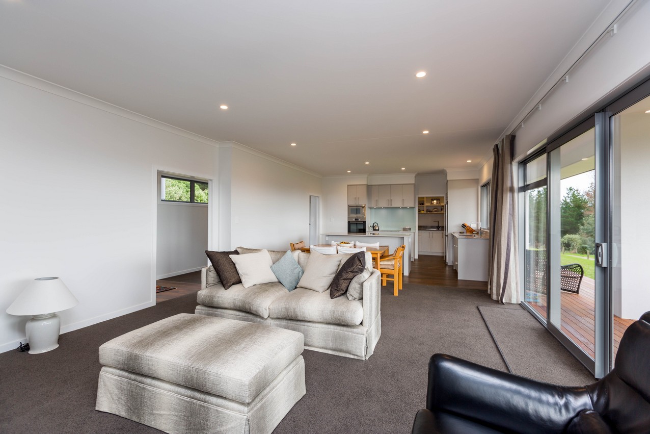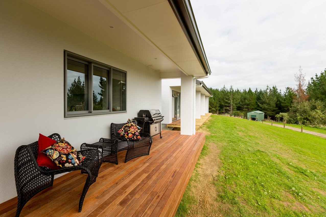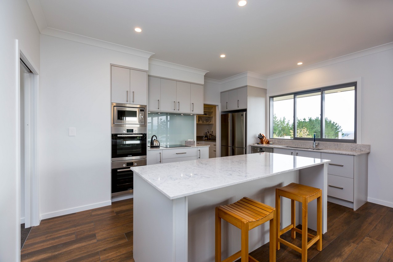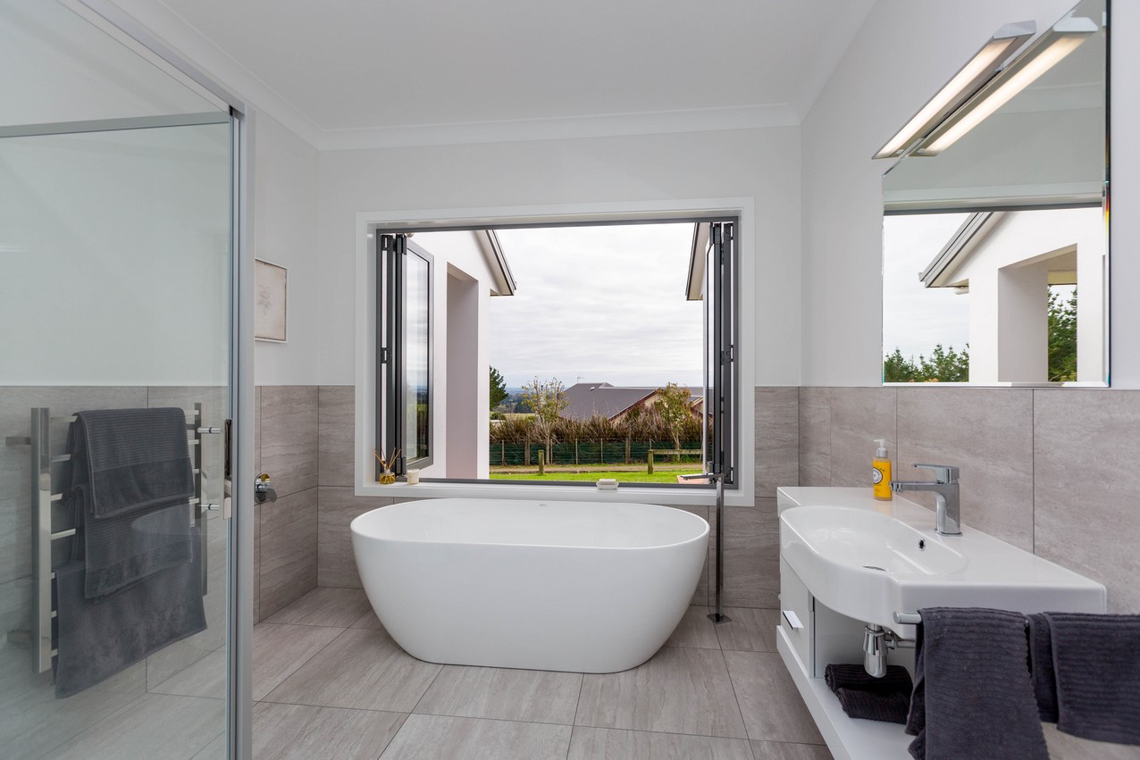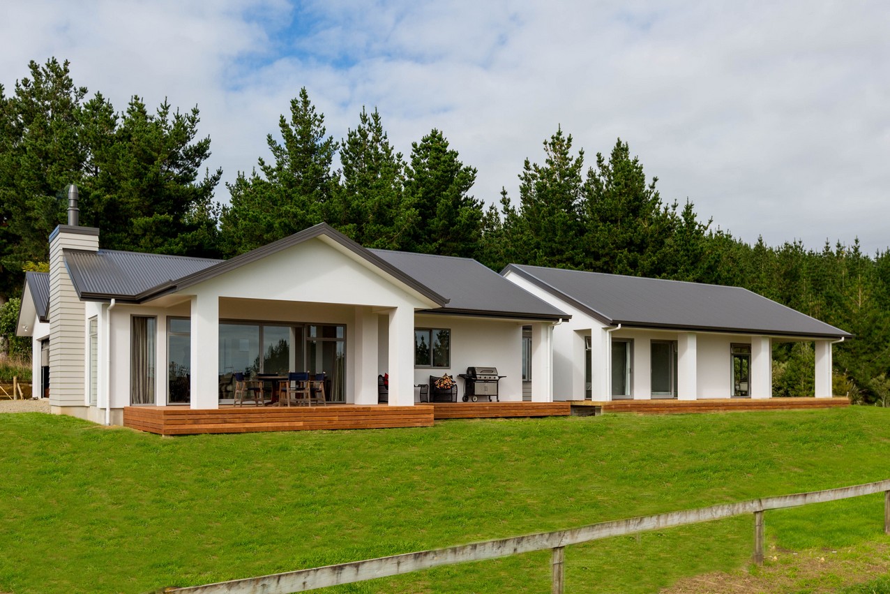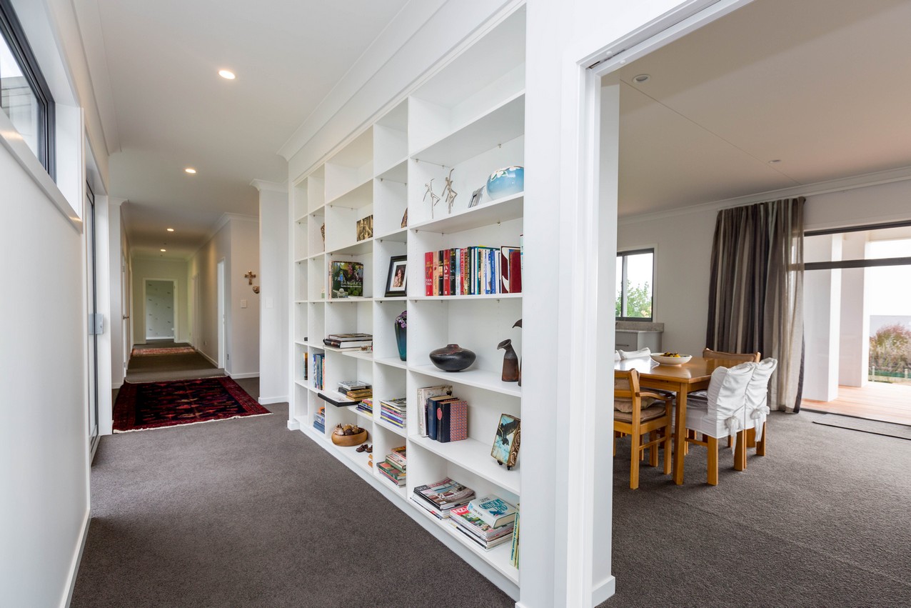 Approaching the driveway, it’s easy to appreciate the harmonious union of Rockcote plaster and Linea weatherboard in contrasting greys. The aluminium front door in dark walnut woodgrain is inviting and durable. Inside, timber-look tile planks contrast with stark white walls, drawing the eye into the magnificent hallway that serves as a gallery, library, office alcove and cosy sitting spot. Recesses, nooks, large windows and sliding doors reign supreme in this home, leading to hidden treasures and outdoor rewards. The hallway is the heart of the home, with specialised shelving for books, photos and much-loved mementos. The office nook boasts a unique polished concrete top with highlights of blue glass and a periglacial blue finish to the back wall. A private sitting area is the perfect place to read or enjoy a quiet drink and chat. In the main bathroom, a freestanding Athena Cassini bath rests under bi-fold windows so the bather can enjoy the view while relaxing after a hard day’s work. A spacious scullery-equipped kitchen and a freestanding fire welcome guests into the open-plan living area. A double garage, with separate quad bike access, and a well-appointed laundry serve the clients’ needs nicely. Bedrooms and living spaces all flow to covered decks, taking in the views. In the master suite, sliding doors open in three directions for superior outdoor flow. A generous walk-in wardrobe and ensuite complete these fine sleeping quarters.