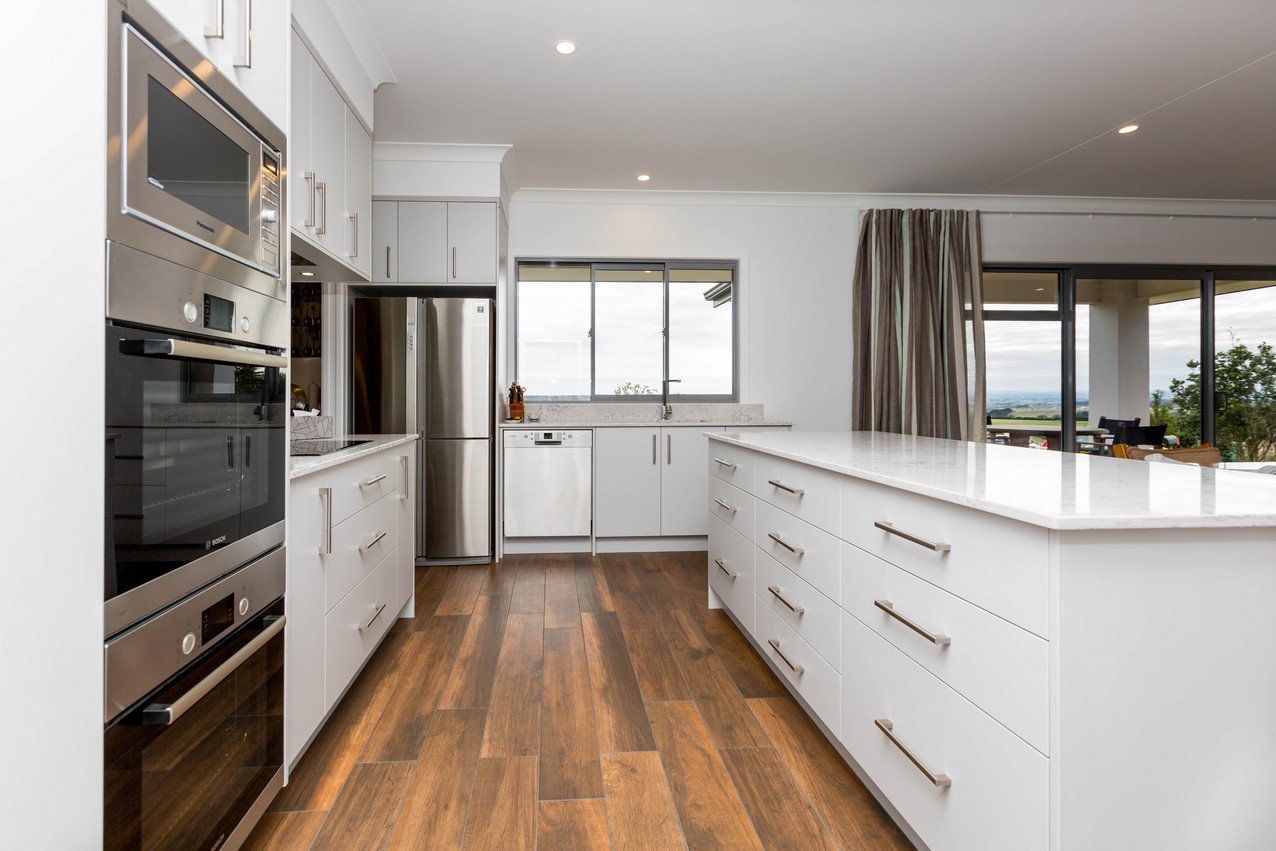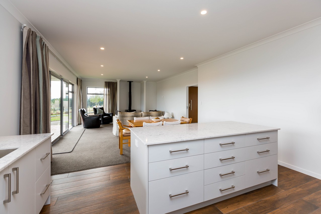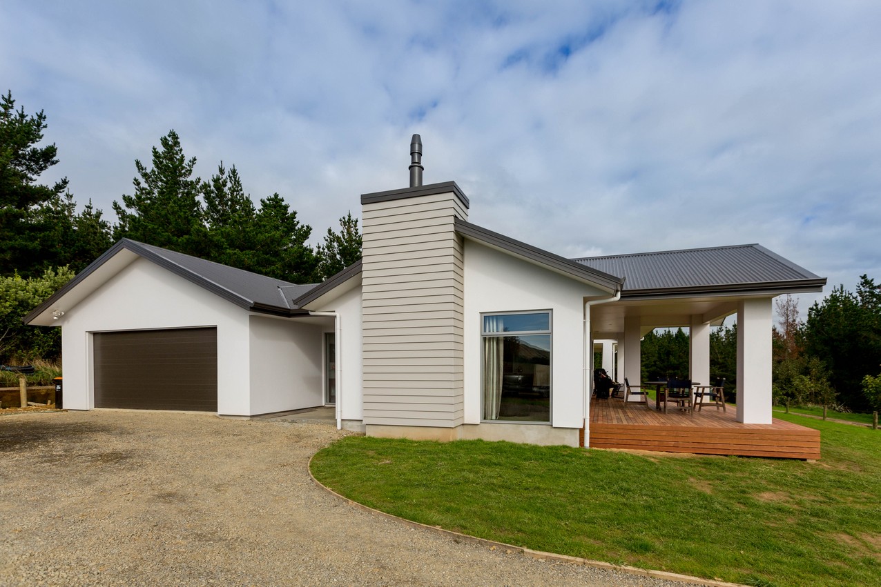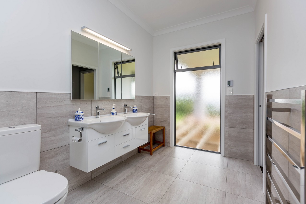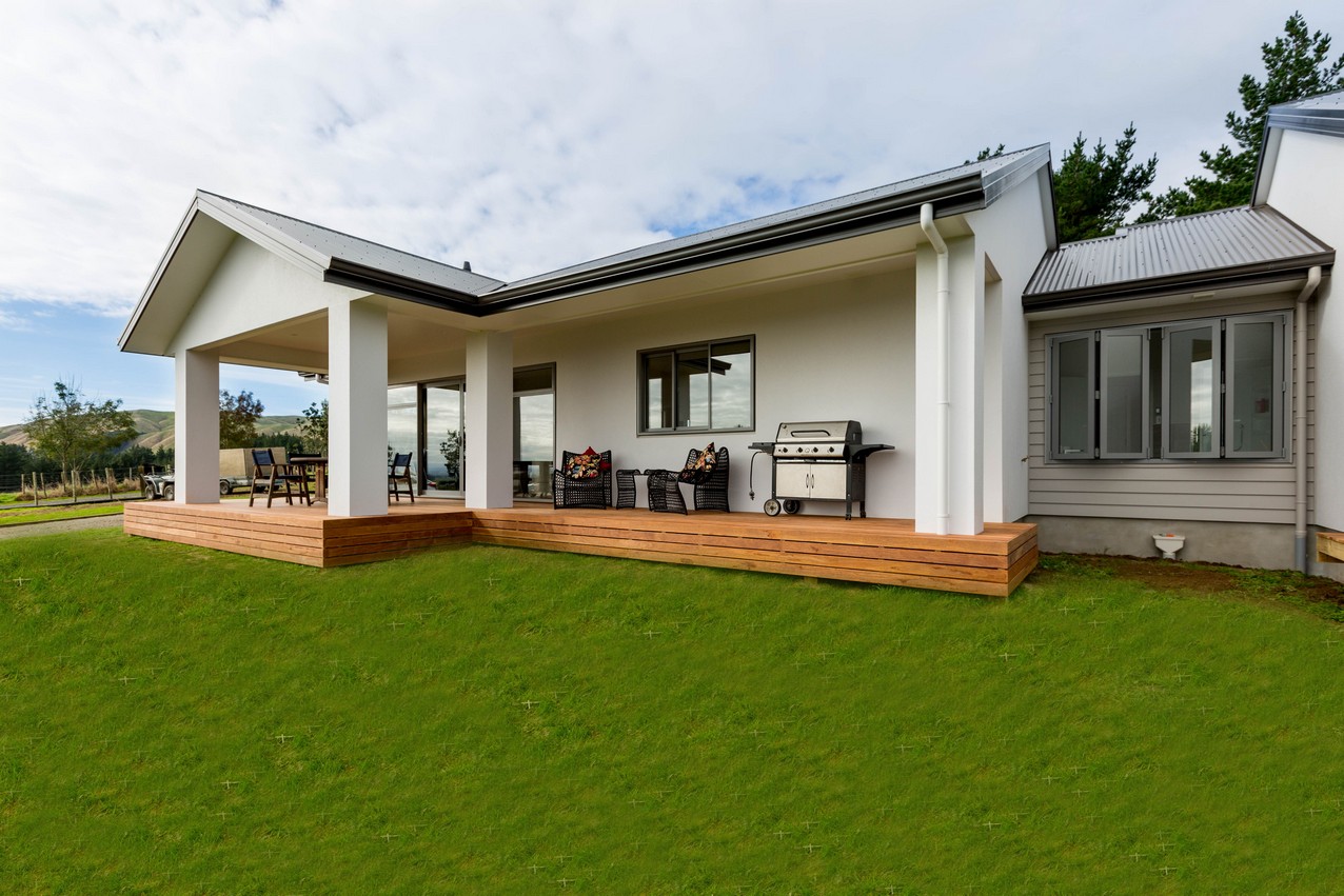 Approaching the driveway, it’s easy to appreciate the harmonious union of Rockcote plaster and Linea weatherboard in contrasting greys. The aluminium front door in dark walnut woodgrain is inviting and durable. Inside, timber-look tile planks contrast with stark white walls, drawing the eye into the magnificent hallway that serves as a gallery, library, office alcove and cosy sitting spot. Recesses, nooks, large windows and sliding doors reign supreme in this home, leading to hidden treasures and outdoor rewards. The hallway is the heart of the home, with specialised shelving for books, photos and much-loved mementos. The office nook boasts a unique polished concrete top with highlights of blue glass and a periglacial blue finish to the back wall. A private sitting area is the perfect place to read or enjoy a quiet drink and chat. In the main bathroom, a freestanding Athena Cassini bath rests under bi-fold windows so the bather can enjoy the view while relaxing after a hard day’s work. A spacious scullery-equipped kitchen and a freestanding fire welcome guests into the open-plan living area. A double garage, with separate quad bike access, and a well-appointed laundry serve the clients’ needs nicely. Bedrooms and living spaces all flow to covered decks, taking in the views. In the master suite, sliding doors open in three directions for superior outdoor flow. A generous walk-in wardrobe and ensuite complete these fine sleeping quarters.