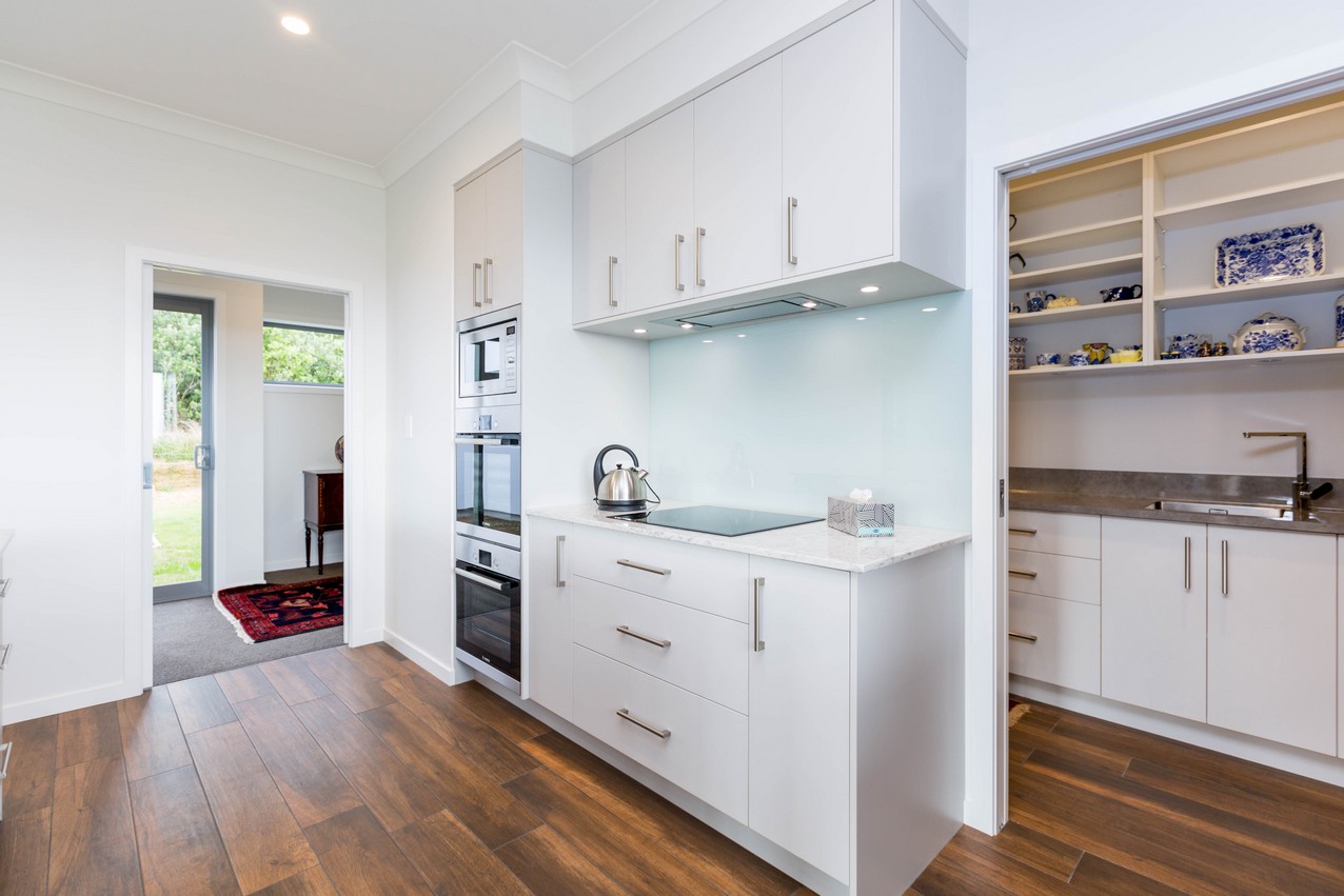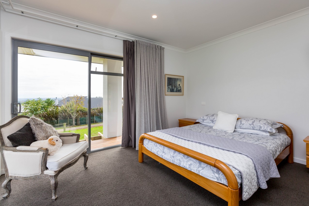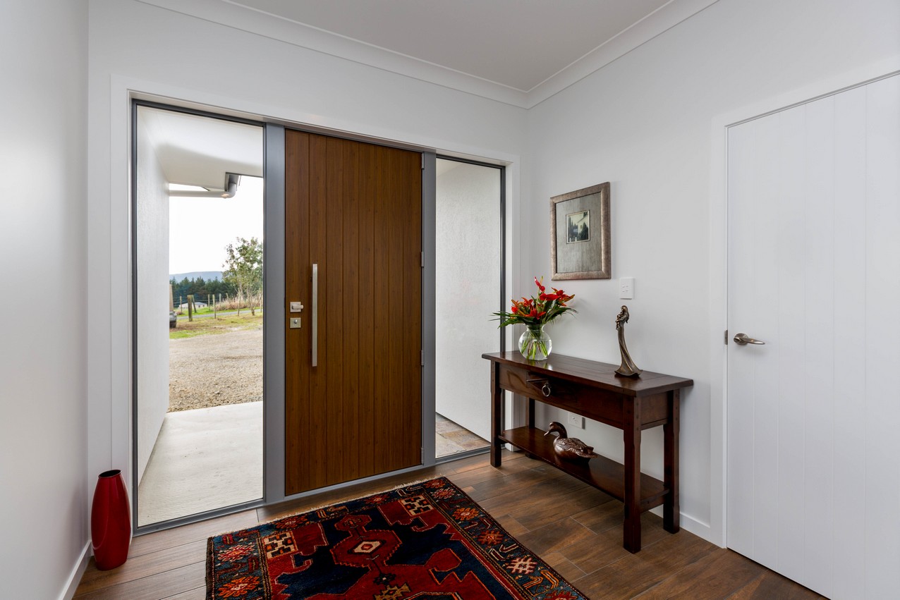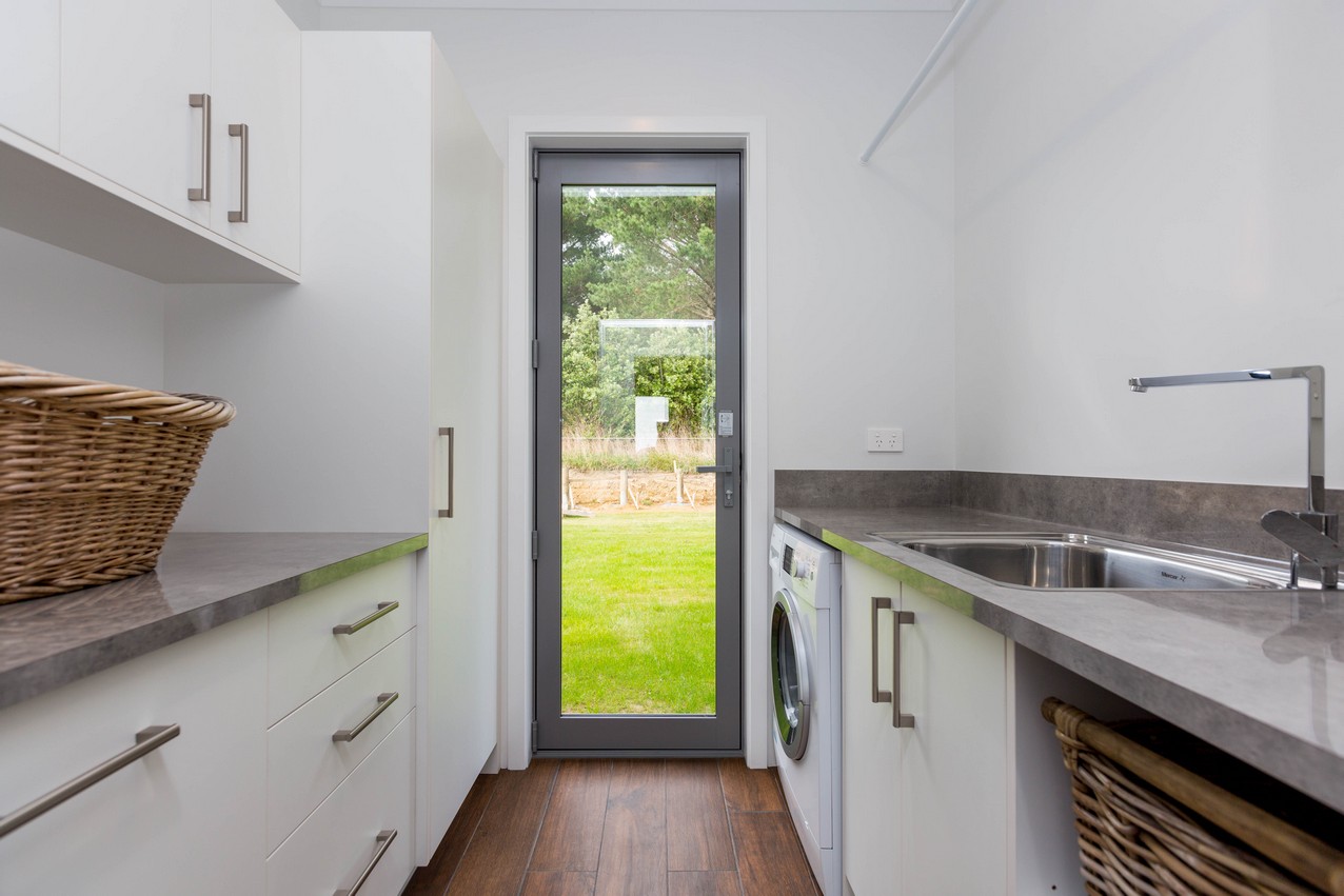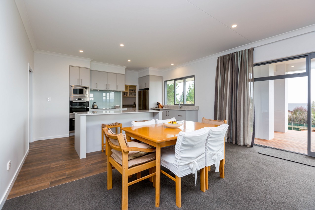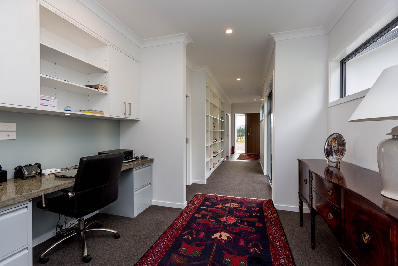 Approaching the driveway, it’s easy to appreciate the harmonious union of Rockcote plaster and Linea weatherboard in contrasting greys. The aluminium front door in dark walnut woodgrain is inviting and durable. Inside, timber-look tile planks contrast with stark white walls, drawing the eye into the magnificent hallway that serves as a gallery, library, office alcove and cosy sitting spot. Recesses, nooks, large windows and sliding doors reign supreme in this home, leading to hidden treasures and outdoor rewards. The hallway is the heart of the home, with specialised shelving for books, photos and much-loved mementos. The office nook boasts a unique polished concrete top with highlights of blue glass and a periglacial blue finish to the back wall. A private sitting area is the perfect place to read or enjoy a quiet drink and chat. In the main bathroom, a freestanding Athena Cassini bath rests under bi-fold windows so the bather can enjoy the view while relaxing after a hard day’s work. A spacious scullery-equipped kitchen and a freestanding fire welcome guests into the open-plan living area. A double garage, with separate quad bike access, and a well-appointed laundry serve the clients’ needs nicely. Bedrooms and living spaces all flow to covered decks, taking in the views. In the master suite, sliding doors open in three directions for superior outdoor flow. A generous walk-in wardrobe and ensuite complete these fine sleeping quarters.
