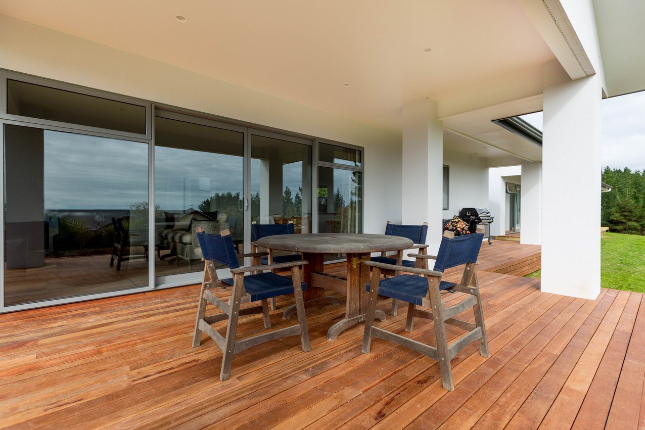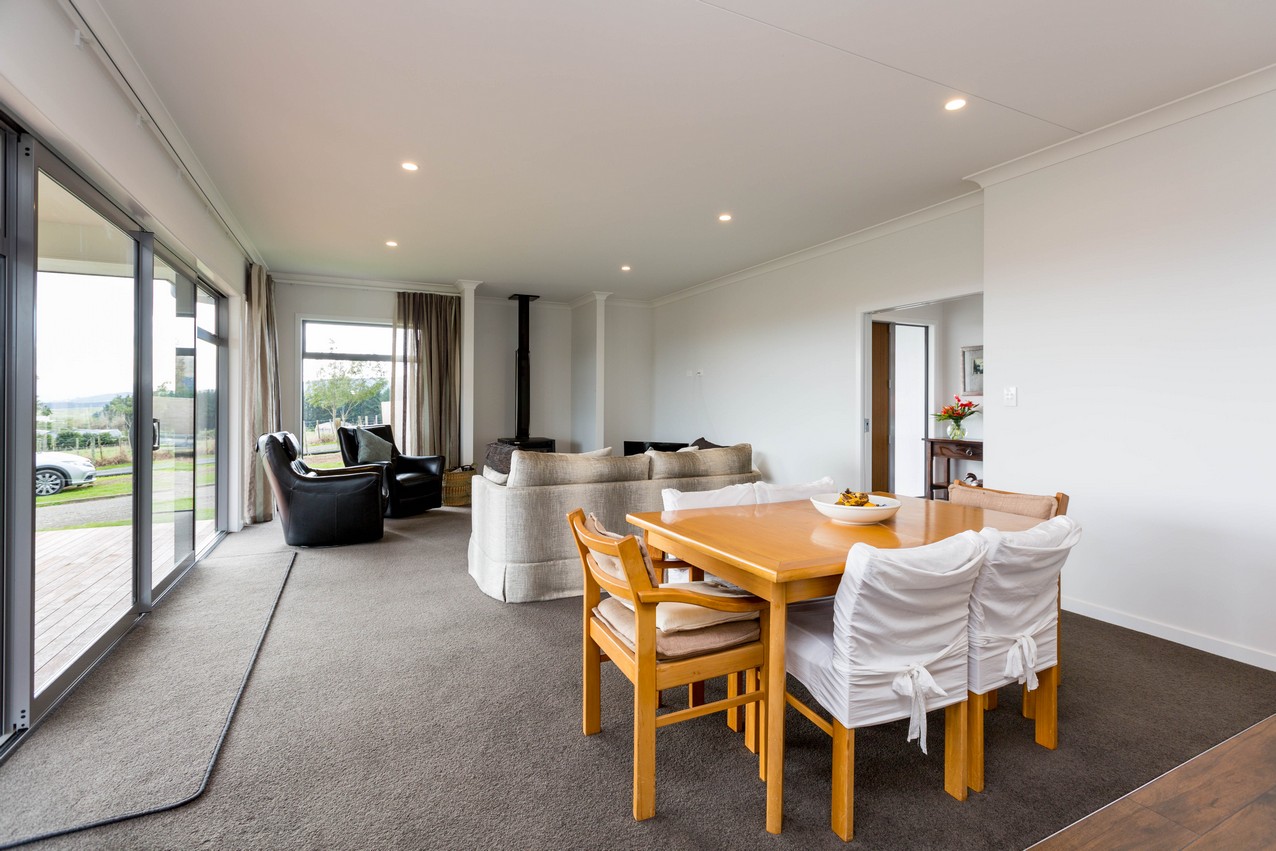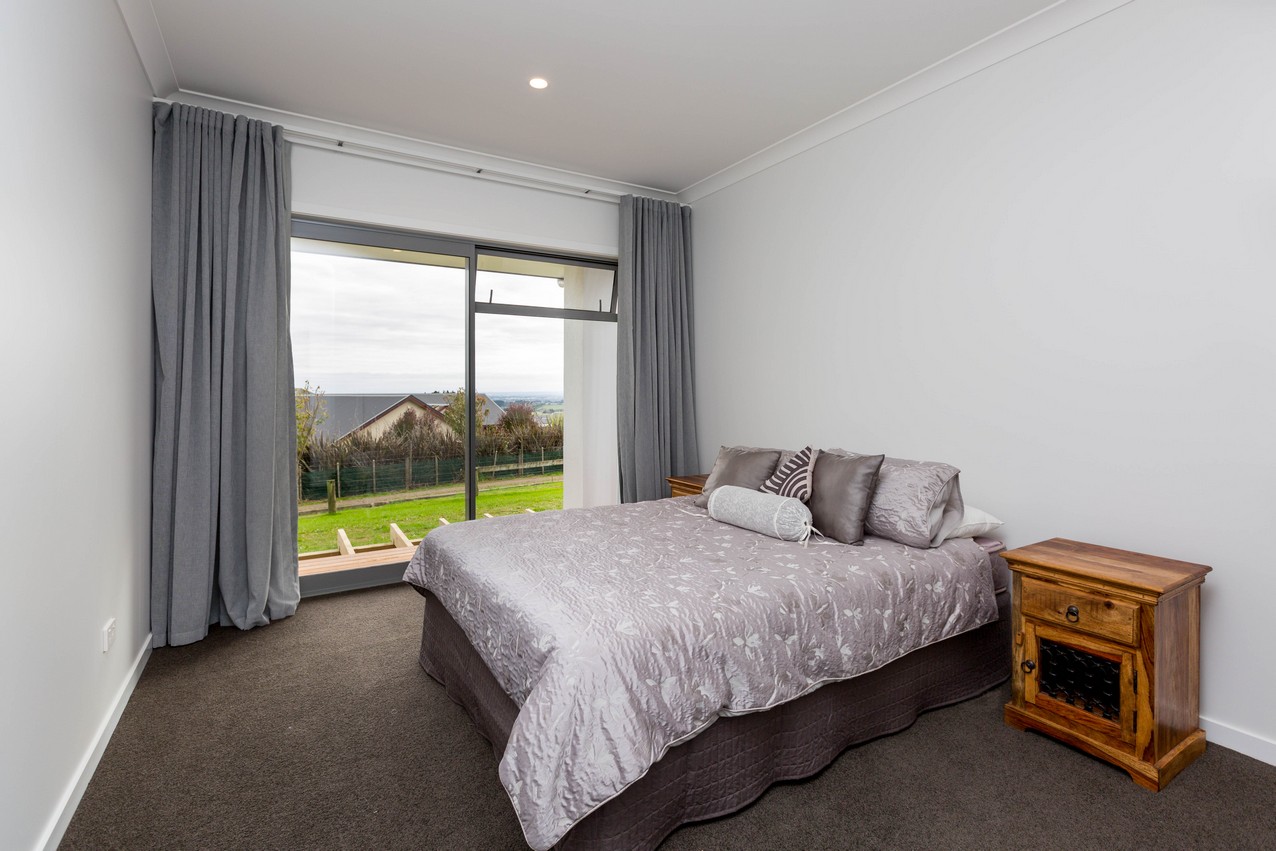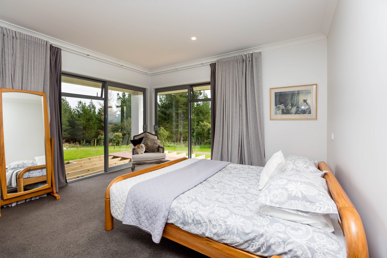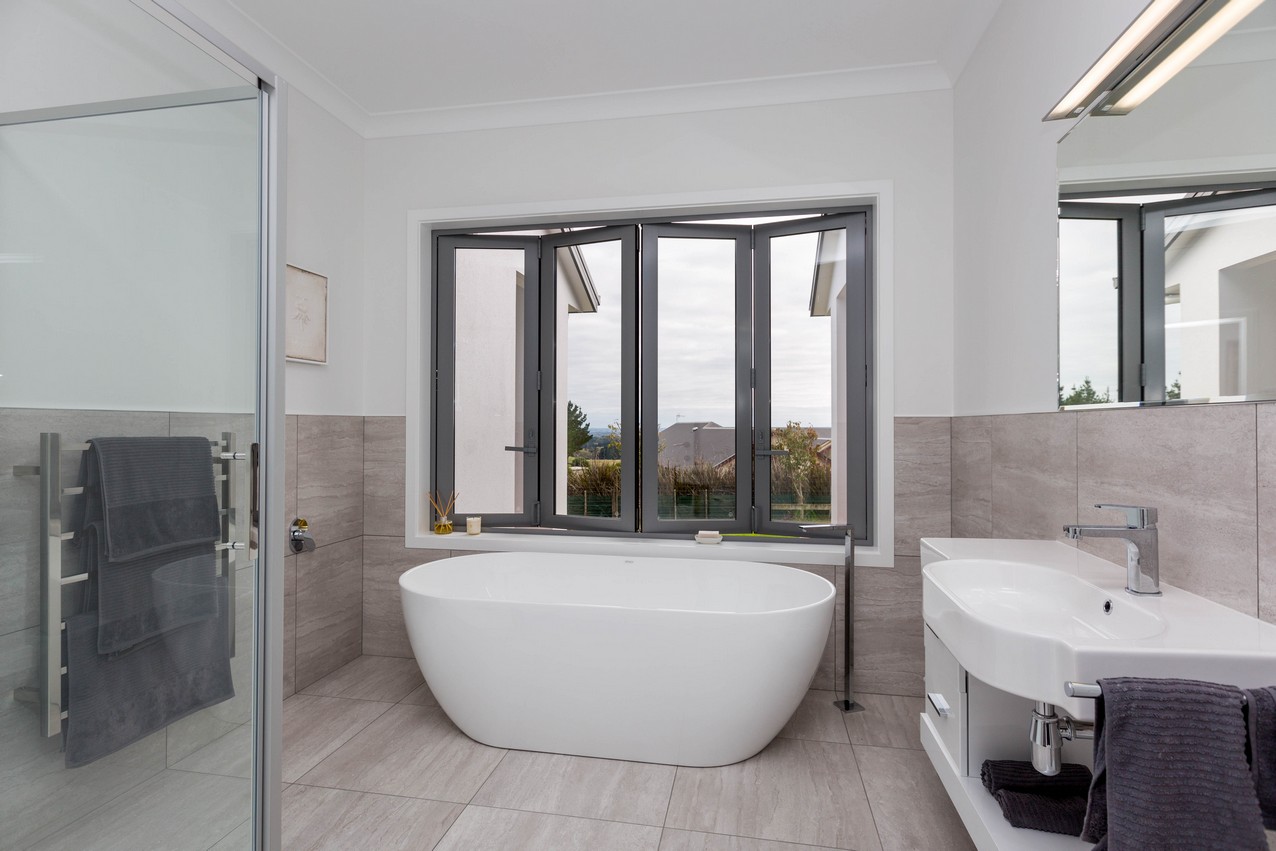Approaching the driveway, it’s easy to appreciate the harmonious union of Rockcote plaster and Linea weatherboard in contrasting greys. The aluminium front door in dark walnut woodgrain is inviting and durable. Inside, timber-look tile planks contrast with stark white walls, drawing the eye into the magnificent hallway that serves as a gallery, library, office alcove and cosy sitting spot. Recesses, nooks, large windows and sliding doors reign supreme in this home, leading to hidden treasures and outdoor rewards. The hallway is the heart of the home, with specialised shelving for books, photos and much-loved mementos. The office nook boasts a unique polished concrete top with highlights of blue glass and a periglacial blue finish to the back wall. A private sitting area is the perfect place to read or enjoy a quiet drink and chat. In the main bathroom, a freestanding Athena Cassini bath rests under bi-fold windows so the bather can enjoy the view while relaxing after a hard day’s work. A spacious scullery-equipped kitchen and a freestanding fire welcome guests into the open-plan living area. A double garage, with separate quad bike access, and a well-appointed laundry serve the clients’ needs nicely. Bedrooms and living spaces all flow to covered decks, taking in the views. In the master suite, sliding doors open in three directions for superior outdoor flow. A generous walk-in wardrobe and ensuite complete these fine sleeping quarters.