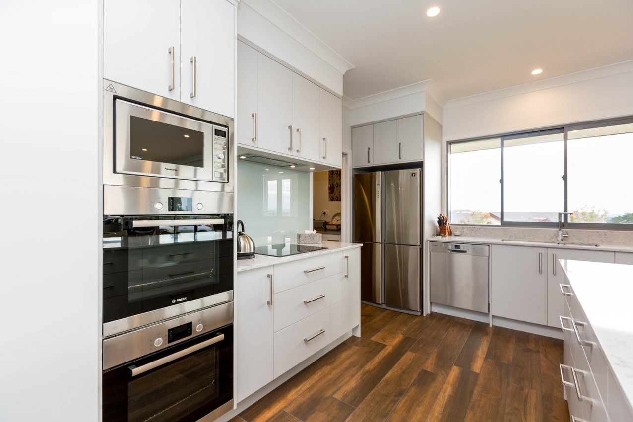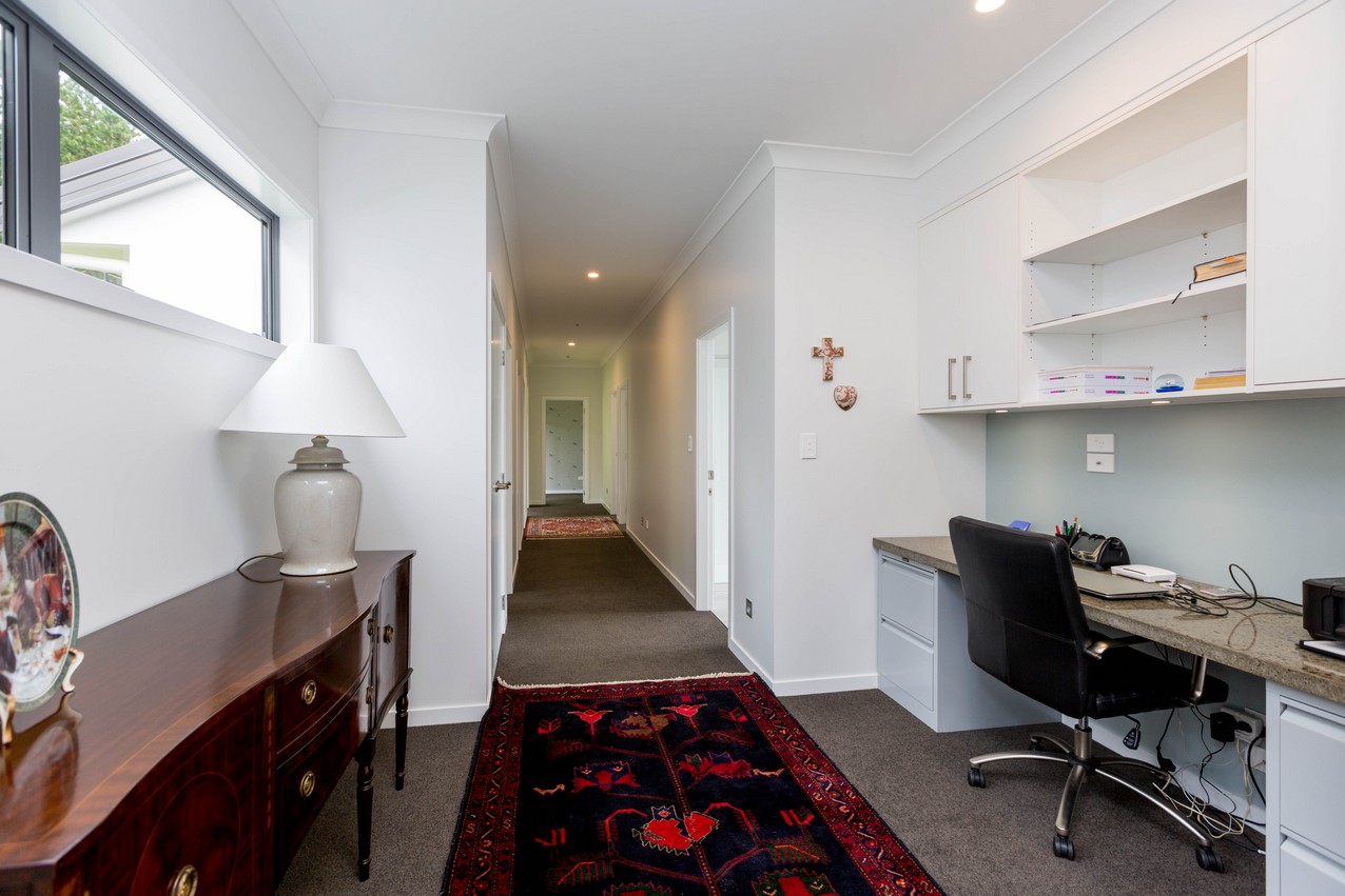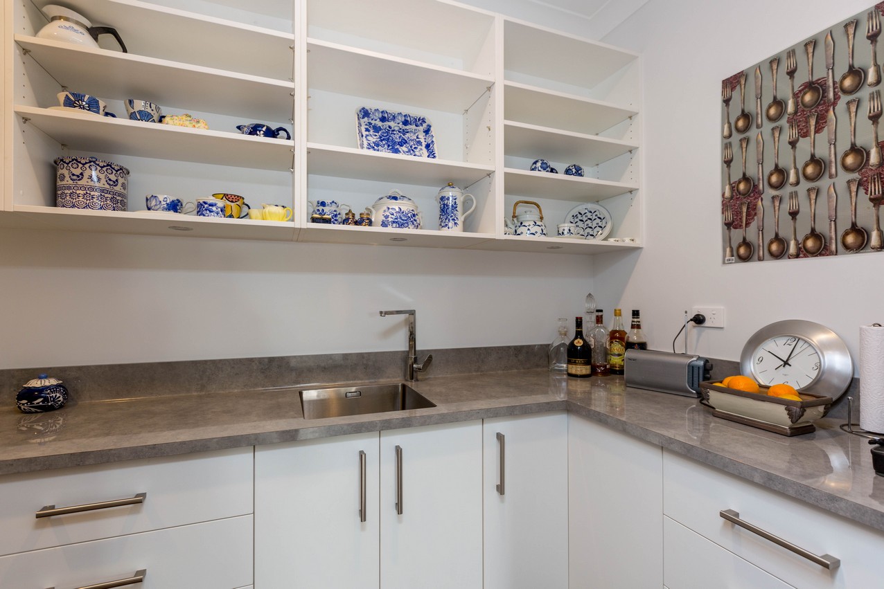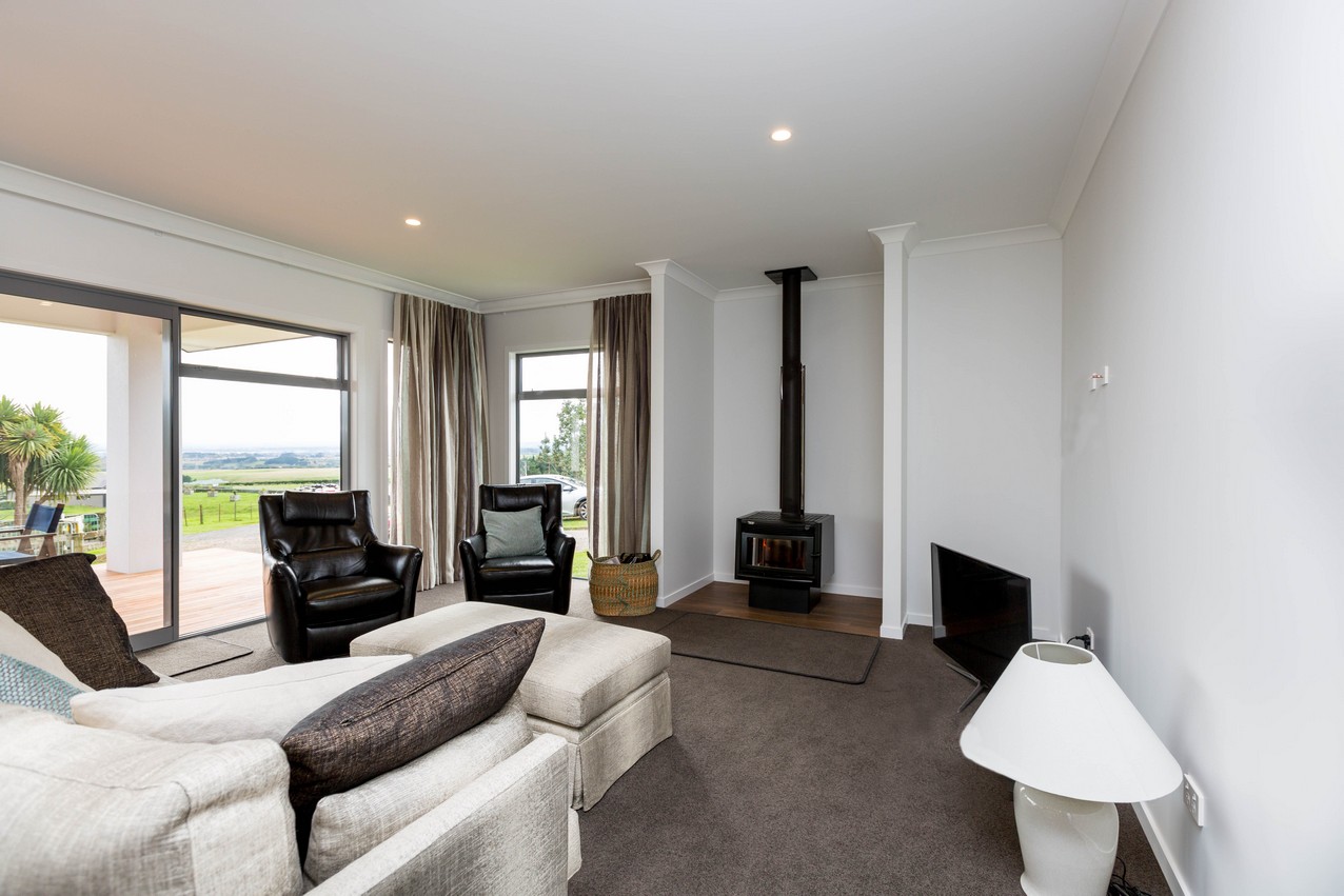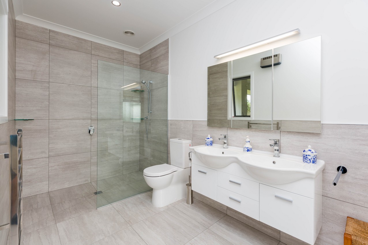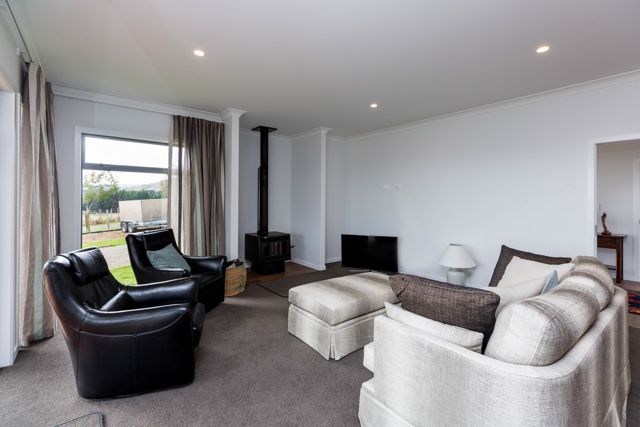 Approaching the driveway, it’s easy to appreciate the harmonious union of Rockcote plaster and Linea weatherboard in contrasting greys. The aluminium front door in dark walnut woodgrain is inviting and durable. Inside, timber-look tile planks contrast with stark white walls, drawing the eye into the magnificent hallway that serves as a gallery, library, office alcove and cosy sitting spot. Recesses, nooks, large windows and sliding doors reign supreme in this home, leading to hidden treasures and outdoor rewards. The hallway is the heart of the home, with specialised shelving for books, photos and much-loved mementos. The office nook boasts a unique polished concrete top with highlights of blue glass and a periglacial blue finish to the back wall. A private sitting area is the perfect place to read or enjoy a quiet drink and chat. In the main bathroom, a freestanding Athena Cassini bath rests under bi-fold windows so the bather can enjoy the view while relaxing after a hard day’s work. A spacious scullery-equipped kitchen and a freestanding fire welcome guests into the open-plan living area. A double garage, with separate quad bike access, and a well-appointed laundry serve the clients’ needs nicely. Bedrooms and living spaces all flow to covered decks, taking in the views. In the master suite, sliding doors open in three directions for superior outdoor flow. A generous walk-in wardrobe and ensuite complete these fine sleeping quarters.
