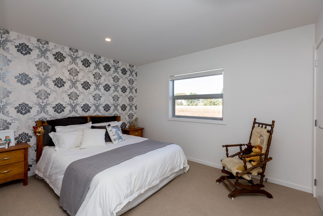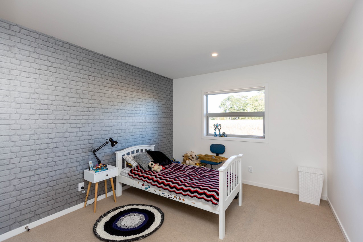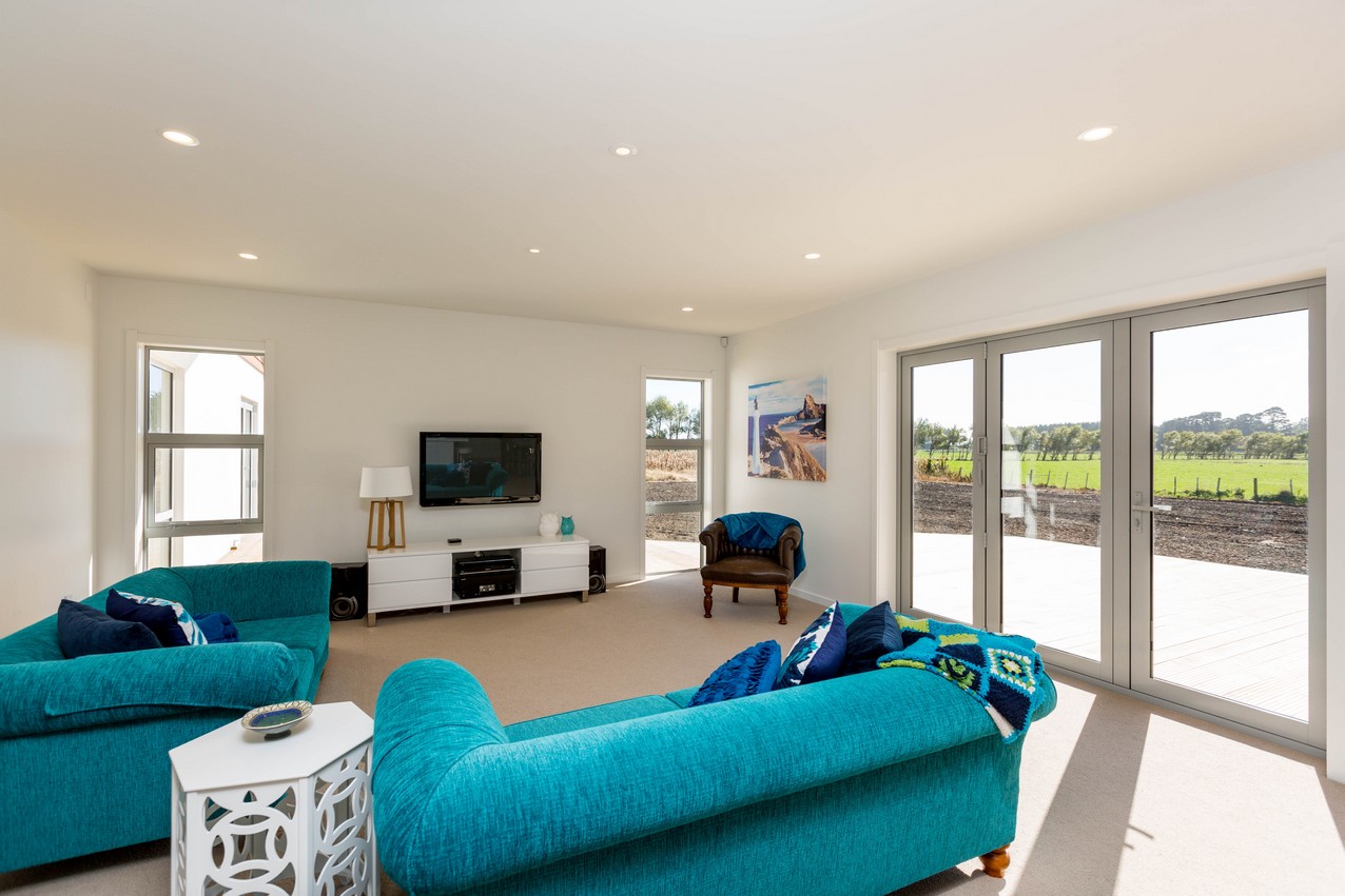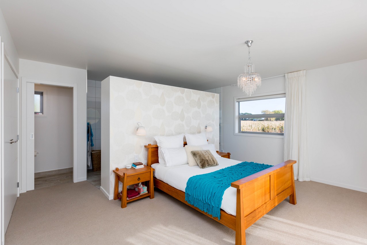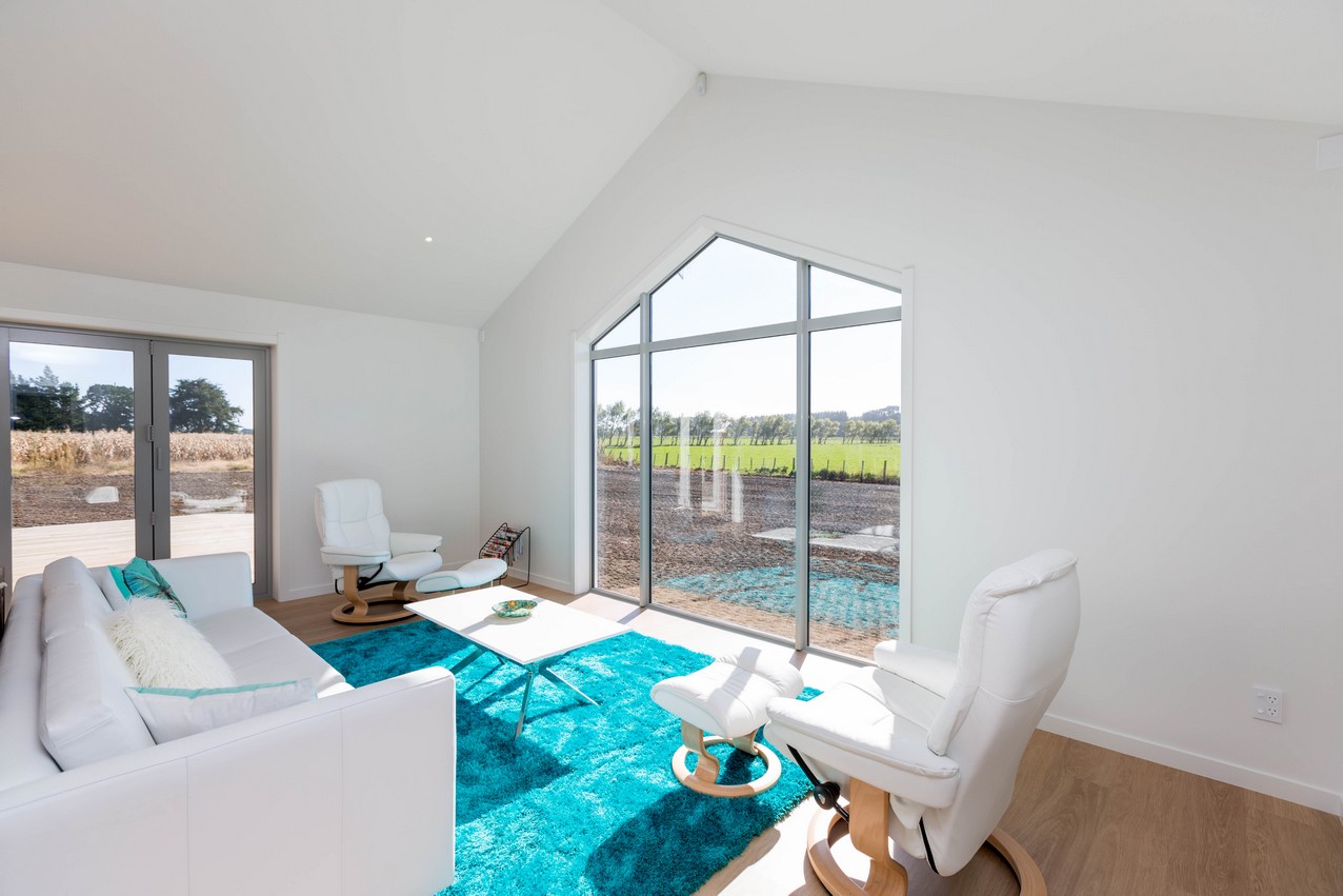 The front entry to the home is stunning and unique. A feature rock wall flows from the front door through the entrance into the home. This opens up to a light-filled kitchen/family area, which is the heart of this home and central to work, craft and leisure areas. The fantastic views over farmland to Mount Ruapehu, with cathedral ceiling and feature window, add a serving of ‘X’ factor. Huge sliding doors between the open-plan living space and lounge can create one spacious room. Four interior living rooms provide ample options for the evolving needs of family life. The children’s playroom is designed to convert into a study space down the track. The well-planned office is also located close to the heart of the home. Three sets of bi-fold doors provide great flow to large decks, flexible entertaining and play areas for the family. Modern, clean lines and an understated colour palette provide a blank canvas for the owners’ personal style. Well-chosen feature walls add appeal in the bedrooms. Open the wardrobes to discover different coloured interiors, which add a whole new dimension to each room. The ensuite includes a large double vanity, free- standing stone bathtub and tiled shower. This home is both practical and stylish. It fits the owners’ lifestyle and desire for a sustainable home. It is all about “living the dream”.