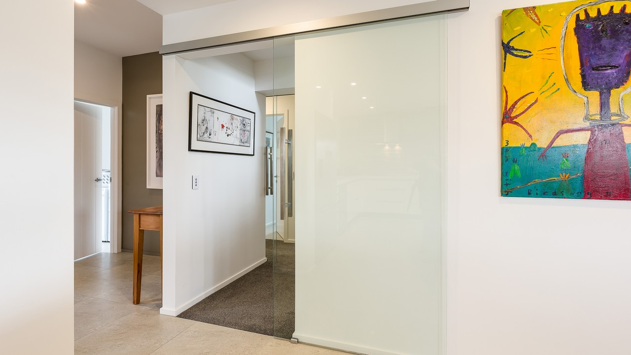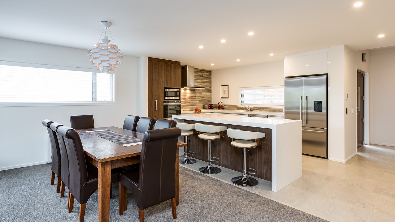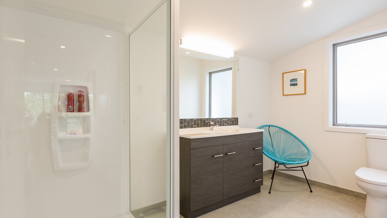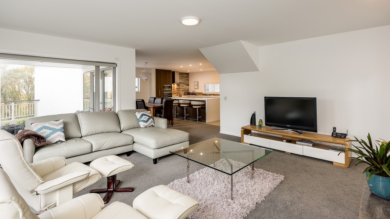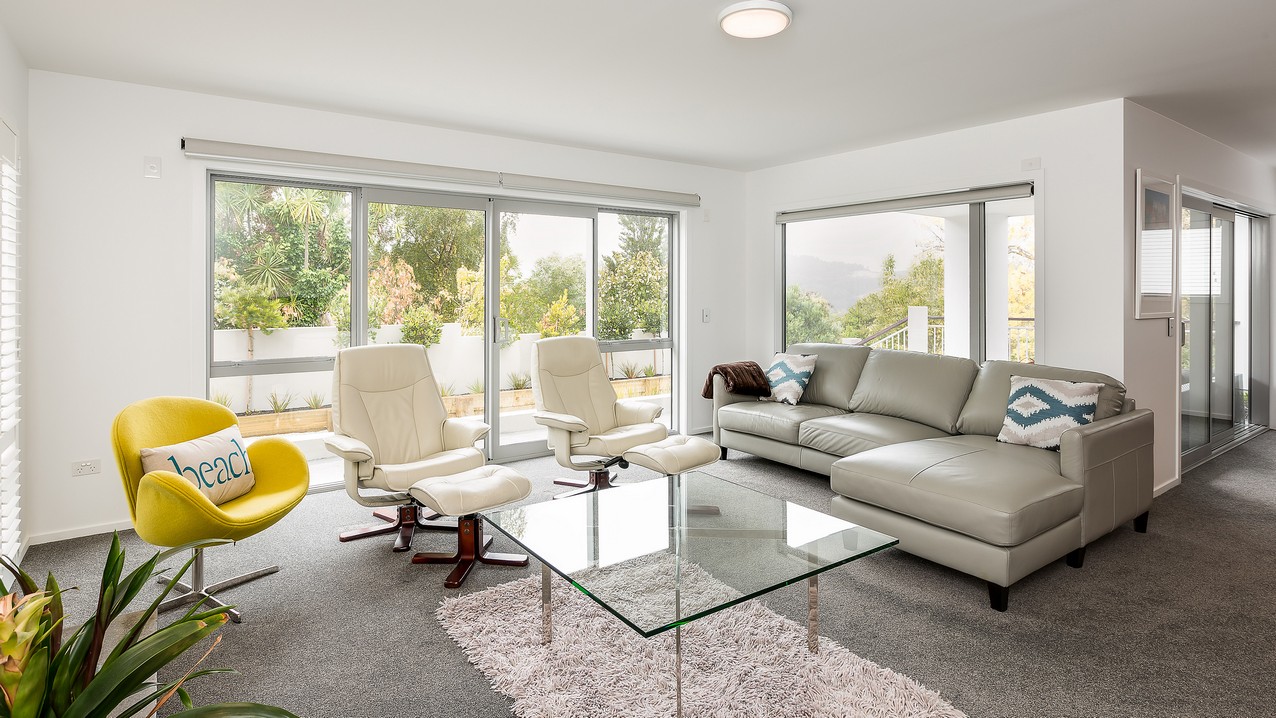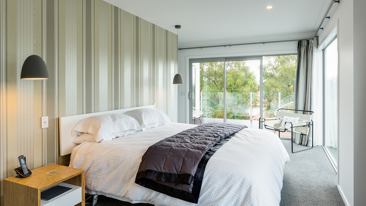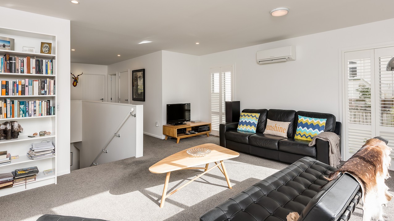 Two heatpumps and a feature wood burner, set on a raised floating hearth in rustic polished concrete, warm the home when it’s cold out. Good insulation means there’s no undue pressure on the power bill. Underfloor heating has the bathrooms and kitchen floors covered. The tiling has been executed brilliantly throughout, with impressive attention to detail. You’ll see this in the elegant kitchen’s feature splashback, which promises easy cleaning for the busy residents. Top-hung glass sliders take you through to the bedrooms, bathroom and toilet. Stairs lead to an upper sitting area and private deck overlooking the town belt. A detached garage, constructed in the same claddings and palette as the house, provides secure parking, plus room to turn the car around – no backing out onto a busy road for these folks.