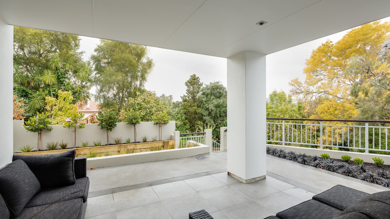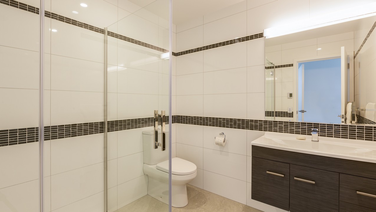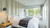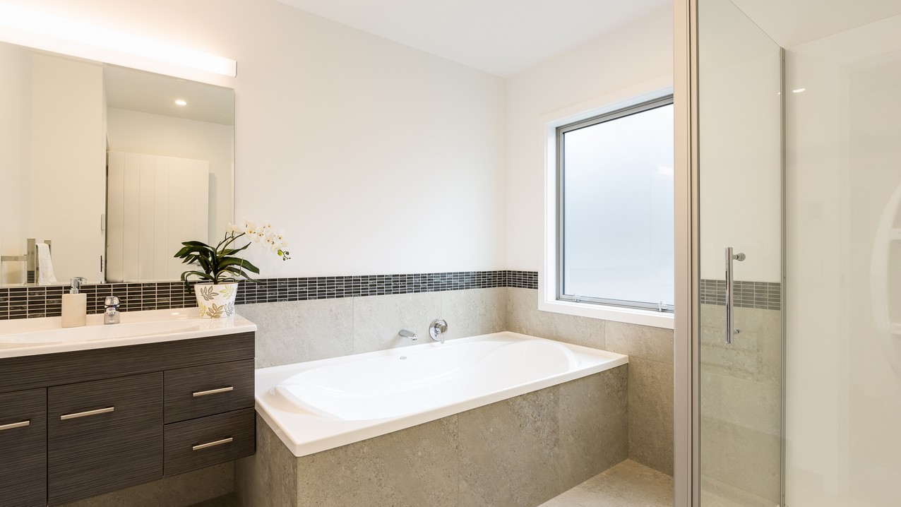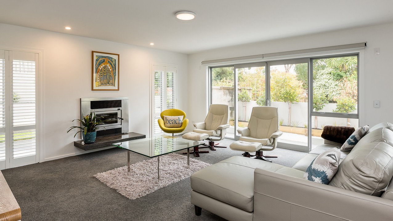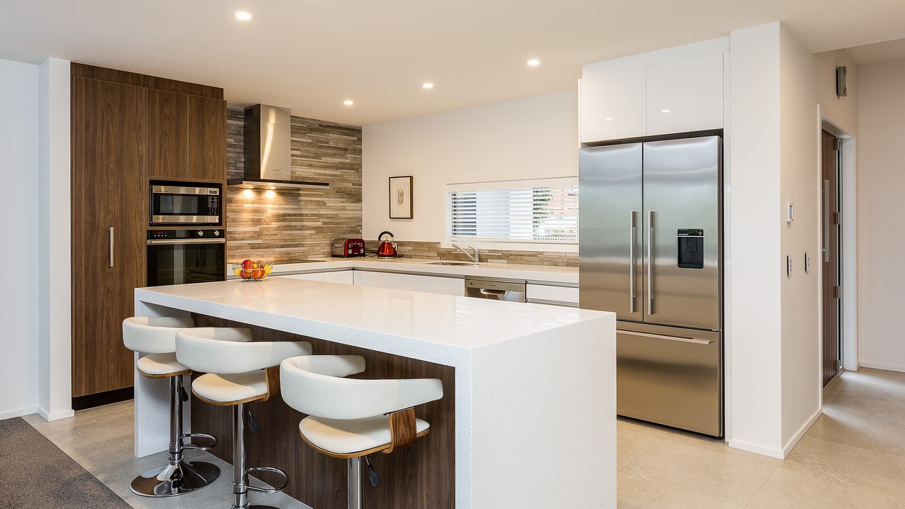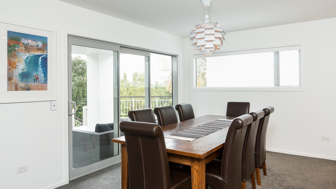 Two heatpumps and a feature wood burner, set on a raised floating hearth in rustic polished concrete, warm the home when it’s cold out. Good insulation means there’s no undue pressure on the power bill. Underfloor heating has the bathrooms and kitchen floors covered. The tiling has been executed brilliantly throughout, with impressive attention to detail. You’ll see this in the elegant kitchen’s feature splashback, which promises easy cleaning for the busy residents. Top-hung glass sliders take you through to the bedrooms, bathroom and toilet. Stairs lead to an upper sitting area and private deck overlooking the town belt. A detached garage, constructed in the same claddings and palette as the house, provides secure parking, plus room to turn the car around – no backing out onto a busy road for these folks.