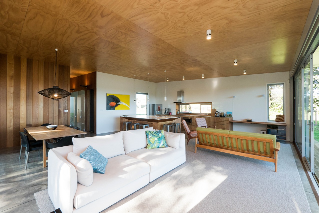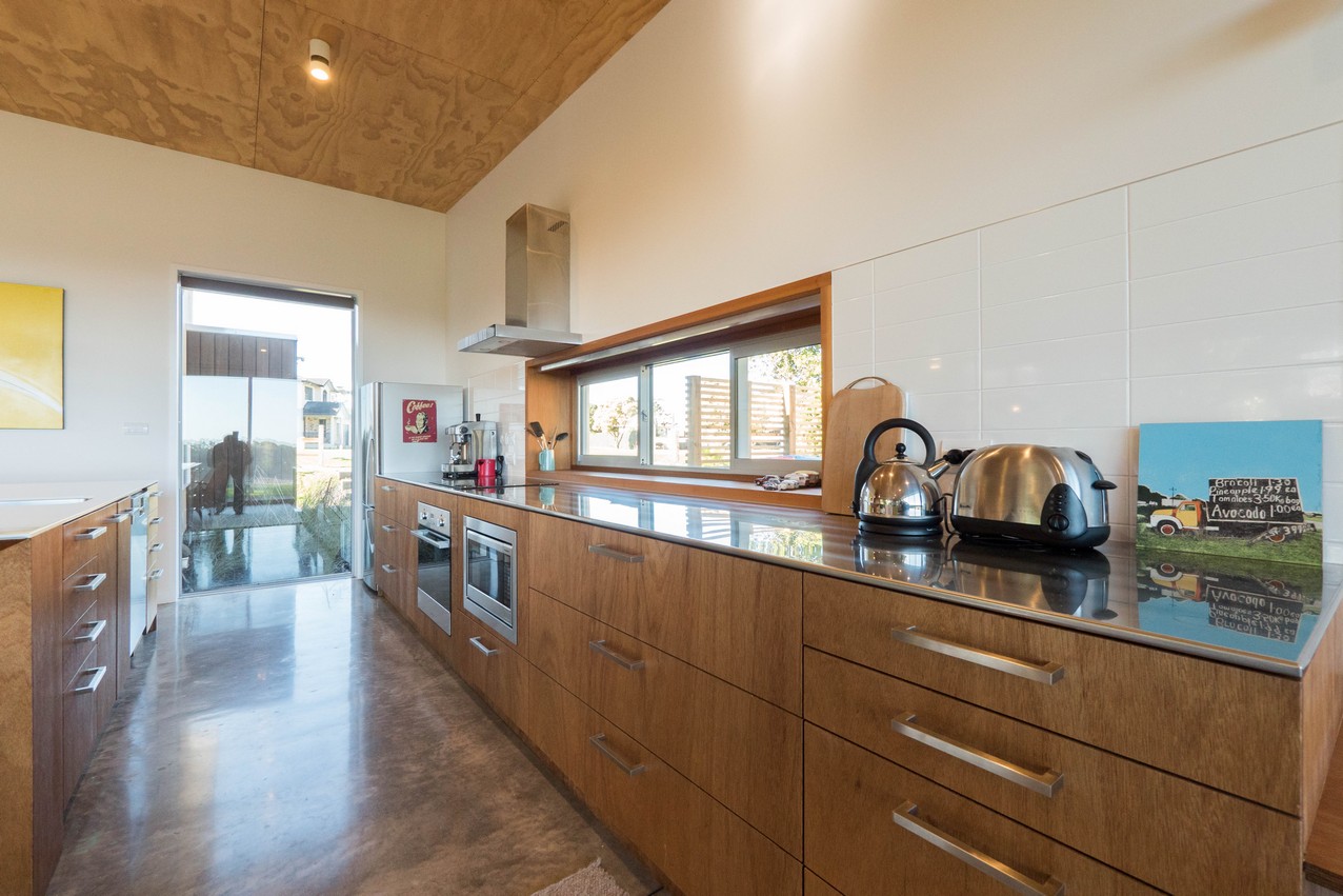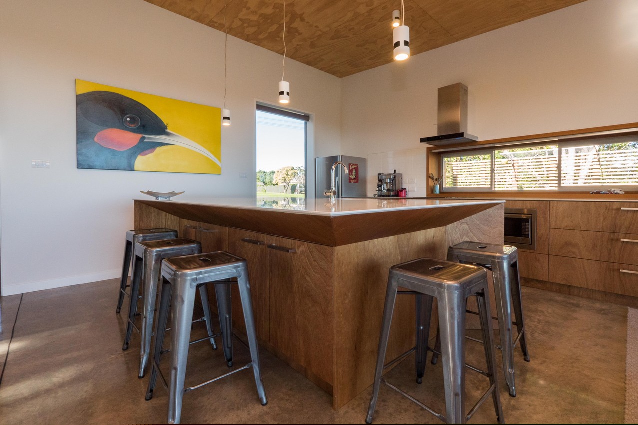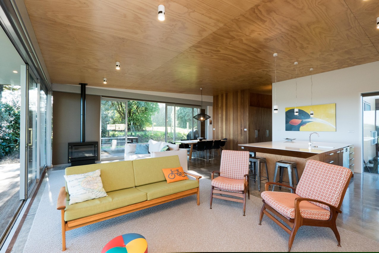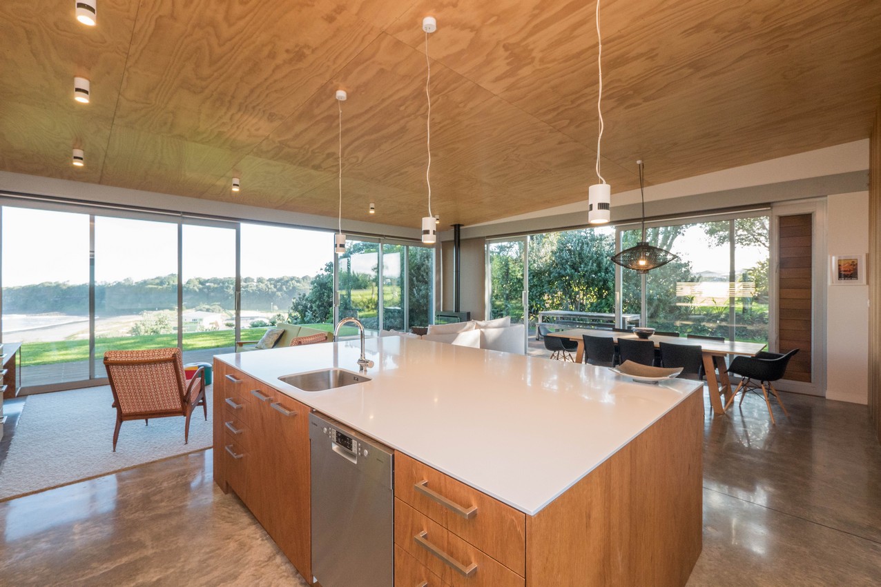 High timber ceilings and complementary wall features create a cocoon-like feel in the modern open-plan. Extensive glazing on two walls welcomes in natural light and frames the relaxing scenery. Polished concrete floors offer good thermal mass for solar gain. A wood burner adds ambience and warmth in winter. Huge glass sliders can be drawn back, creating a breezy interior in summer. The adjoining alfresco space is a beautiful spot to enjoy the sun and connect with nature. The kitchen is set against a backdrop of white, while the cabinetry is in keeping with the warming wood aesthetic. A modern central island bench provides a lovely spot to grab a coffee or quick breakfast. It’s well-oriented to the dining room and lounge, so the chef can socialise with guests while preparing dinner. Bedrooms include a children’s retreat and two rooms with separate outdoor access.