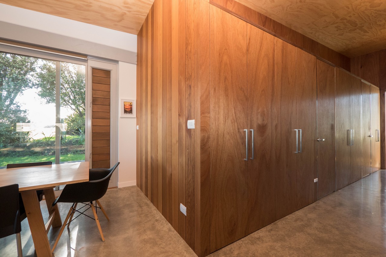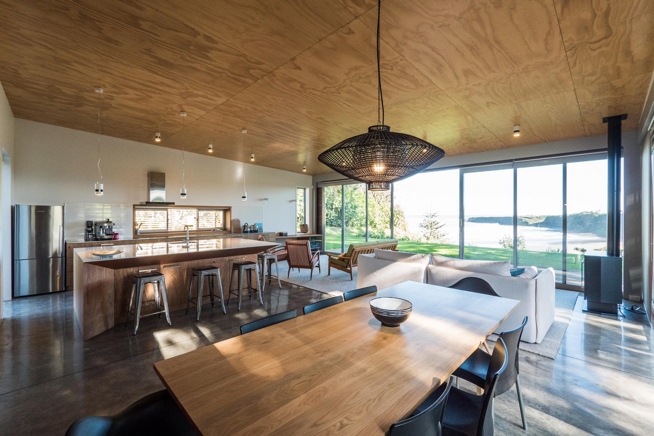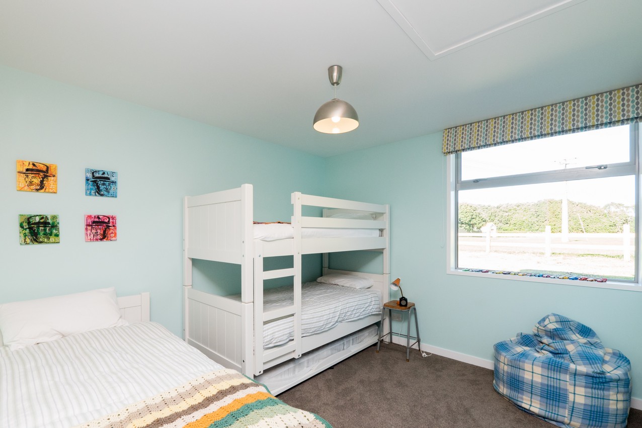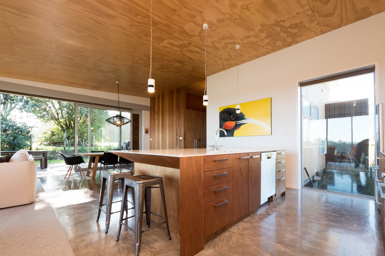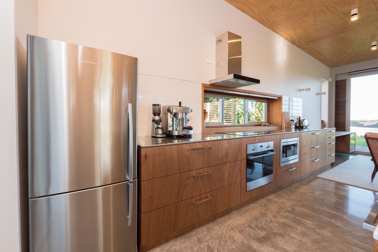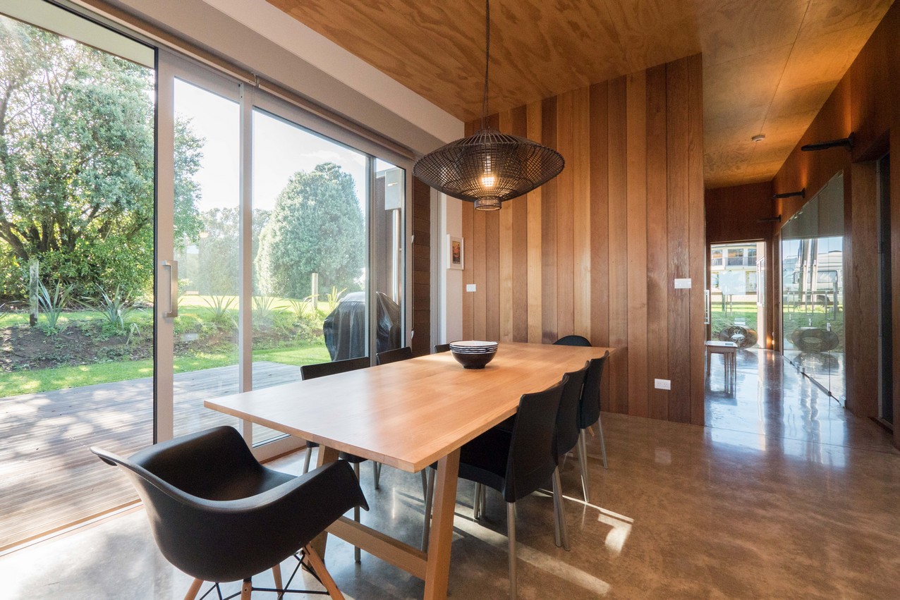 High timber ceilings and complementary wall features create a cocoon-like feel in the modern open-plan. Extensive glazing on two walls welcomes in natural light and frames the relaxing scenery. Polished concrete floors offer good thermal mass for solar gain. A wood burner adds ambience and warmth in winter. Huge glass sliders can be drawn back, creating a breezy interior in summer. The adjoining alfresco space is a beautiful spot to enjoy the sun and connect with nature. The kitchen is set against a backdrop of white, while the cabinetry is in keeping with the warming wood aesthetic. A modern central island bench provides a lovely spot to grab a coffee or quick breakfast. It’s well-oriented to the dining room and lounge, so the chef can socialise with guests while preparing dinner. Bedrooms include a children’s retreat and two rooms with separate outdoor access.
