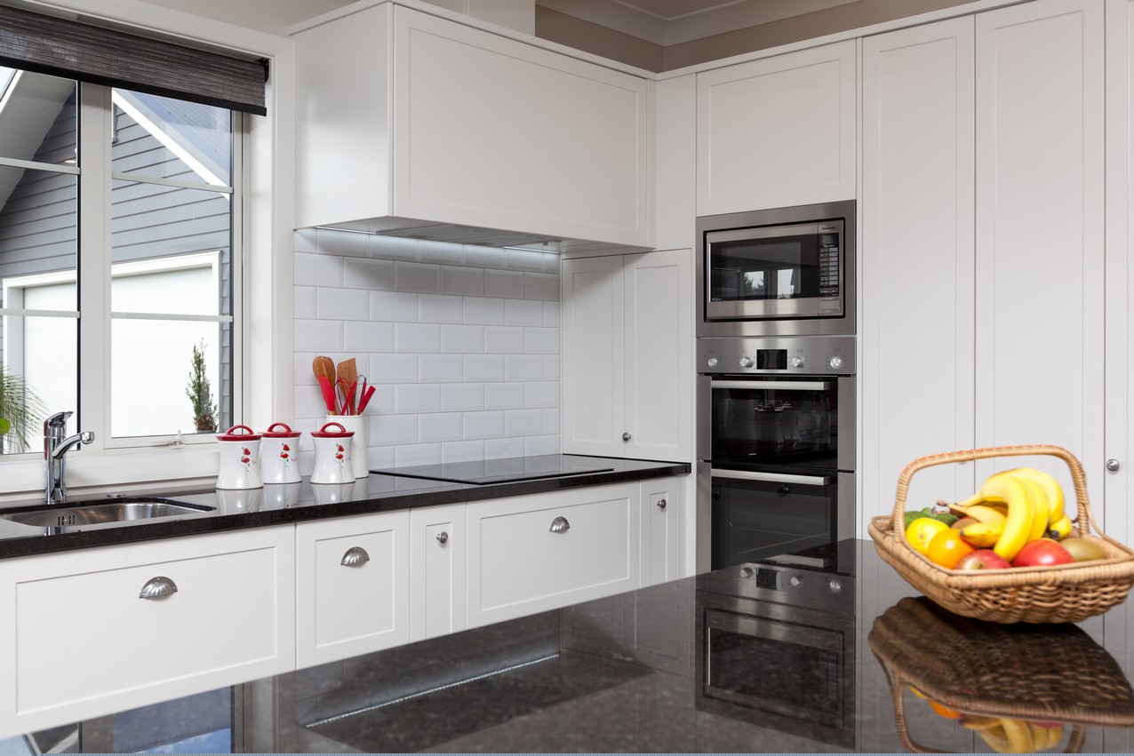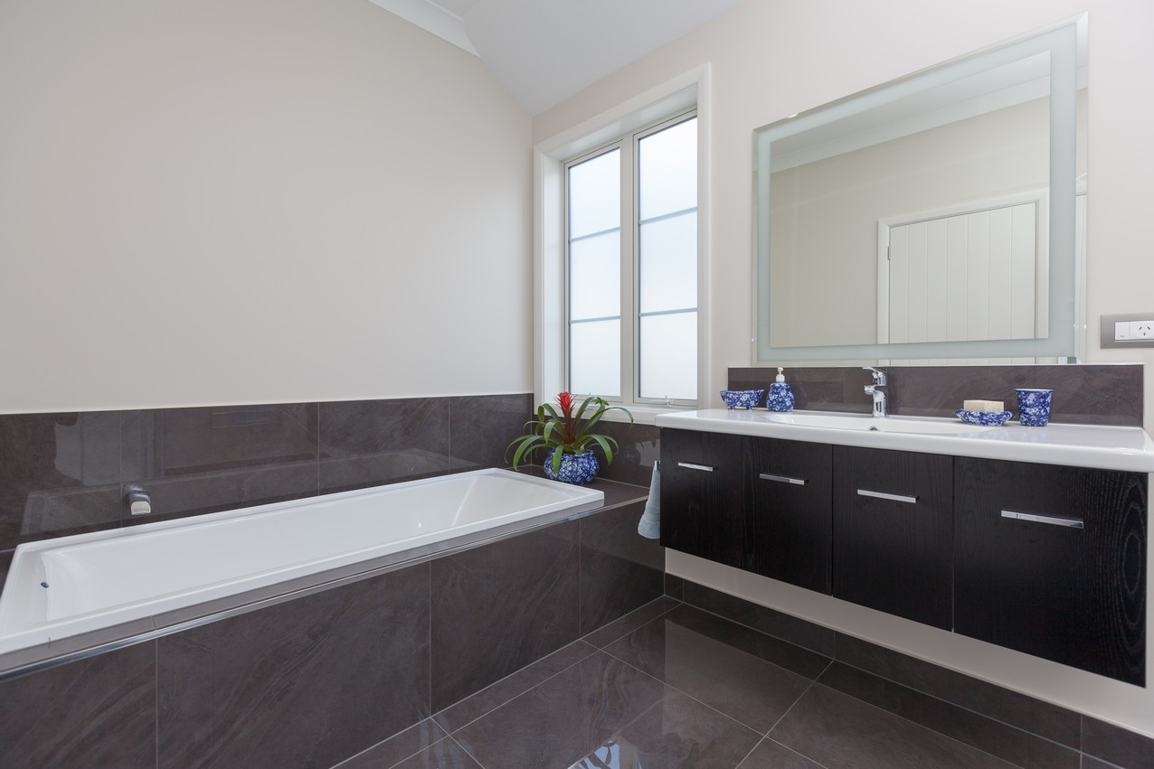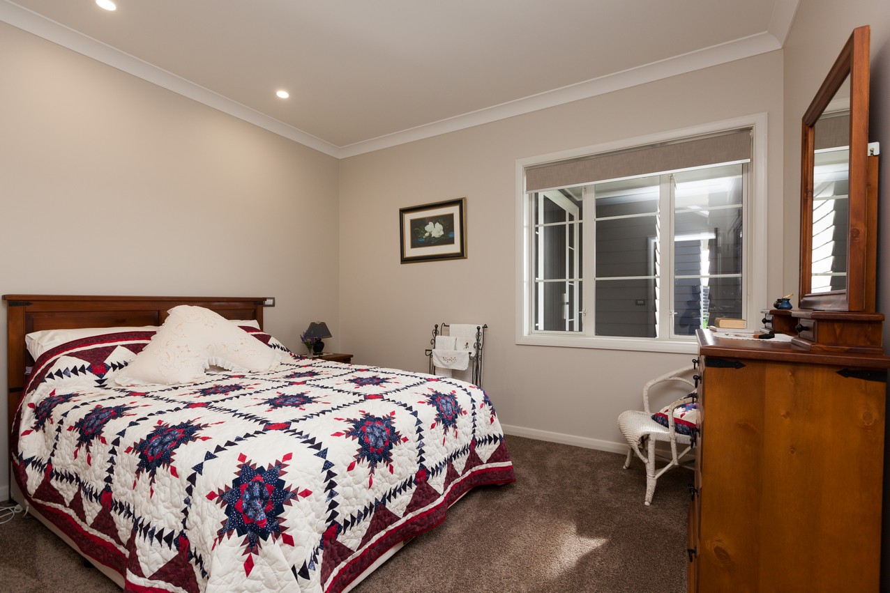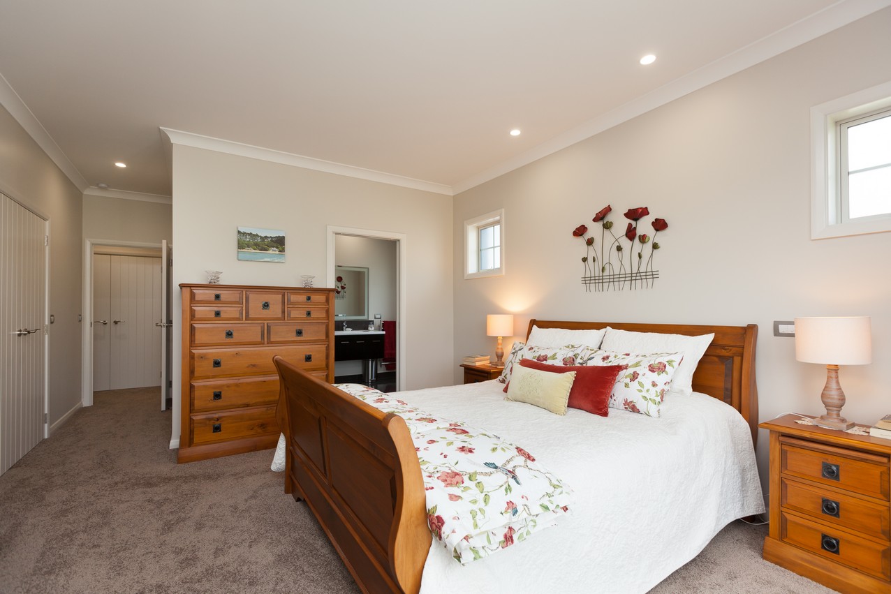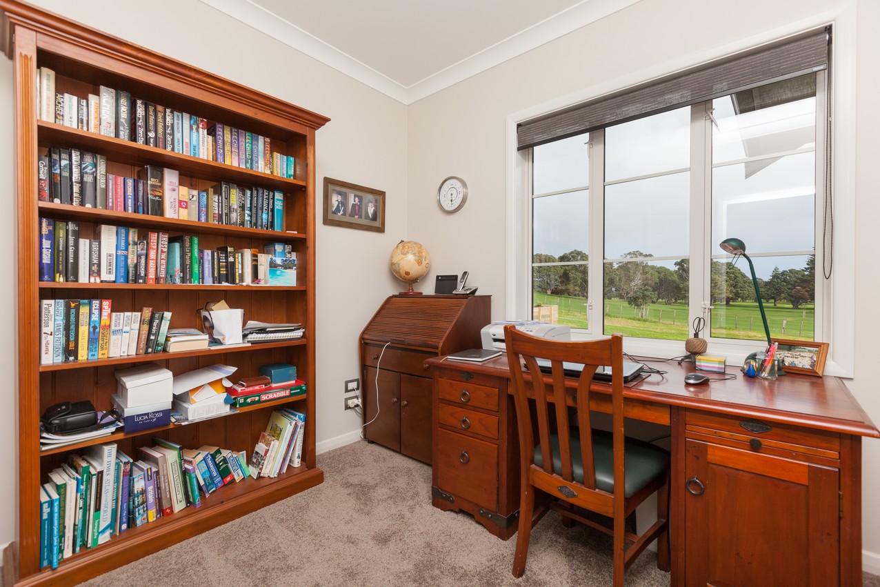 On the other side, doors open to the elegant and traditional shared living space. Carpet creates a cosy atmosphere in front of the fire. In the kitchen, the north-facing window seat beckons – a beauti ful spot to curl up with that morning coff ee or a weekend read. With a wine fridge in easy reach, it’s also ideal for enjoying an evening refreshment. Beautiful black granite bench tops glisten against the satin-panelled cabinetry. LED strip lighting comes to life at night. Two spacious bathrooms are in keeping with the kitchen’s classic palette. A large frosted window casts a natural glow over the built-in bathtub. With three good-sized bedrooms, the owners can easily cater to guests. Household business can be carried out in the separate study, which has a window overlooking the extensive grounds.