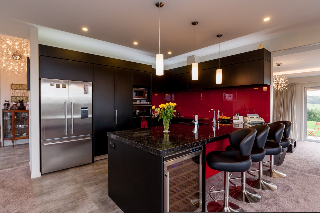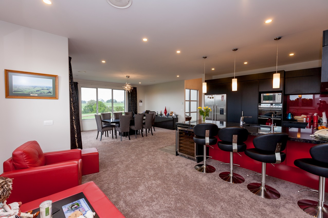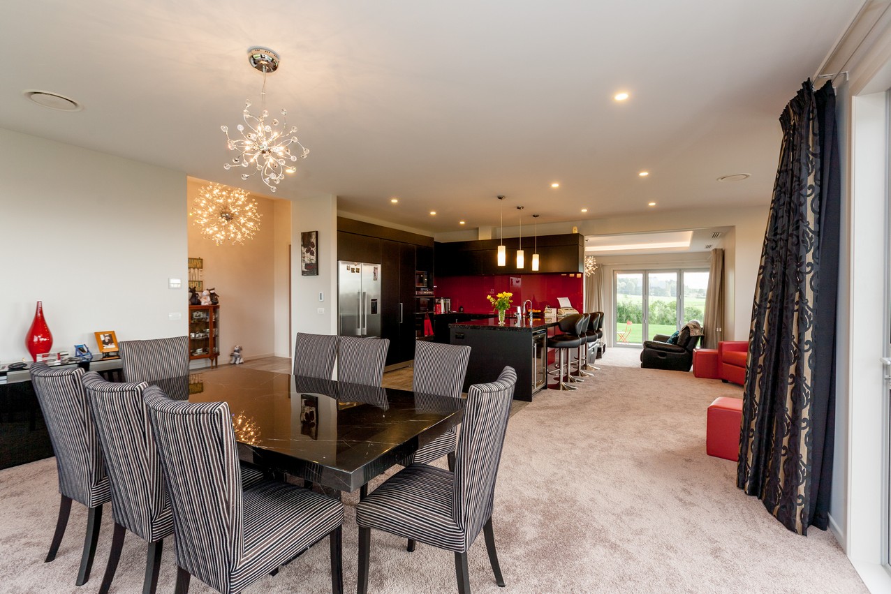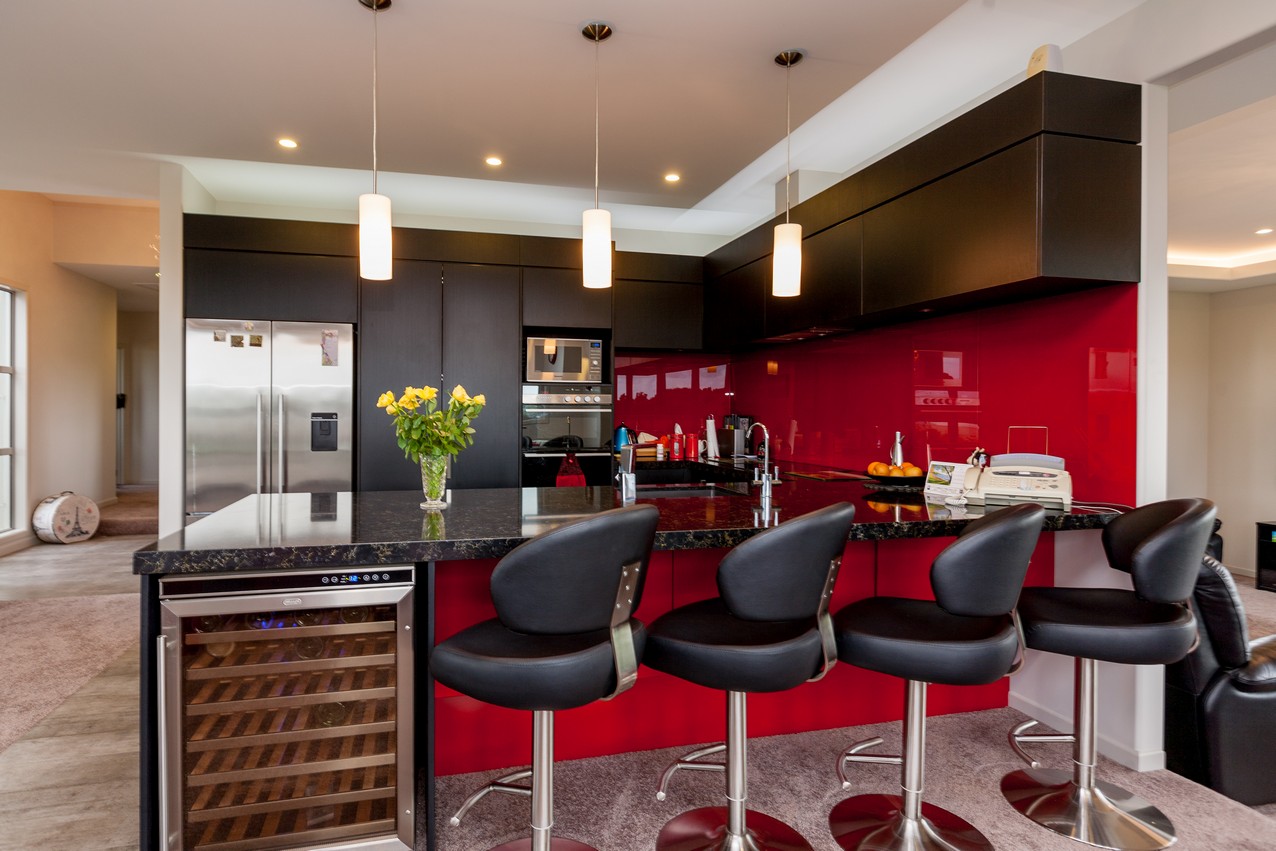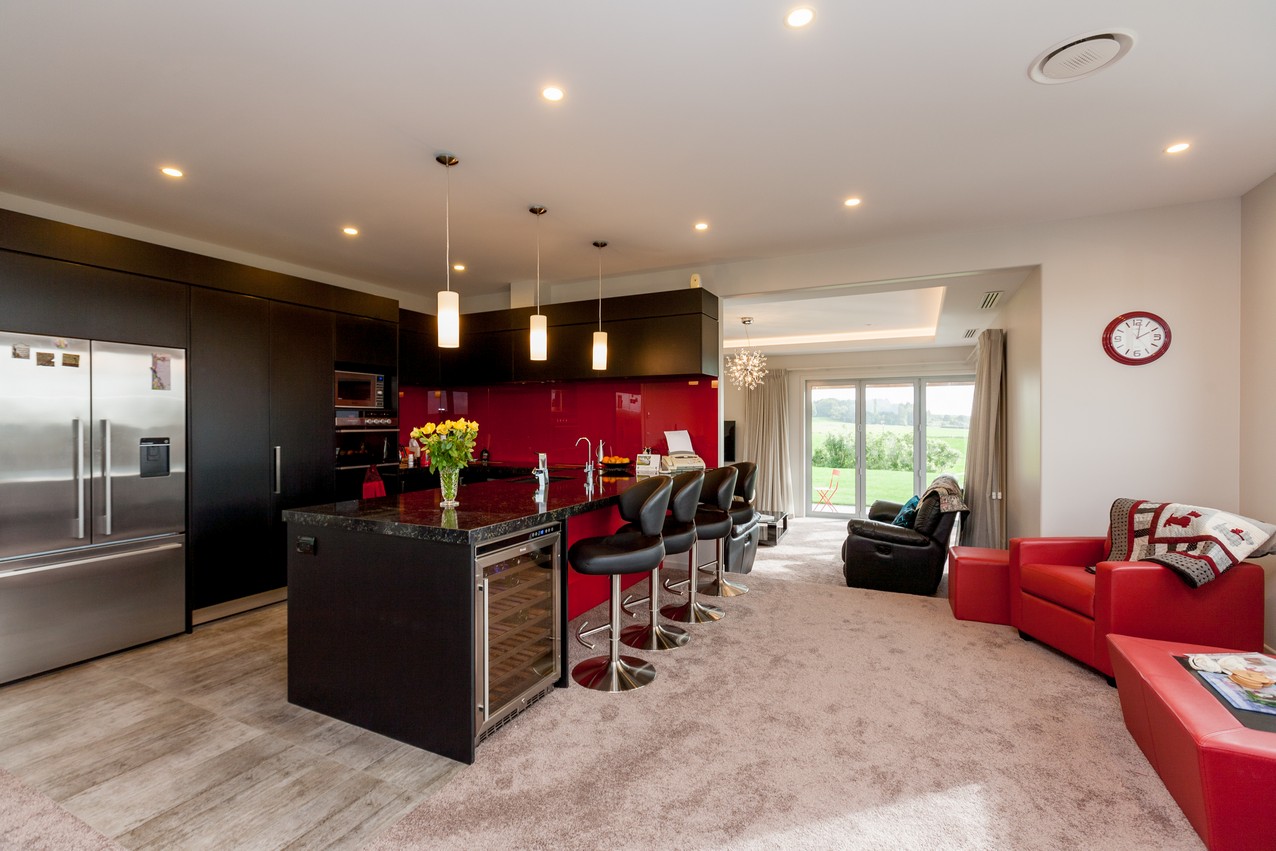 A large formal entry leads to open-plan living – a lovely space to prepare lunch while catching up with friends and family. The kitchen design is rich and elegant. A red splashback adds flavour and ties into the island toekick. Refreshments can be stored close at hand in the wine fridge. Large bi-fold doors in the dining area open to a beautiful landscaped alfresco space, where meals can be served in the sunshine. The 3m ceiling is sure to earn a few gasps from guests in the large formal lounge. A scotia conceals LED strip lighting and air-conditioning vents, making this space bright and breezy. The master bedroom boasts a walk-in wardrobe and ensuite. Two of the three remaining bedrooms can be opened to create one large space. Both bathrooms boast fully tiled showers.