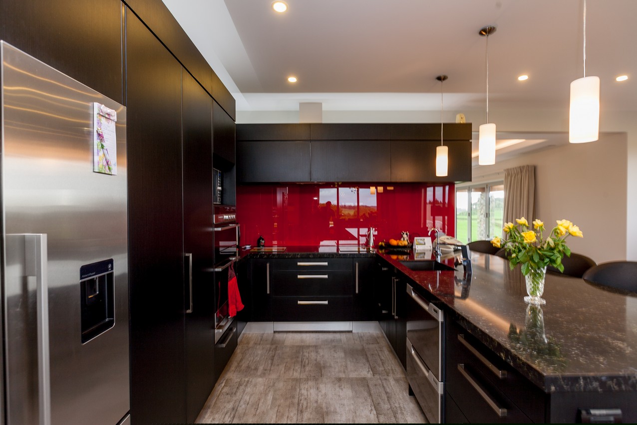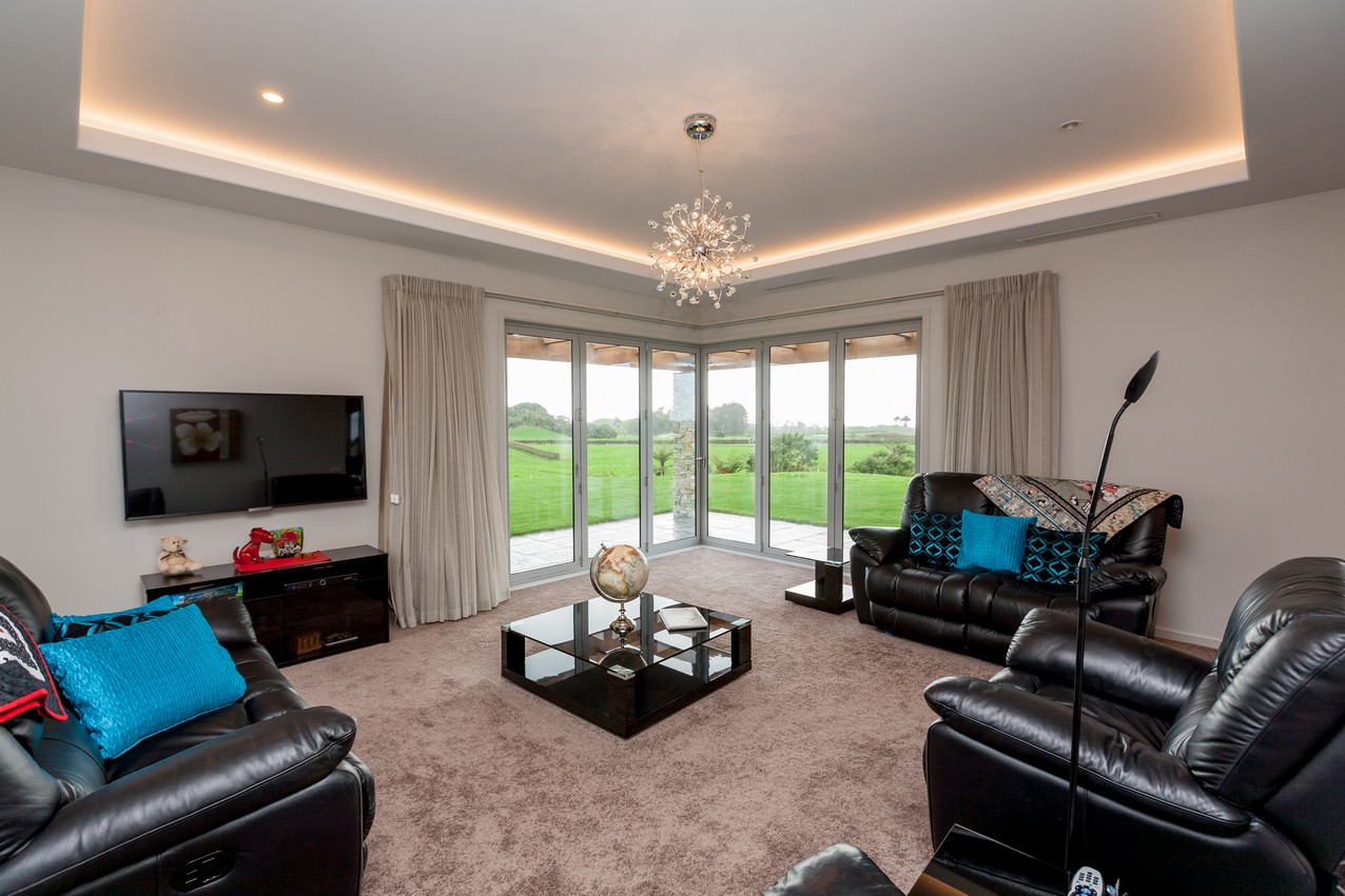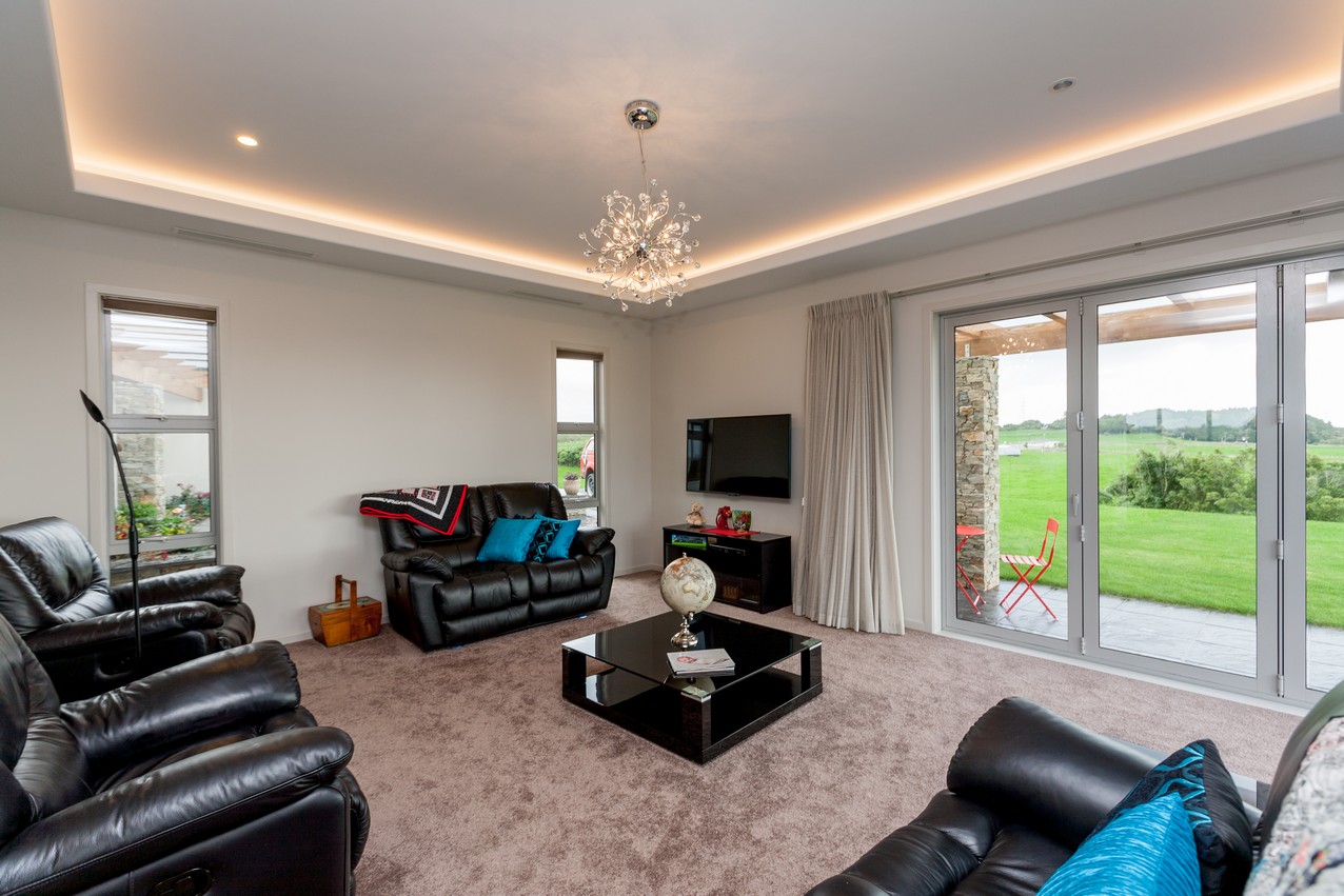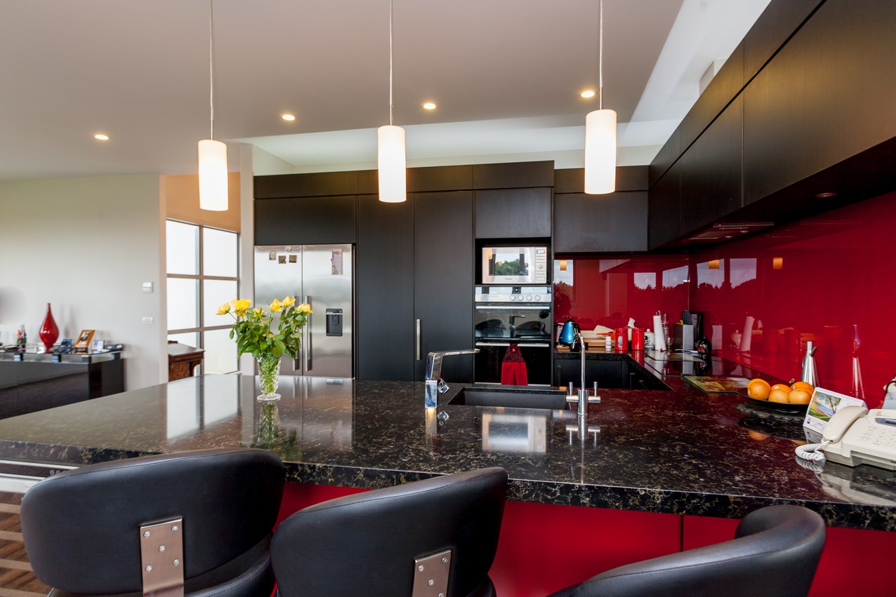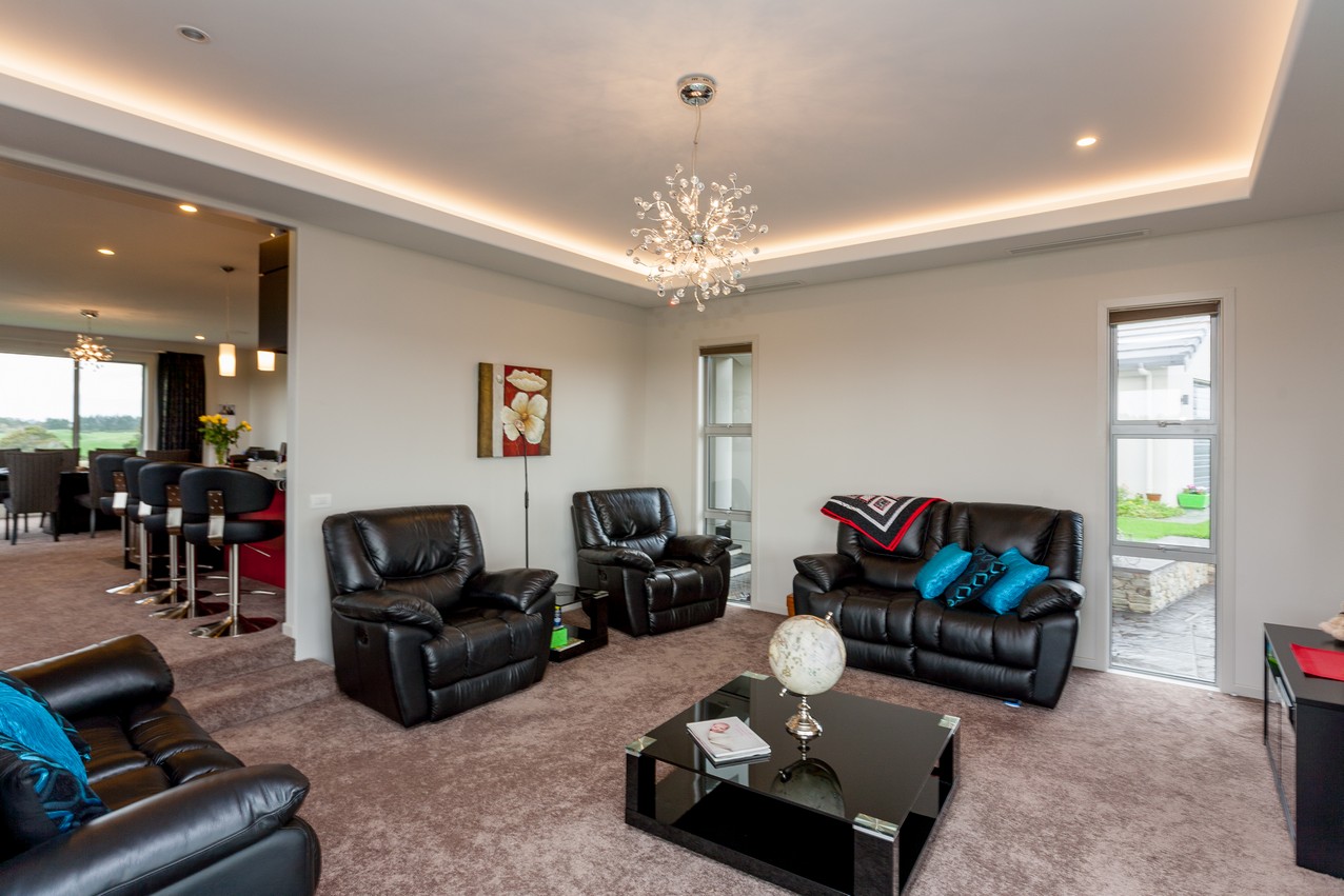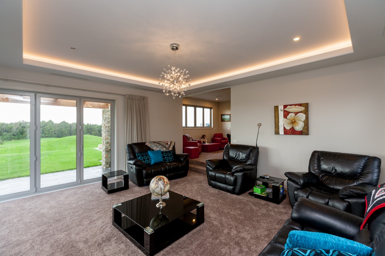 A large formal entry leads to open-plan living – a lovely space to prepare lunch while catching up with friends and family. The kitchen design is rich and elegant. A red splashback adds flavour and ties into the island toekick. Refreshments can be stored close at hand in the wine fridge. Large bi-fold doors in the dining area open to a beautiful landscaped alfresco space, where meals can be served in the sunshine. The 3m ceiling is sure to earn a few gasps from guests in the large formal lounge. A scotia conceals LED strip lighting and air-conditioning vents, making this space bright and breezy. The master bedroom boasts a walk-in wardrobe and ensuite. Two of the three remaining bedrooms can be opened to create one large space. Both bathrooms boast fully tiled showers.