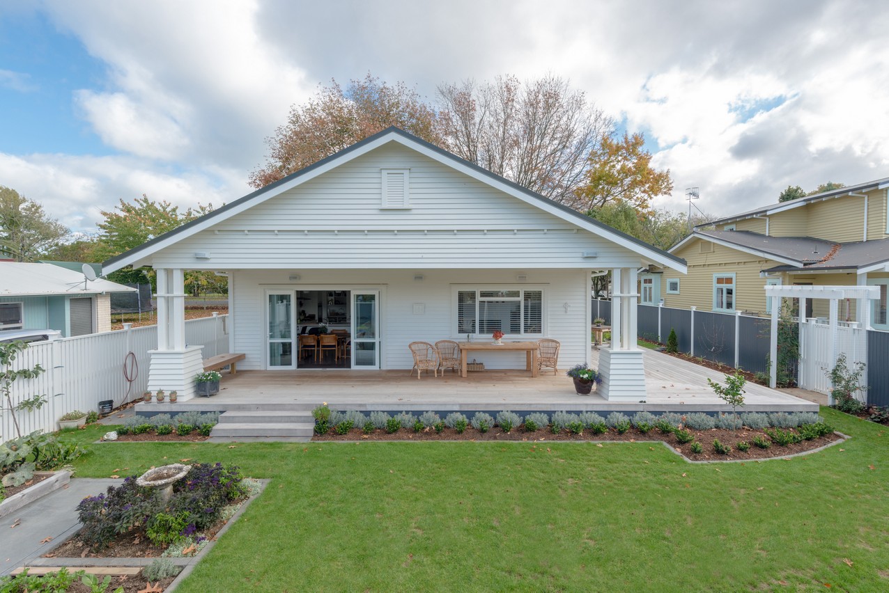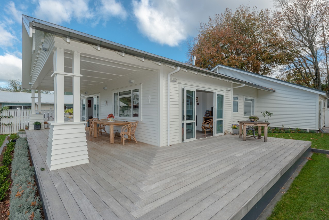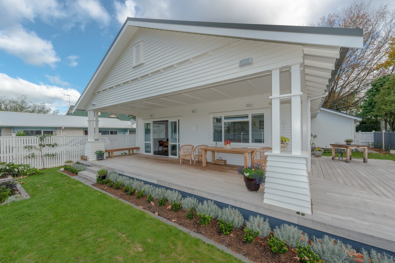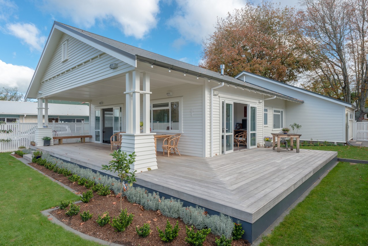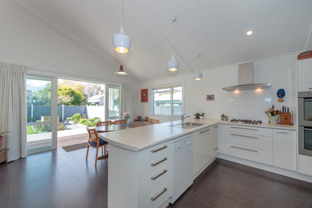 Particular attention has been given to ensure the front porch, soffits, exposed rafters and coverboards are in keeping with neighbouring homes. Cladding, meanwhile, was constructed with a cavity to meet modern-day standards. On entering the three-bedroom home, it’s worth noting the hallway panelling, crafted to maintain equal spacing between the architraves for an authentic heritage look. Windowsills mimic the classic 1930s aesthetic. The doors are solid core with thicker jambs to prevent potential movement; the result is a visually appealing feature. The tongue-and-groove ply and timber battens of the ceiling are also in keeping with the era. Reinforced wing walls in the bathrooms provide a wheelchair-friendly feature; patio doors offer level entry for fluid mobility. Safety features include sensors for low-light conditions. The home is insulated for quiet and warmth.
