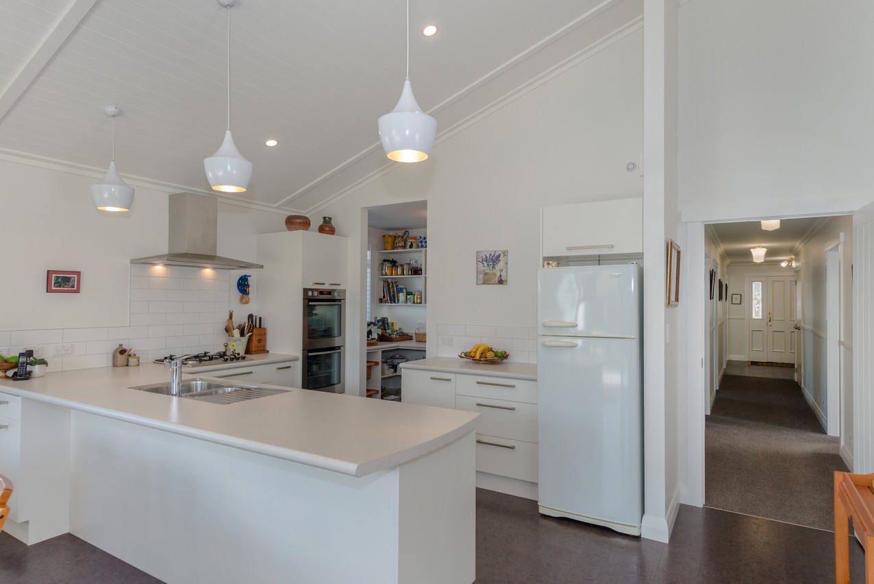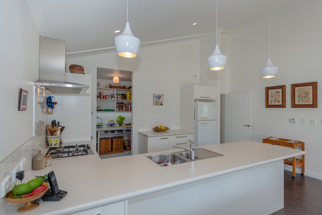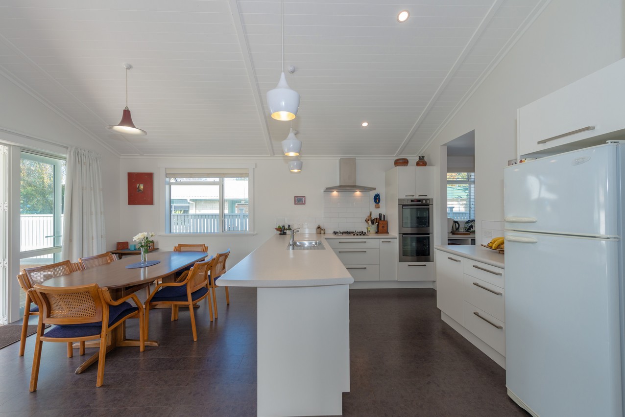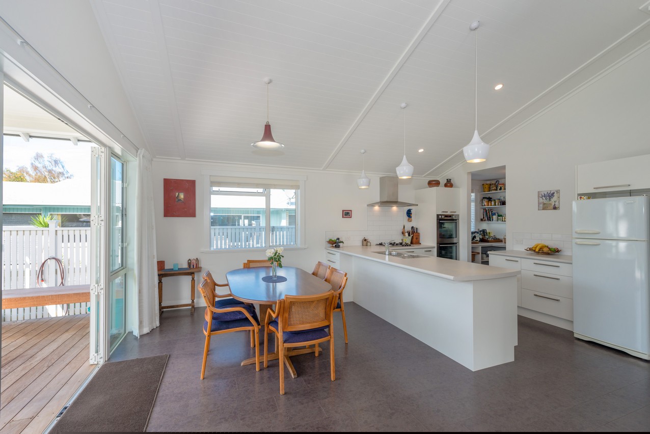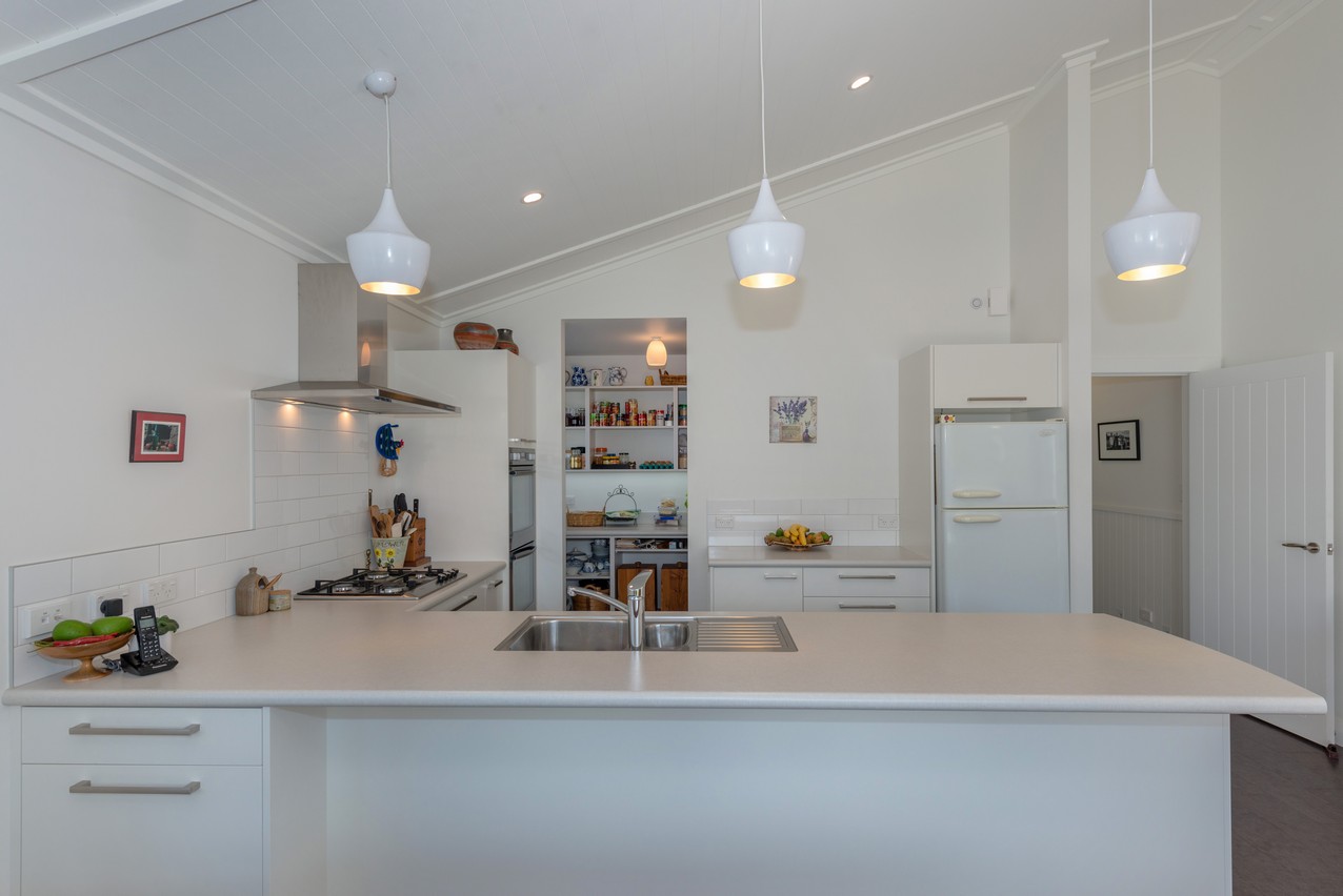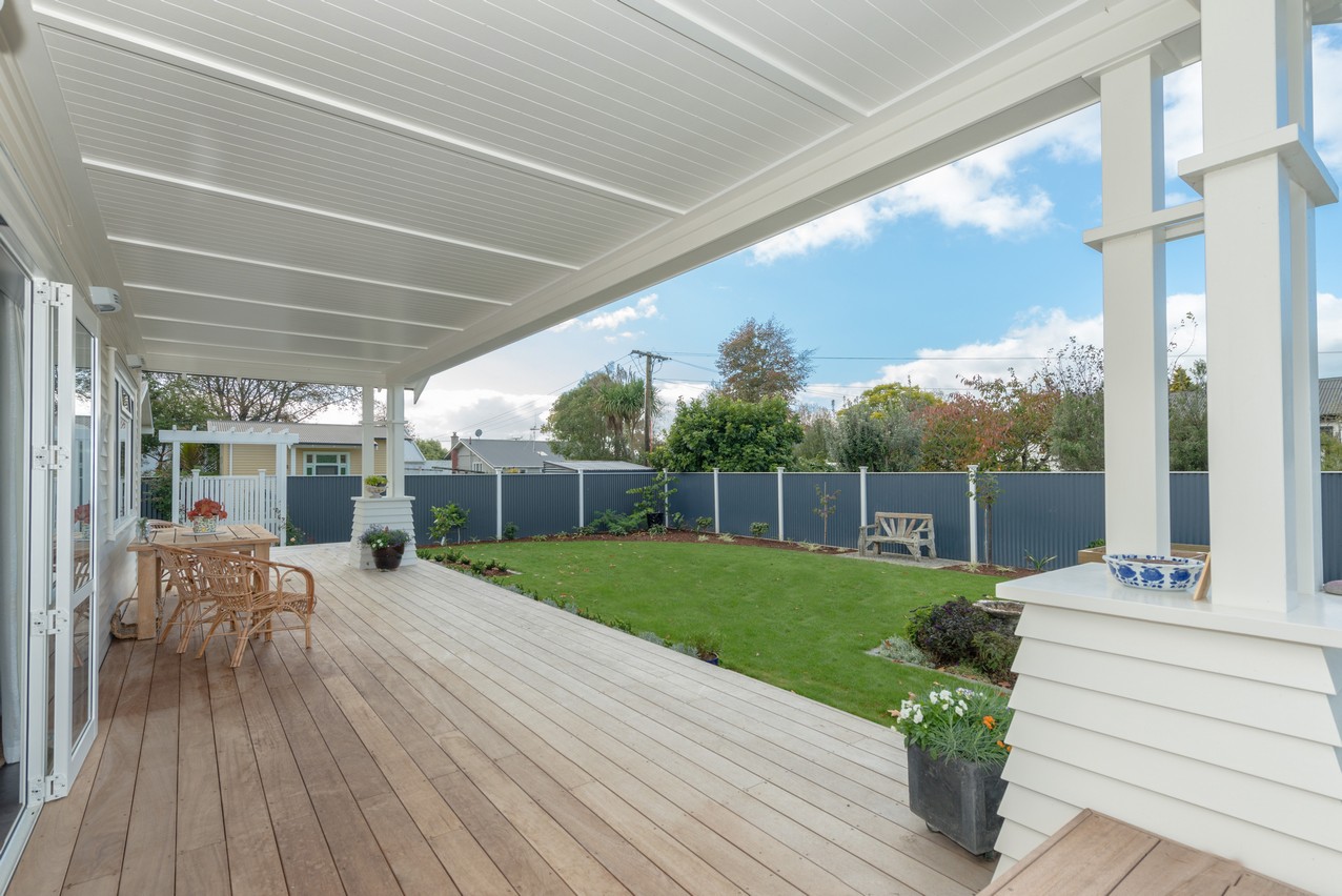 Particular attention has been given to ensure the front porch, soffits, exposed rafters and coverboards are in keeping with neighbouring homes. Cladding, meanwhile, was constructed with a cavity to meet modern-day standards. On entering the three-bedroom home, it’s worth noting the hallway panelling, crafted to maintain equal spacing between the architraves for an authentic heritage look. Windowsills mimic the classic 1930s aesthetic. The doors are solid core with thicker jambs to prevent potential movement; the result is a visually appealing feature. The tongue-and-groove ply and timber battens of the ceiling are also in keeping with the era. Reinforced wing walls in the bathrooms provide a wheelchair-friendly feature; patio doors offer level entry for fluid mobility. Safety features include sensors for low-light conditions. The home is insulated for quiet and warmth.