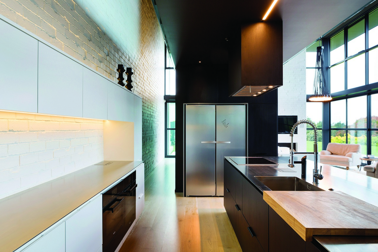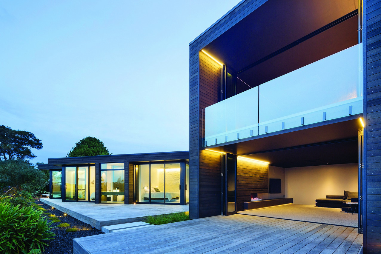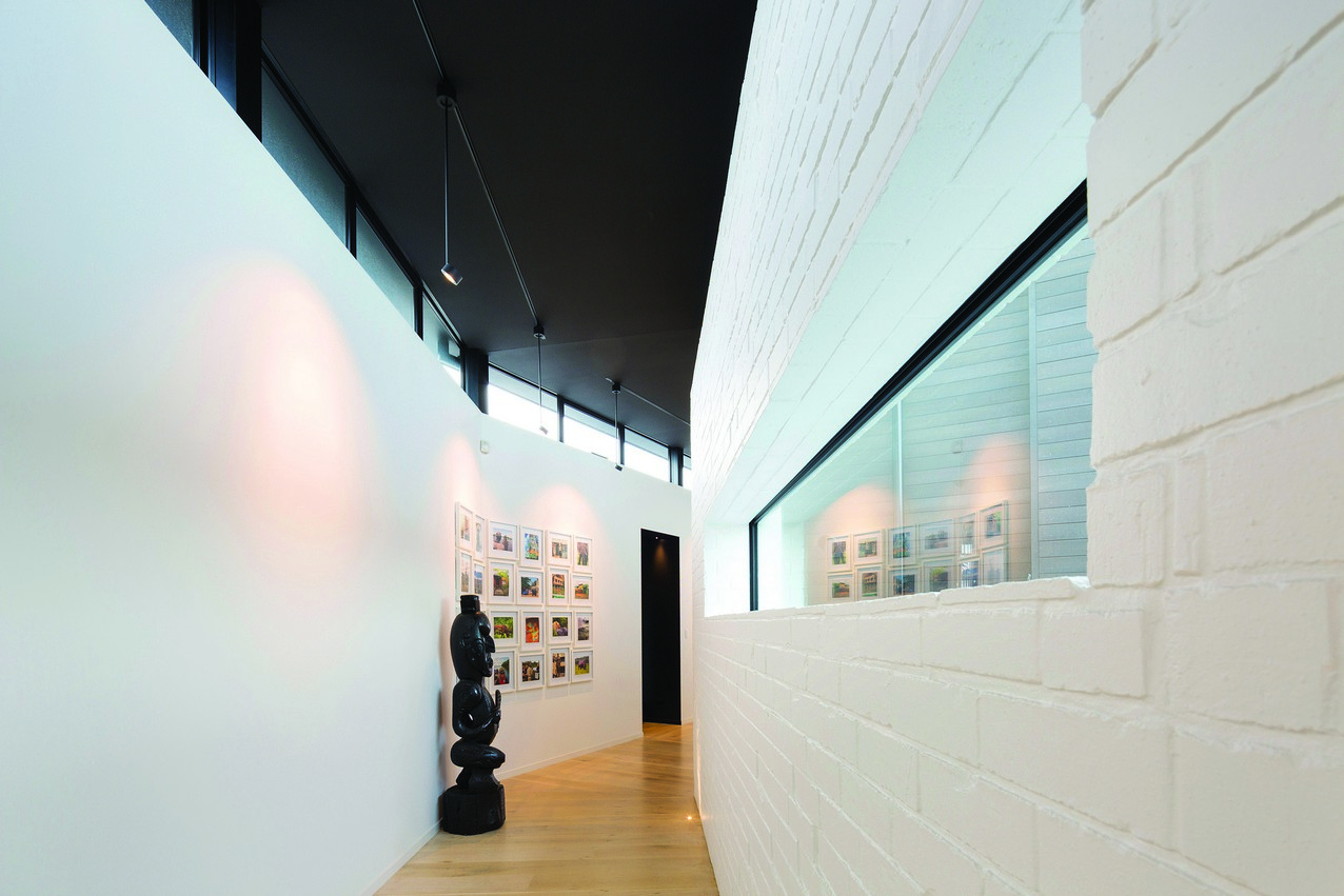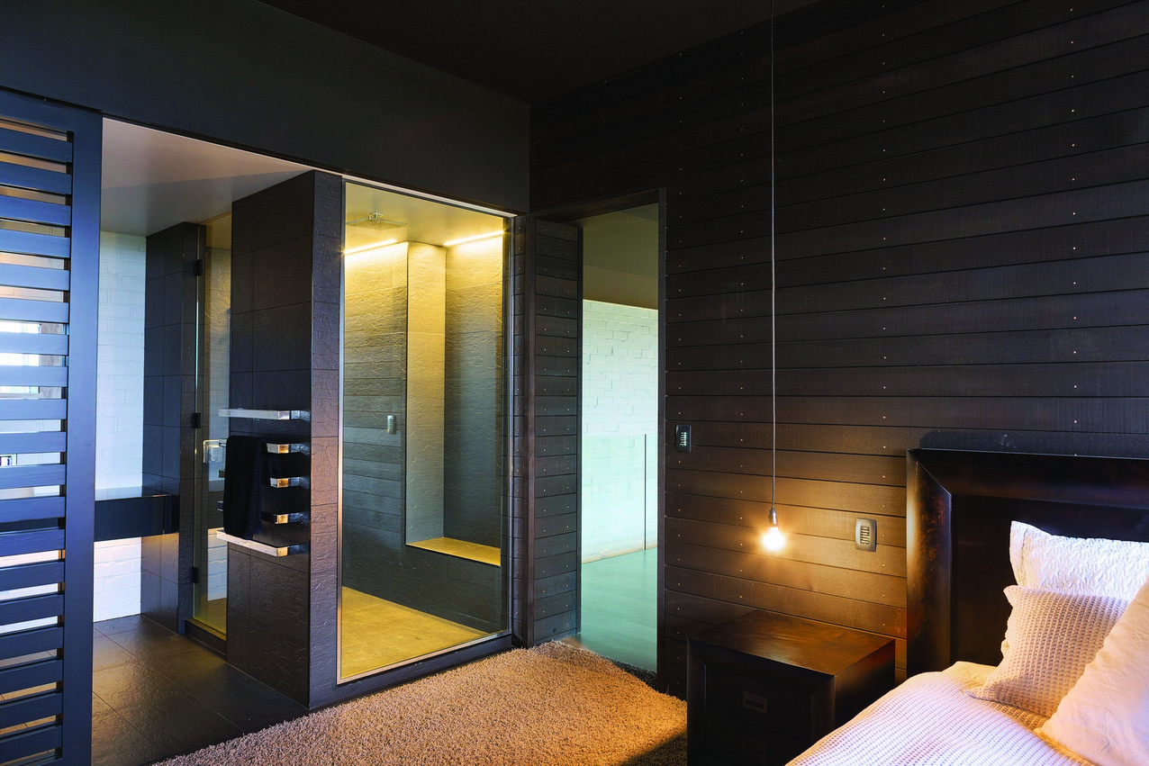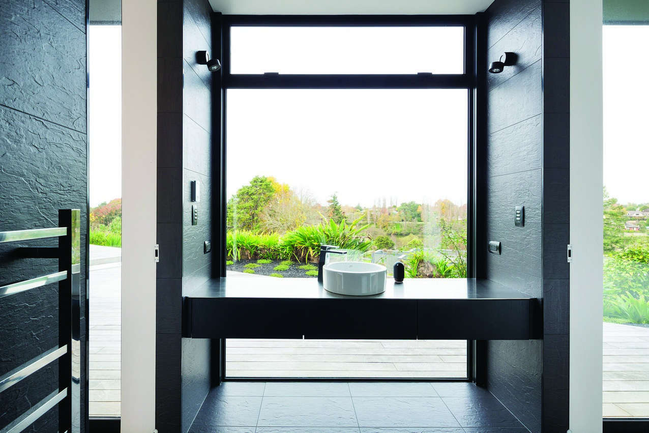 The perfect lines of the black stained cedar garages merge seamlessly with the rest of the exterior, juxtaposed, to striking effect, against a white brick-clad wall. A bold pivoting door swings back to reveal an extension of the white wall coursing through the hallway to the gallery. Before you slide back the signature barn door and set foot inside “the loft”, it might pay to inhale deeply – the light-filled open-plan living space, with 5m-high glass walls, is breathtaking. Enviable views look over a golfing green to the Waikato River. Each space in this four-bedroom, three-bathroom home enjoys its share of the sweeping vista. In the kitchen, stainless steel countertops add an unexpected industrial elegance. Indoor-outdoor flow through moving walls provides a warm welcome and sense of informality not often associated with state-of-the art living.