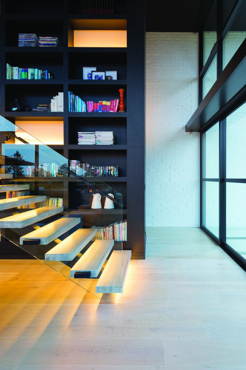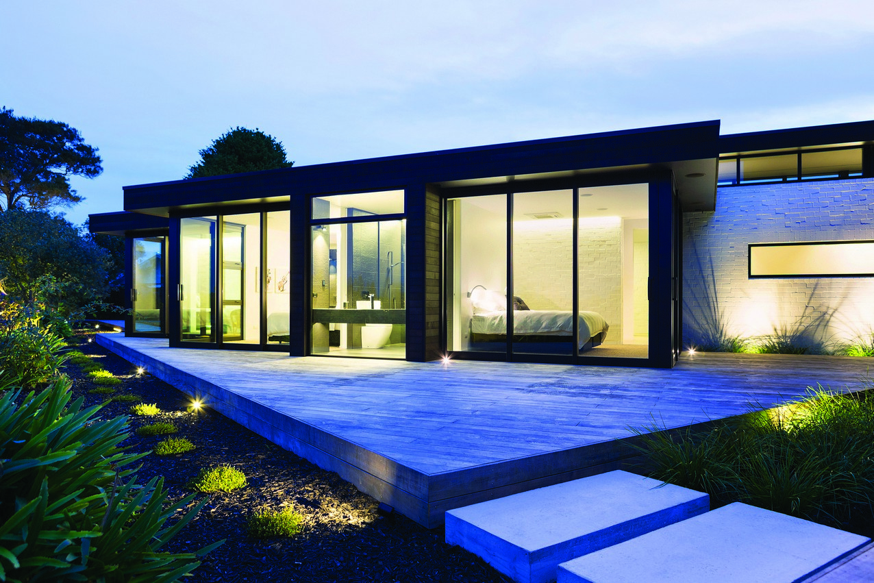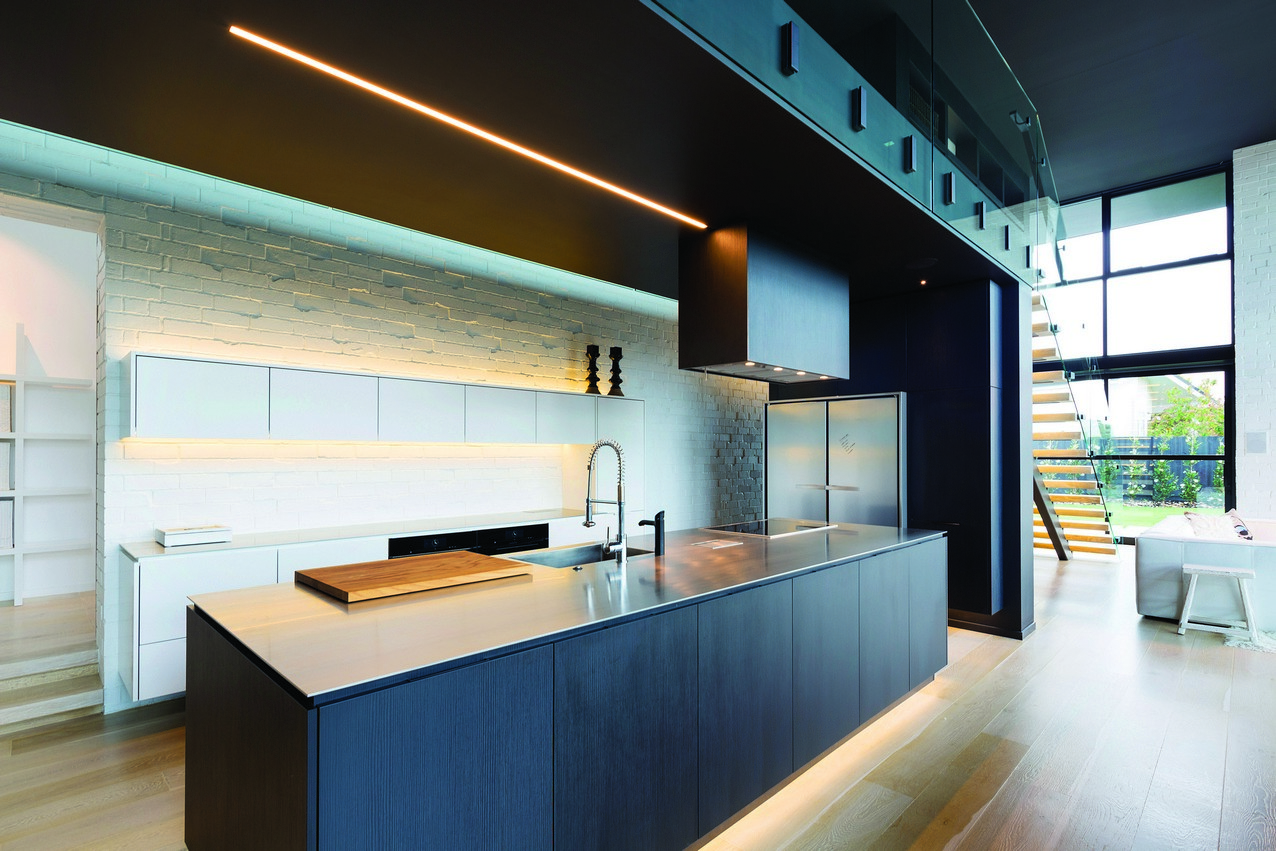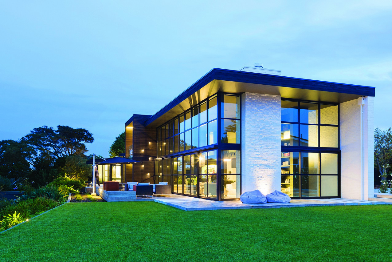 The perfect lines of the black stained cedar garages merge seamlessly with the rest of the exterior, juxtaposed, to striking effect, against a white brick-clad wall. A bold pivoting door swings back to reveal an extension of the white wall coursing through the hallway to the gallery. Before you slide back the signature barn door and set foot inside “the loft”, it might pay to inhale deeply – the light-filled open-plan living space, with 5m-high glass walls, is breathtaking. Enviable views look over a golfing green to the Waikato River. Each space in this four-bedroom, three-bathroom home enjoys its share of the sweeping vista. In the kitchen, stainless steel countertops add an unexpected industrial elegance. Indoor-outdoor flow through moving walls provides a warm welcome and sense of informality not often associated with state-of-the art living.