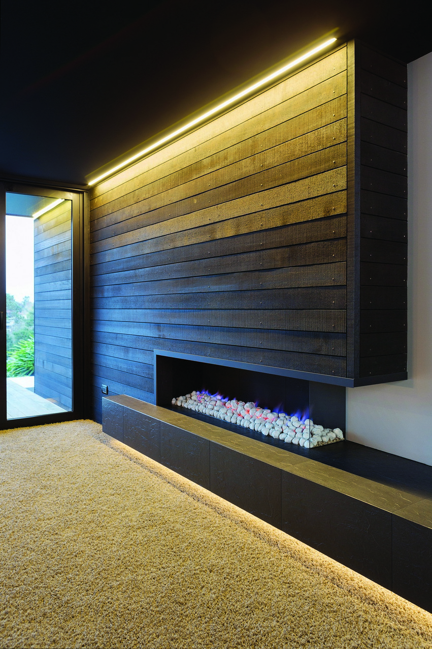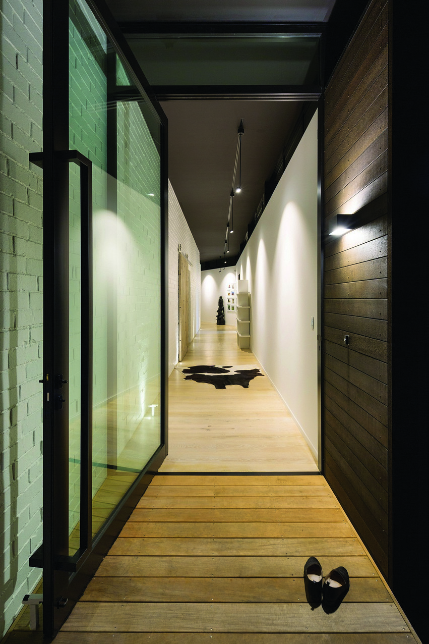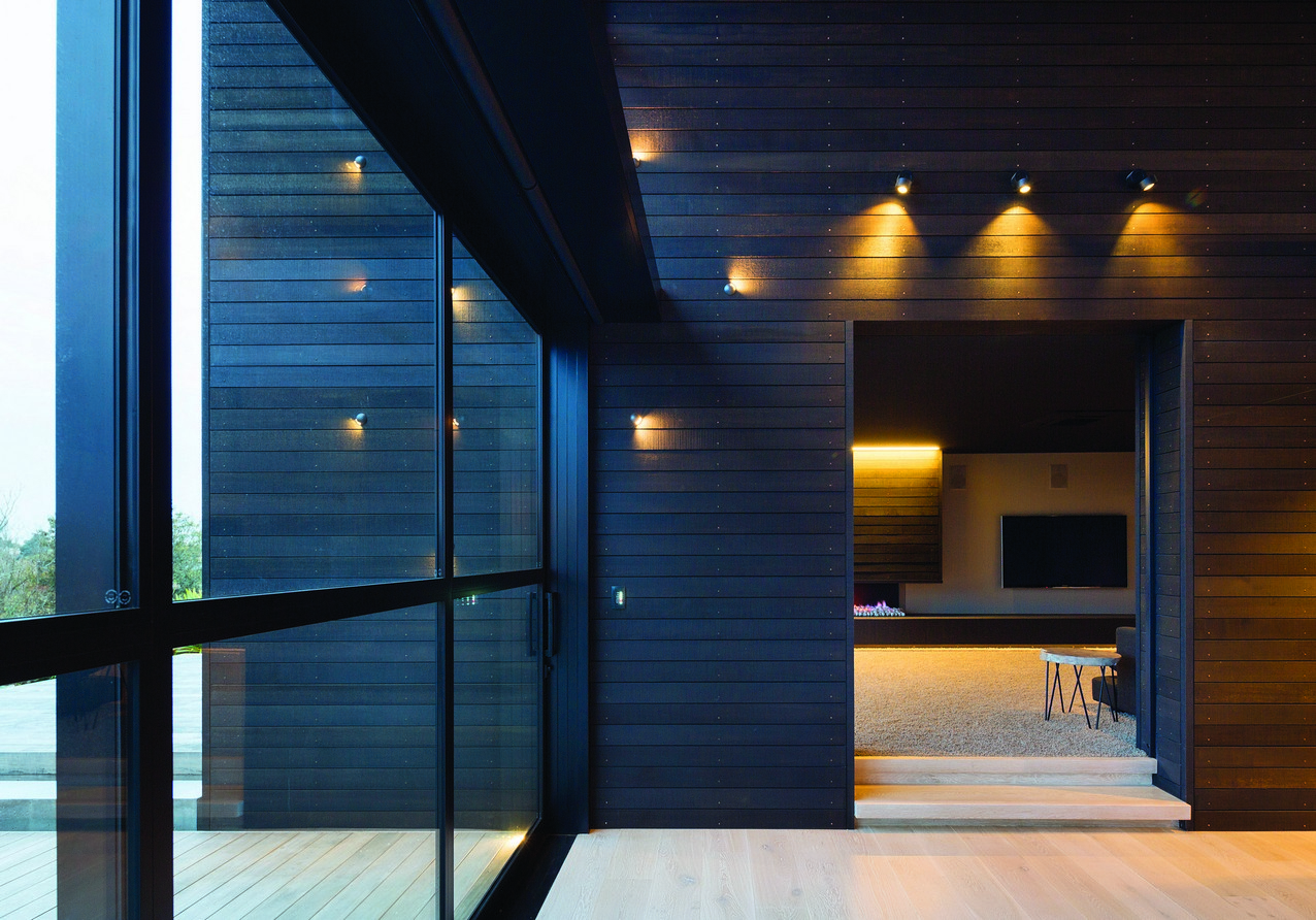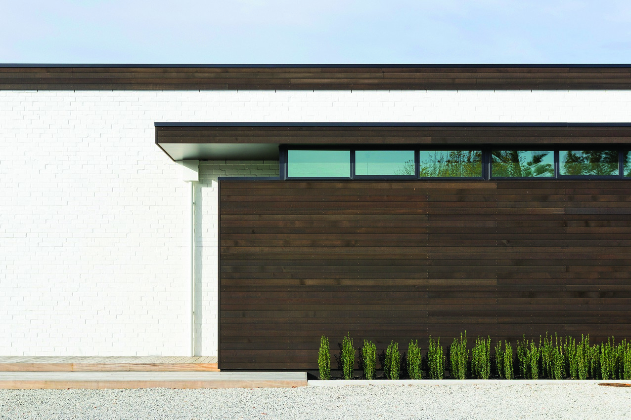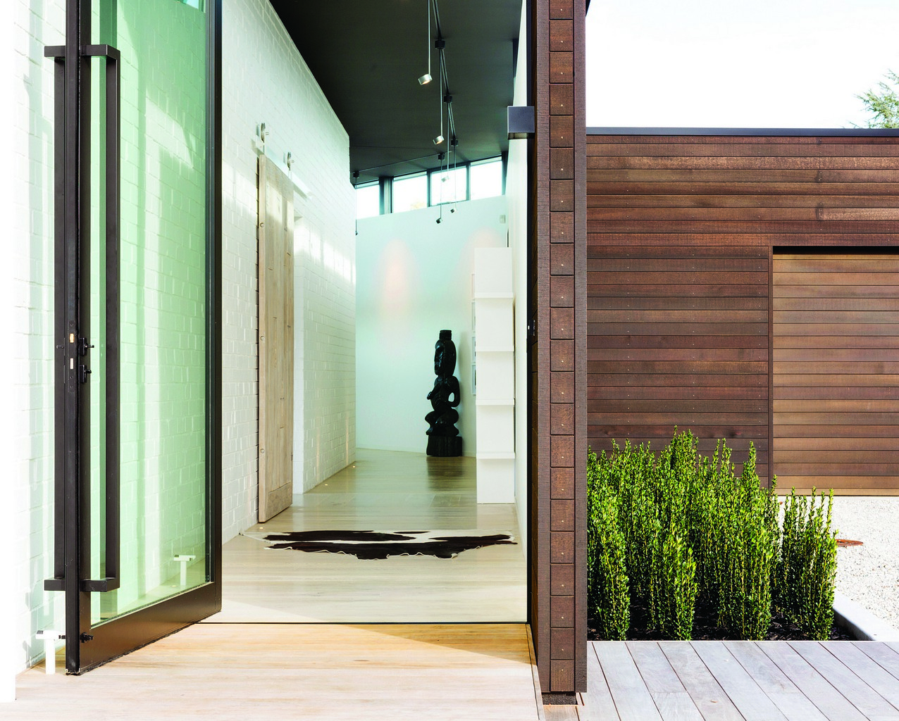The perfect lines of the black stained cedar garages merge seamlessly with the rest of the exterior, juxtaposed, to striking effect, against a white brick-clad wall. A bold pivoting door swings back to reveal an extension of the white wall coursing through the hallway to the gallery. Before you slide back the signature barn door and set foot inside “the loft”, it might pay to inhale deeply – the light-filled open-plan living space, with 5m-high glass walls, is breathtaking. Enviable views look over a golfing green to the Waikato River. Each space in this four-bedroom, three-bathroom home enjoys its share of the sweeping vista. In the kitchen, stainless steel countertops add an unexpected industrial elegance. Indoor-outdoor flow through moving walls provides a warm welcome and sense of informality not often associated with state-of-the art living.